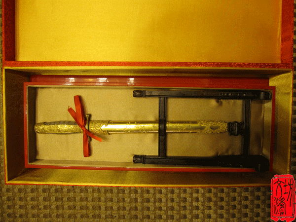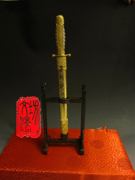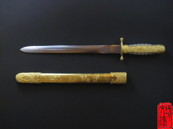 此剑参照中正佩剑与文涛坊古兵器研展馆馆藏精心设计制作总长:36,9厘米材料:自炼土钢与陨铁折叠锻打三静子夜焠火,低温回火后冷煅,使剑更有韧性,经十七道工序纯手工研磨柄装为925白银手工雕刻龙型图腾,柄为白玉缠金丝、、、、、