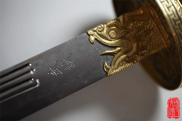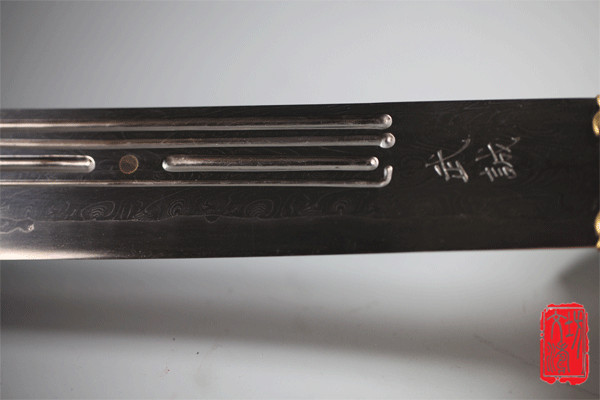此刀参照博物馆馆藏与刘文涛老师精心设计历时六个月之久完工。刀体雄健修长,装具为手工浮雕夔龙纹饰,寓意富贵吉祥。刀身材质为本地自炼土钢与高碳钢经过反复折叠锻打而成的花纹钢,刀刃为马齿嵌钢。经过十七道工序手工精度研磨而成,花纹绚丽多彩,刀身前锋花纹犹如纷飞羽毛,舞落与尘世之间,后锋炫焊纹饰犹如麻花绞丝,刃部花纹犹如山峦起伏连绵不断,三者如(天、地、人、)(佛、道、儒、)遥相呼应给人大美之感。吞口为手工铜雕龙首,造型神态逼真,刀身从龙口喷涌而出,给人威严霸气之感。吞口上方錾刻“武诚”,同时代表了习武之人坚韧不拔、百折不挠的精神秉性。刀身两侧分别开粗细刀槽与分断槽,刀槽形状不一变化多端。刀身镶嵌黄铜七星,寓意天人合一、有周易卦学之意。刀鞘与手柄为名贵紫檀木,为保护刀身内衬为软木,且贴绒布。艺术性与实战性完美结合,此刀专为洪武诚先生订制。