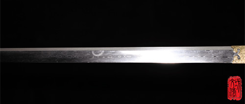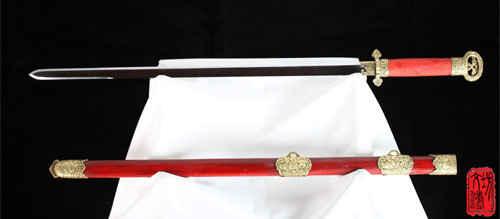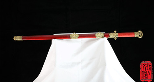 此剑参照唐剑风格与展览馆馆藏精心设计制作而成,历时数月之久完工。装具使用传统,阴刻龙飞凤舞与麒麟等四兽,环绕唐草纹饰,寓意富贵吉祥。剑身材质为高碳钢与自炼土钢折叠锻打花纹钢,子夜淬火,经十七道工序精度研磨而成。鞘包鱼皮上红色大漆,整体华丽大气。反映了盛唐时期文化的精髓,属文涛坊精品。