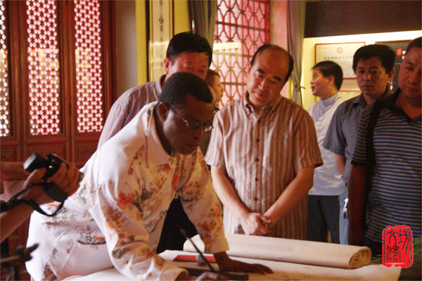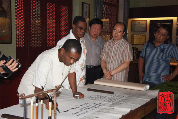 尼日利亚文化中心主任乌马乌可吉——克利福特 参观文涛坊古兵器博物馆 并题字
