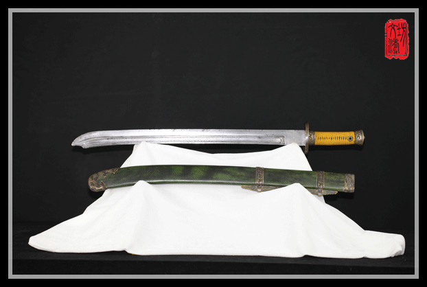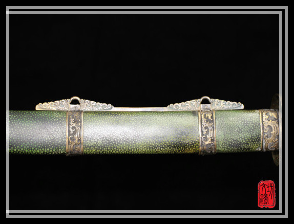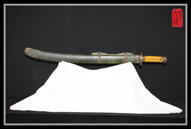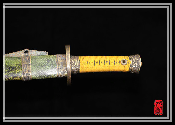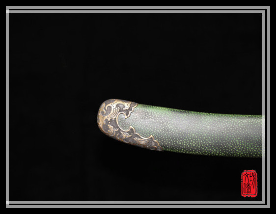 修复后:鞘:包珍珠鱼皮上墨绿色大漆,经反复对色更显古朴;