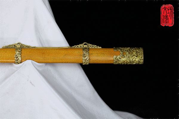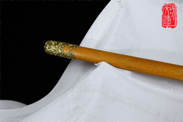 紫光檀木做手柄,鱼皮做鞘,好像有点不搭。个人不喜欢这种搭配!