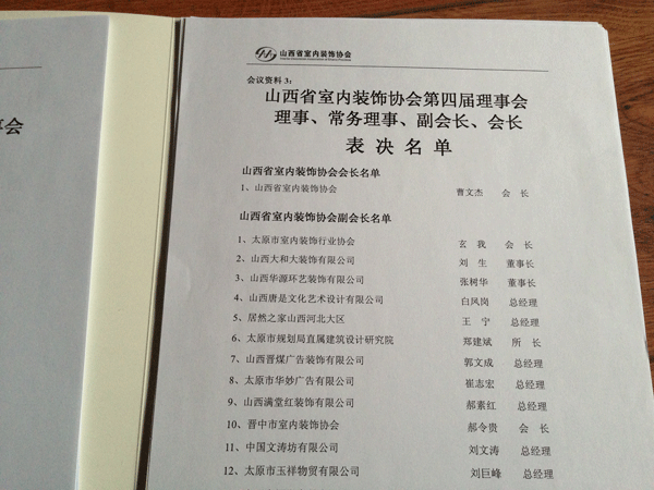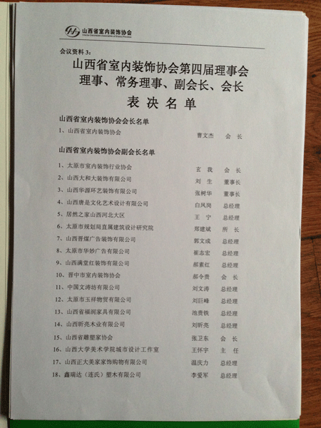 2012年12月21日山西省室内装饰协会第四届理事会在万达文华酒店隆重举行。我公司被授予为山西省室内装饰协会副会长单位。