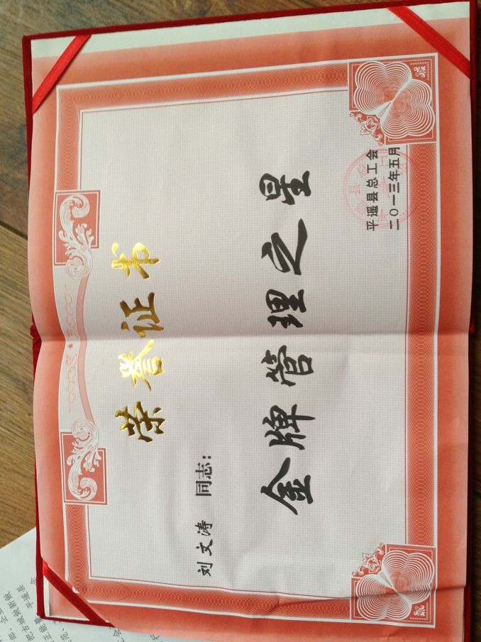 刘文涛同志荣获"金牌管理之星"称号!