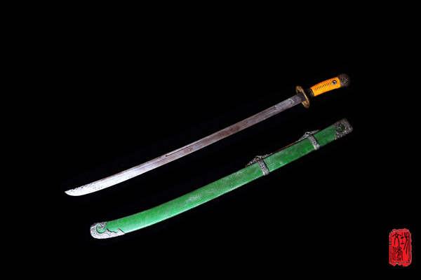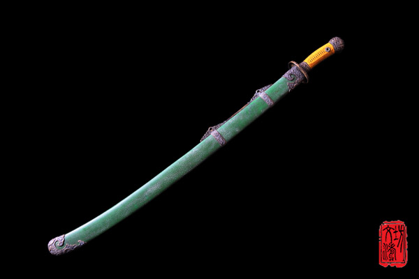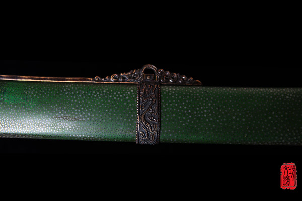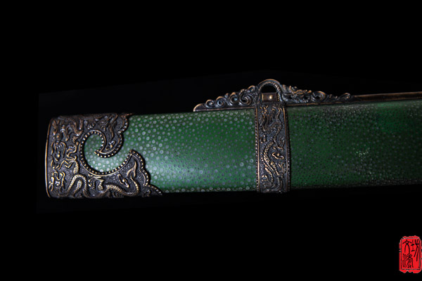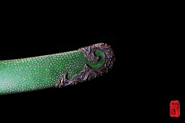 修复 鞘:包珍珠鱼皮上墨绿色大漆;