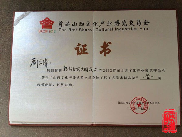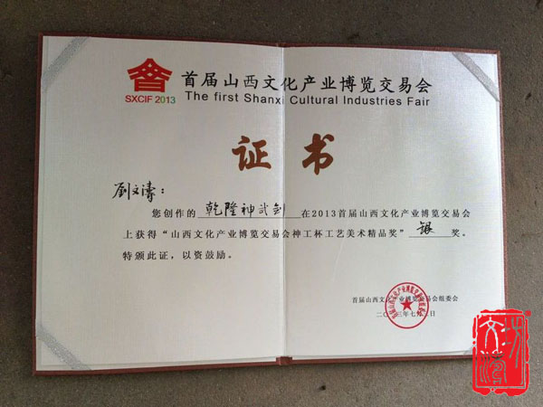 山西省首届文博会、在昨天胜利闭幕;荣幸获得神工杯~~~大阅佩刀荣获金奖~神武剑荣获银奖!可喜可贺!