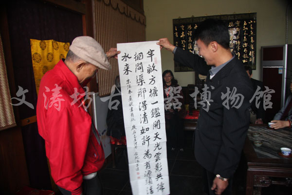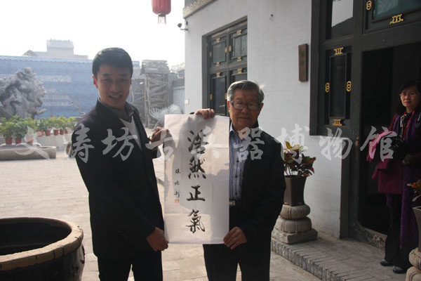 10月27日,中华大汉书艺协会理事长陈克谦、台北市长春书画学会理事长陈培新等一行参观文涛坊古兵器博物馆,并留墨宝“浩然正气”、《观书有感》。