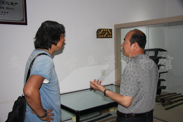 鞠导在我馆参观时对馆内的古兵器藏品表现出浓厚的兴趣,他说:此时此地,我上了一节生动的关于古兵器文化的历史课,看到件件富有时代特征及地域特色的活标本,仿佛让我穿越到了古代,持戟佩剑,驰骋疆场!如果之前能够早点接触刘文涛先生和他的文涛坊的话,那么在我导演的诸多武侠影片中,兵器这一方面,定位会更加准确,素材会更加生动,历史性当然会更强!希望在今后的工作中我们会携手同行,为社会做出更多优秀作品!