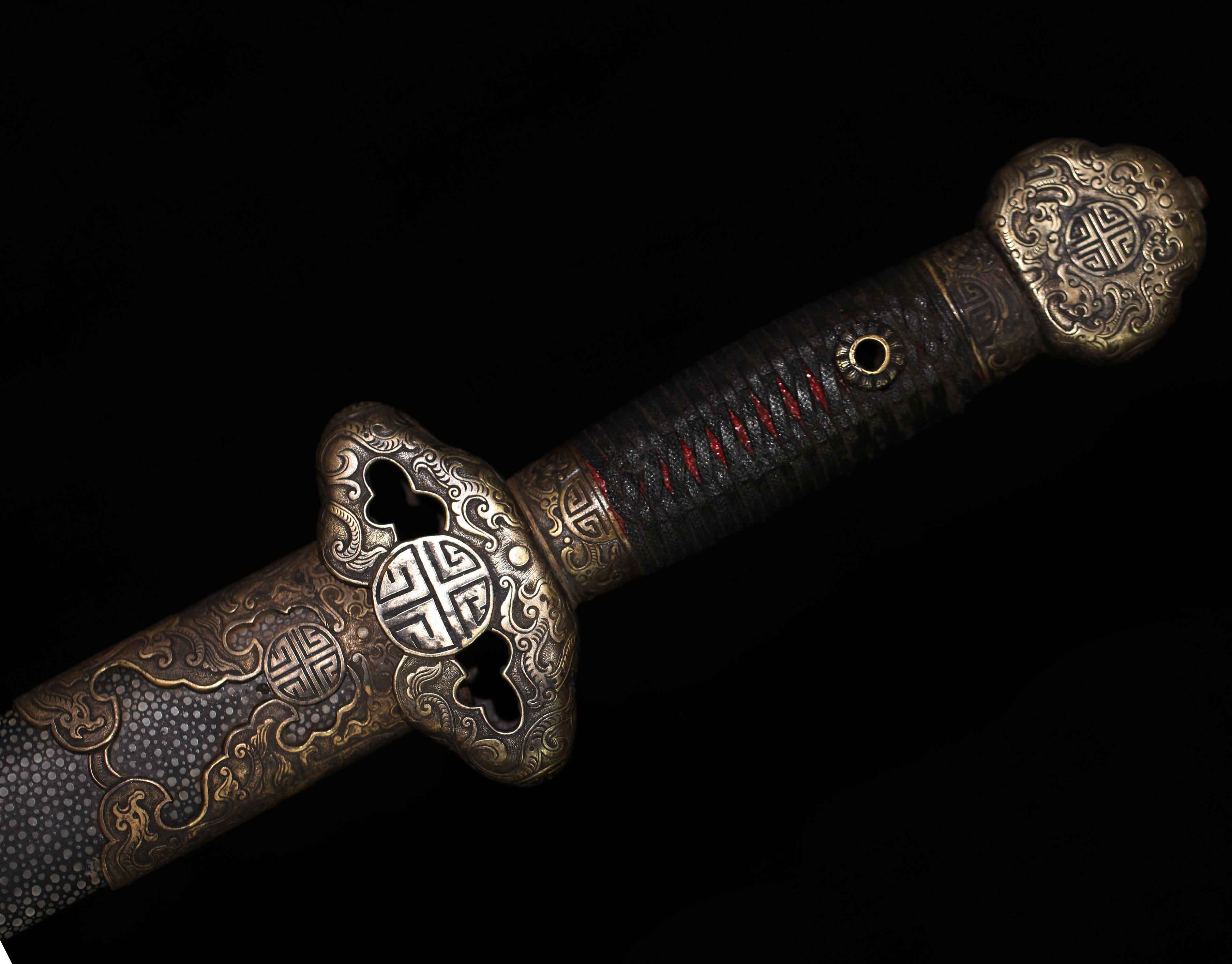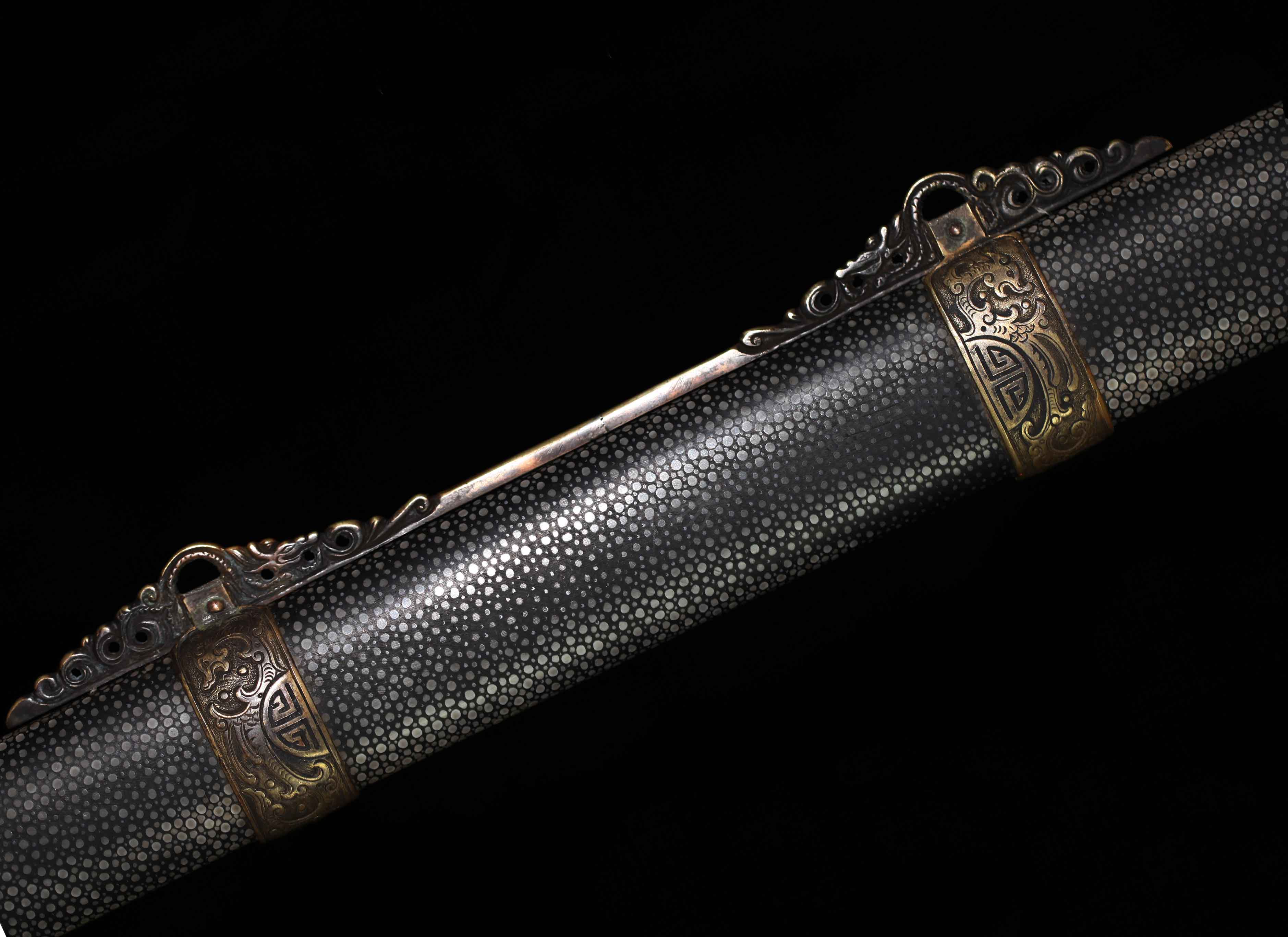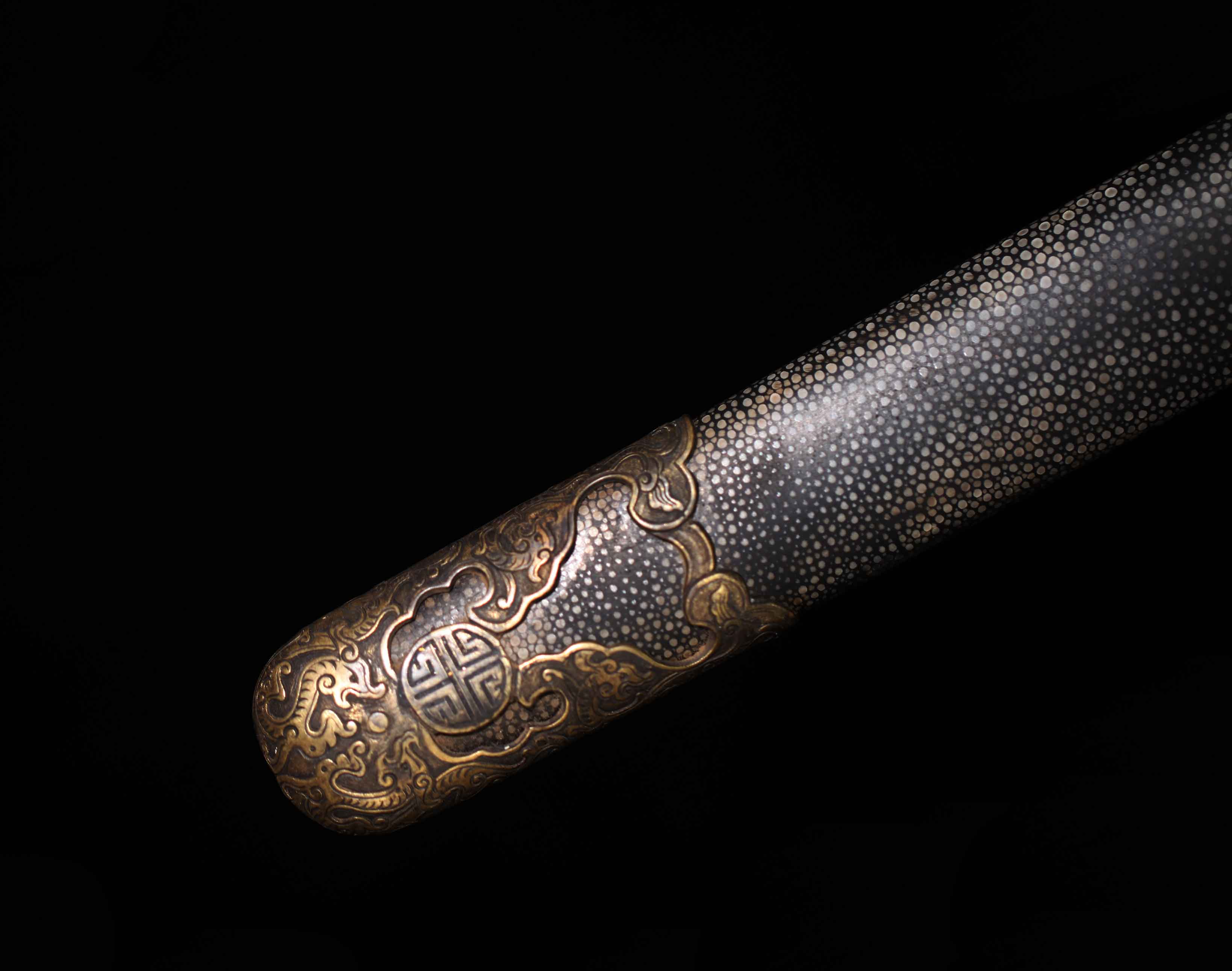 鞘尾做福寿装。。。。。剑鞘包珍珠鱼皮,上灰黑色漆