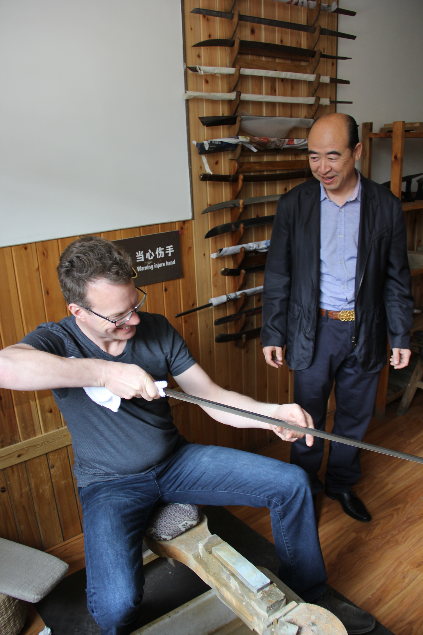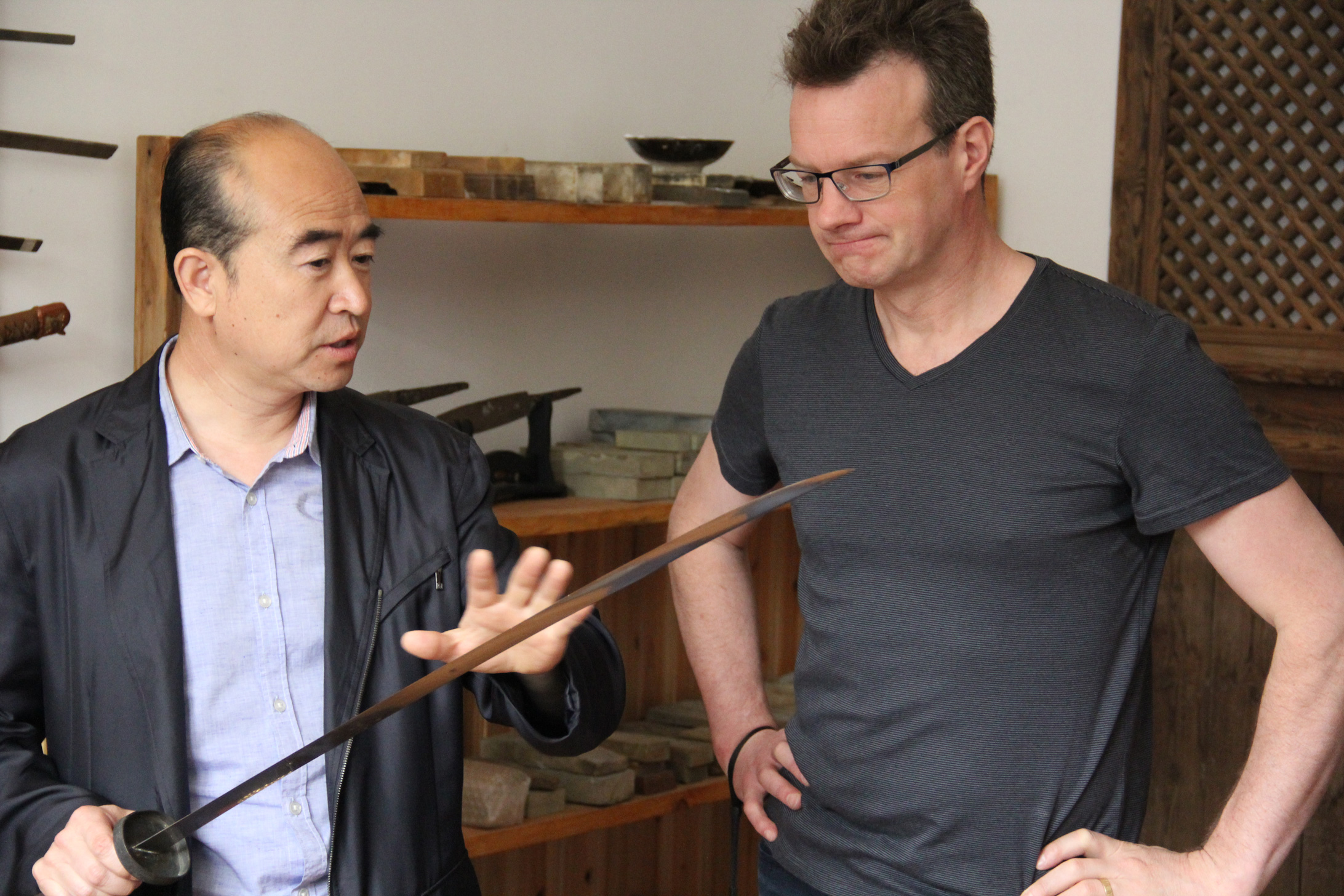 大山老师在刘文涛馆长的陪同下,对我馆的非遗展区到抗战展区进行了穿越式参观。不时与刘文涛老师进行交流学习,在参观刀剑研磨室时,大山对研磨产生了浓厚兴趣,详细了解研磨过程并进行了亲身体验,感慨刀剑的制作不易,对古兵文化的博大精深赞不绝口