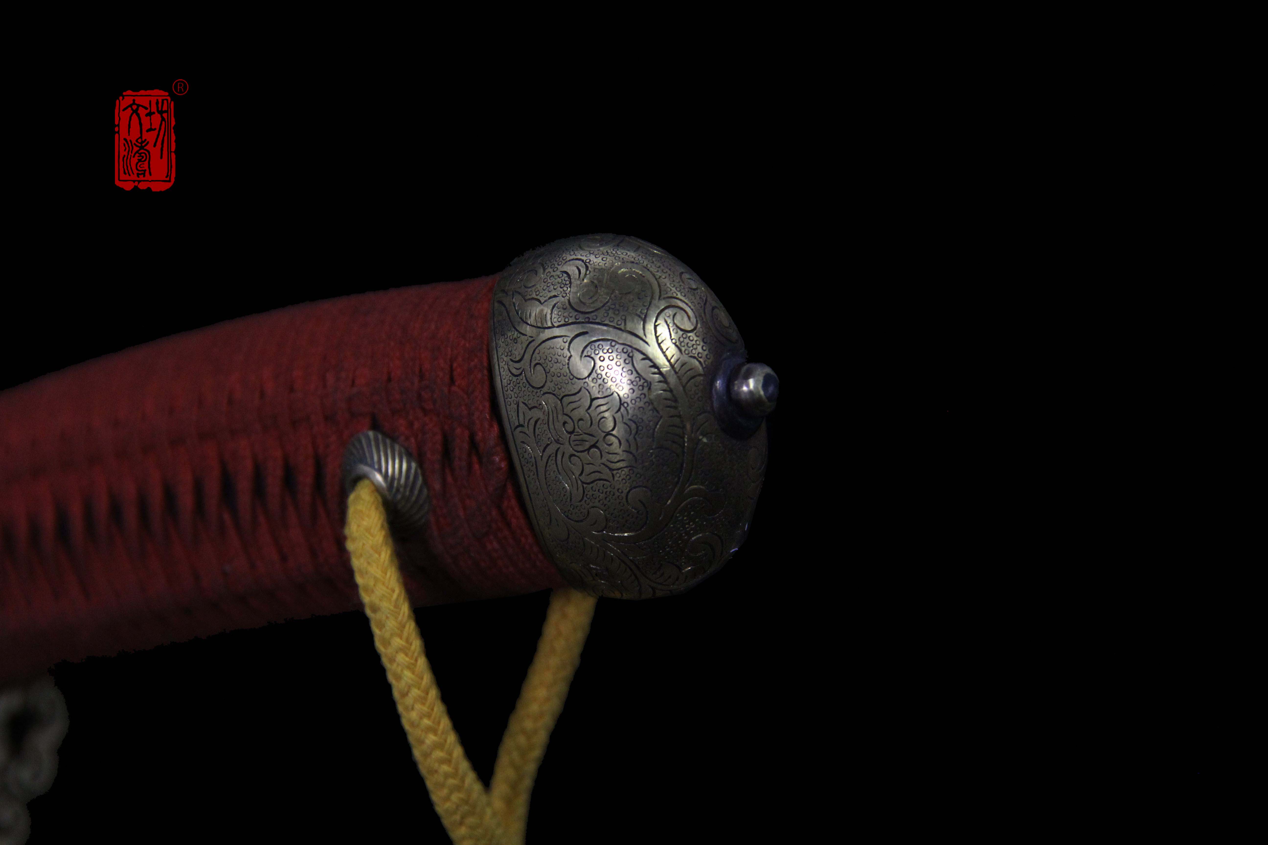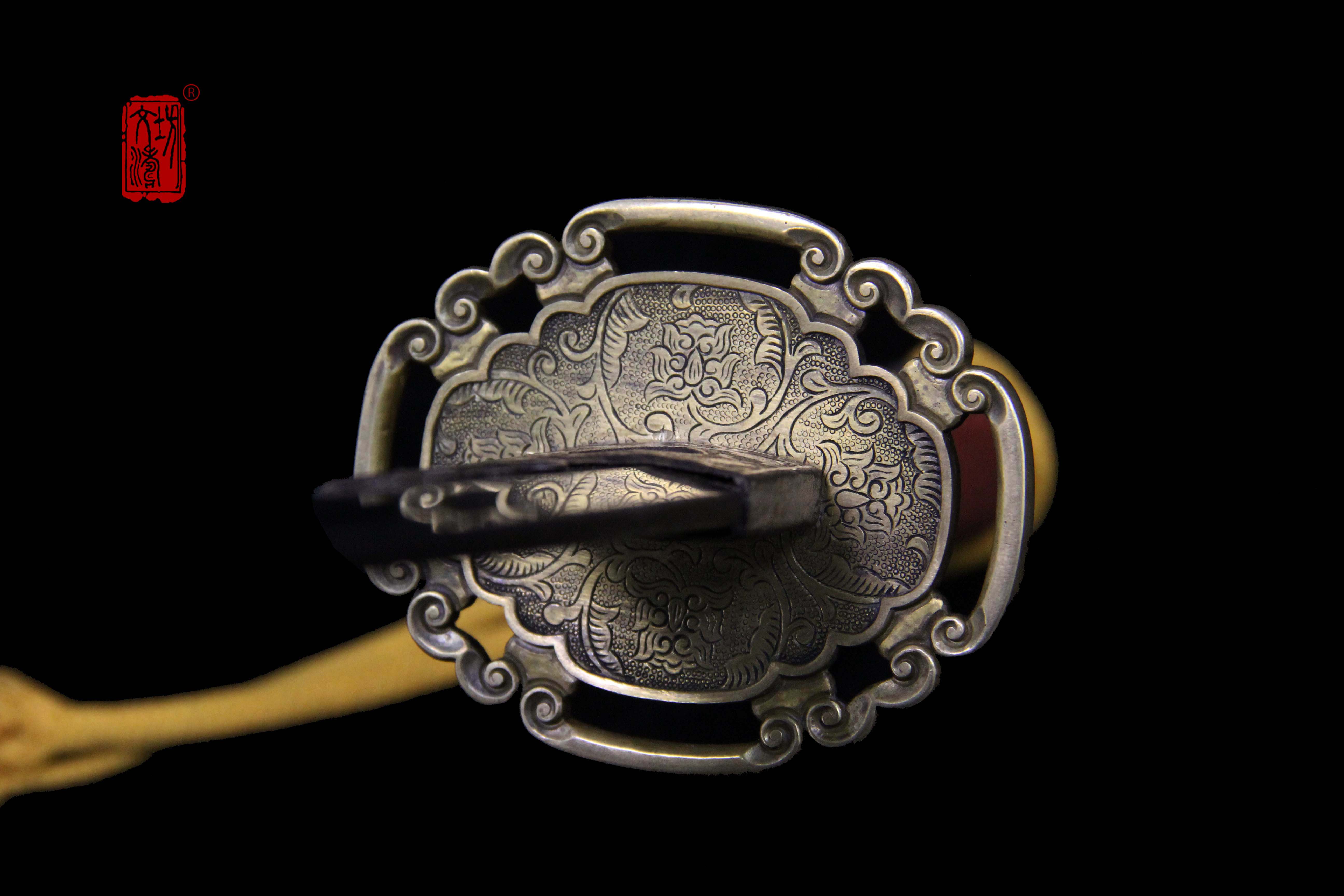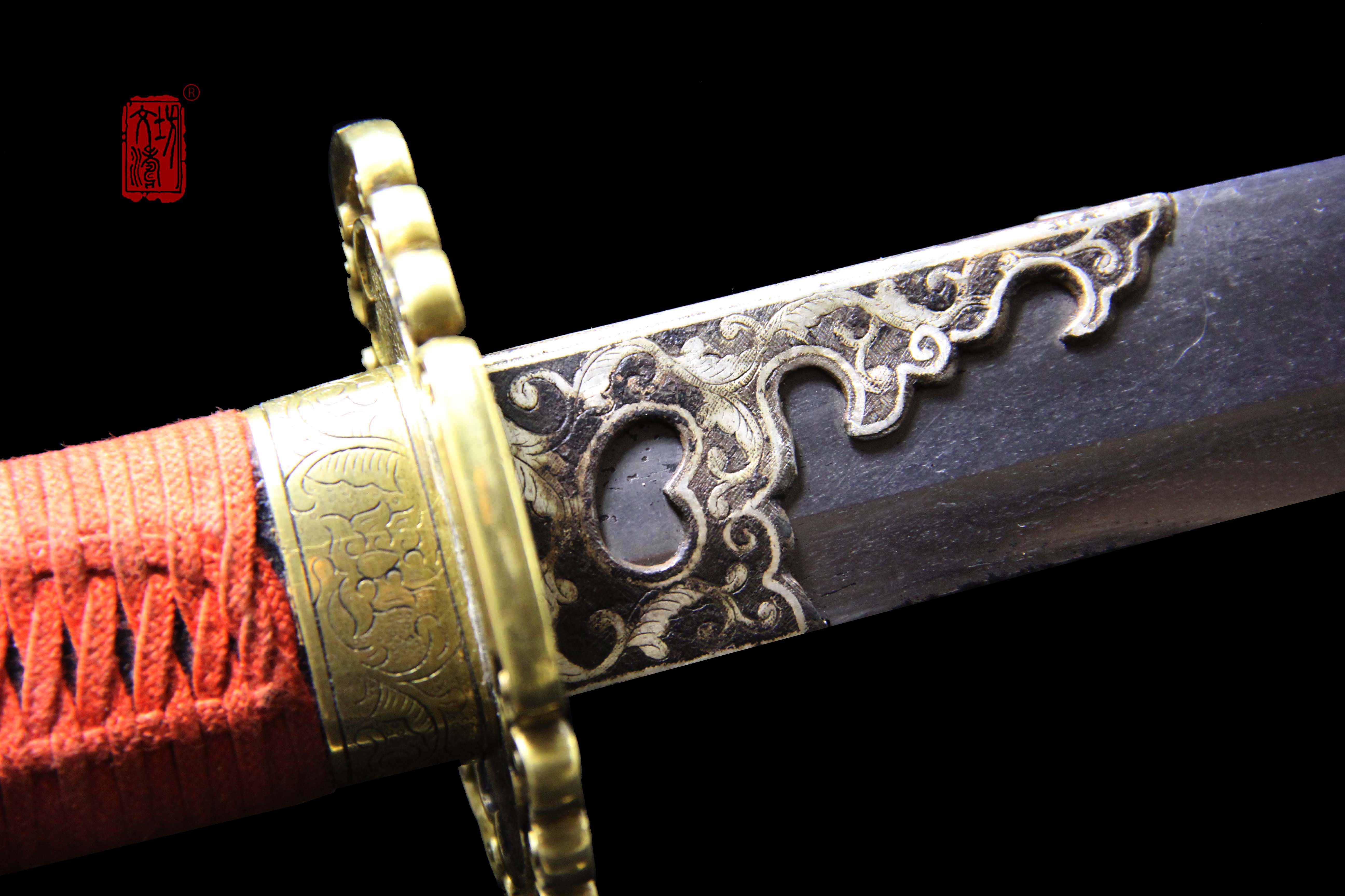 装具按照明代风格配装,全装做阴刻缠枝宝相花纹饰,手工雕刻、线条柔和、生动细腻,整装做旧更显古韵。刀卡为铁鋄银,刀鞘按照传统明饰,披布披灰,刷黑大漆,体现髹漆技艺,手柄包老皮、缠绳、卯花。