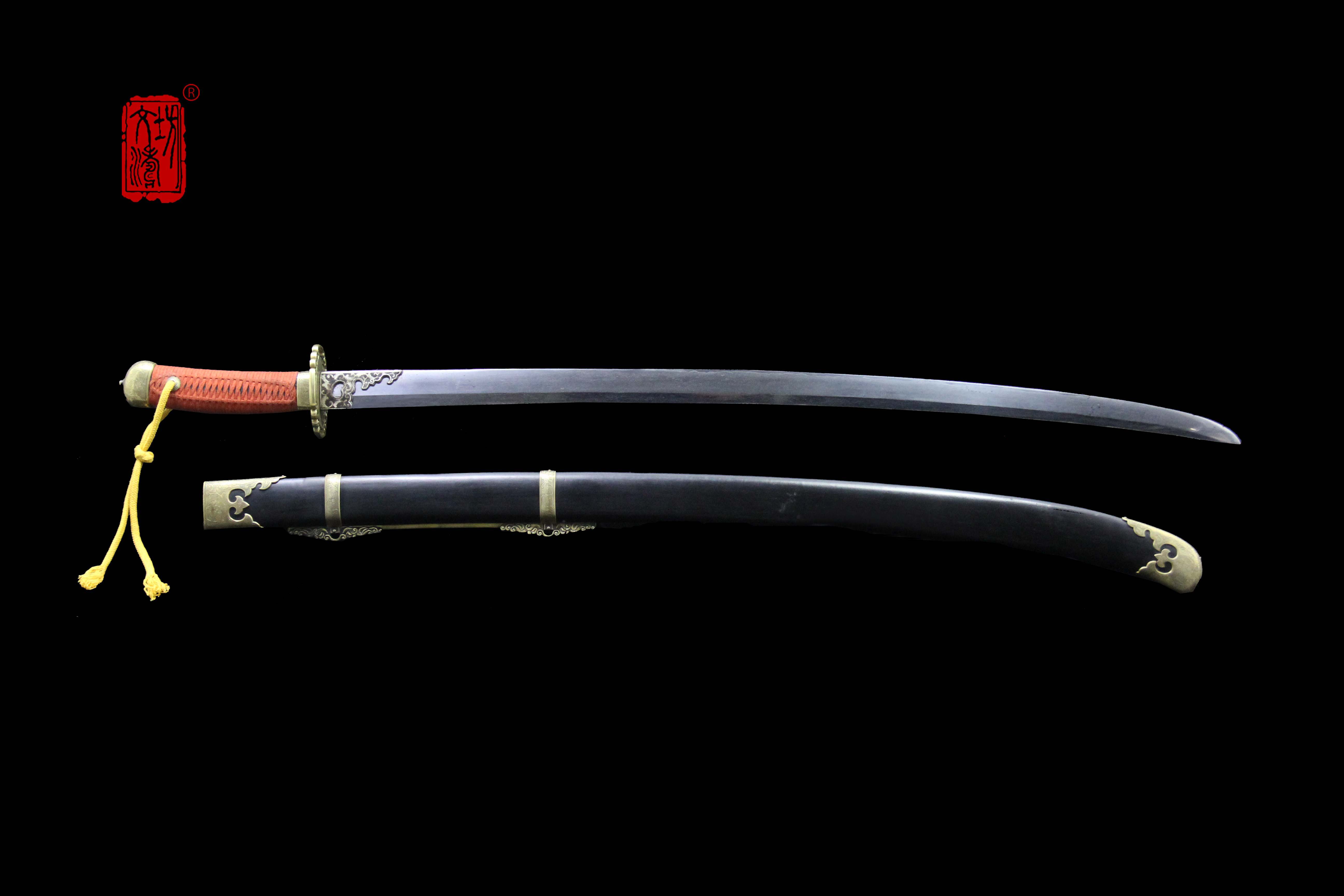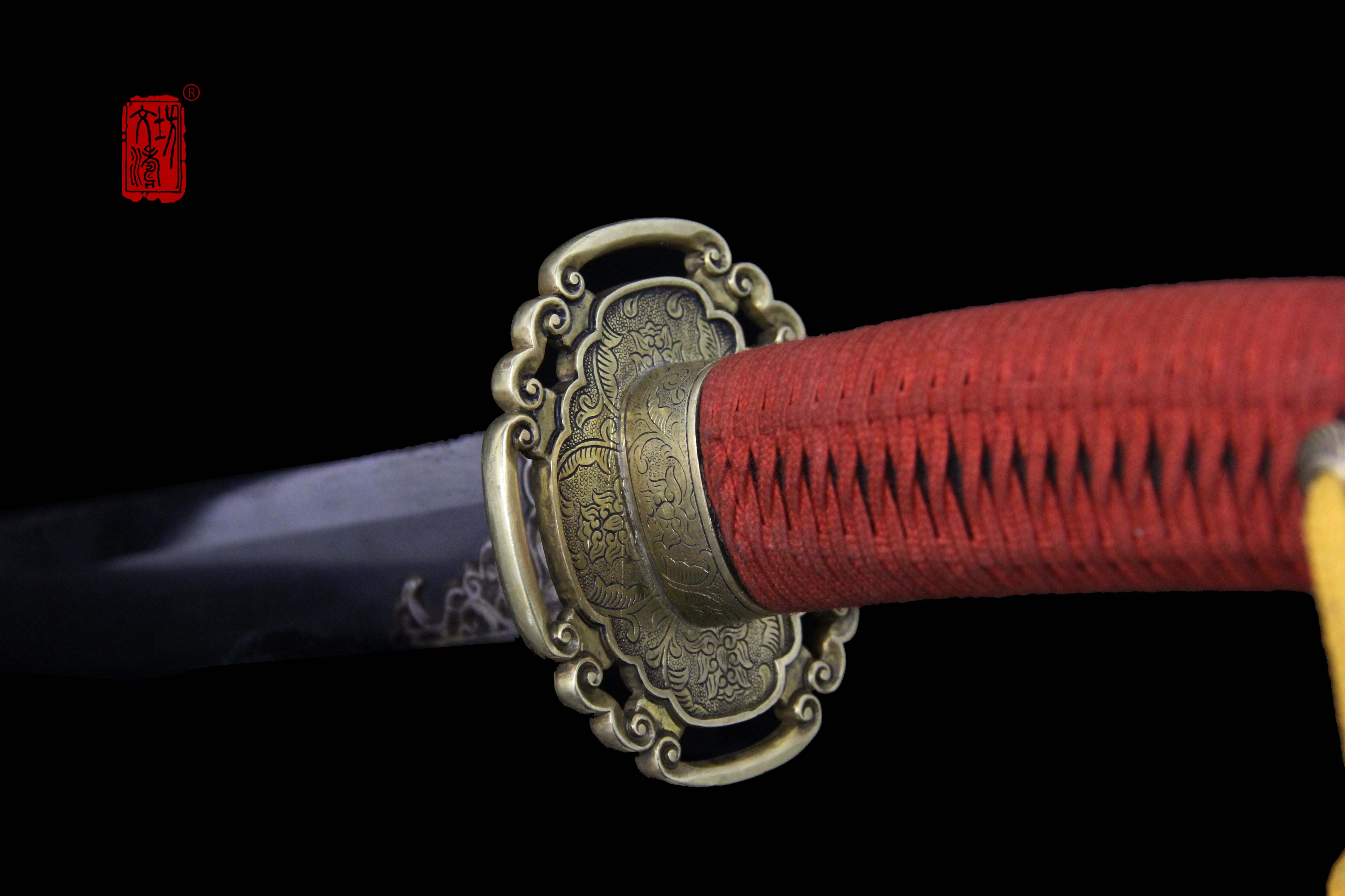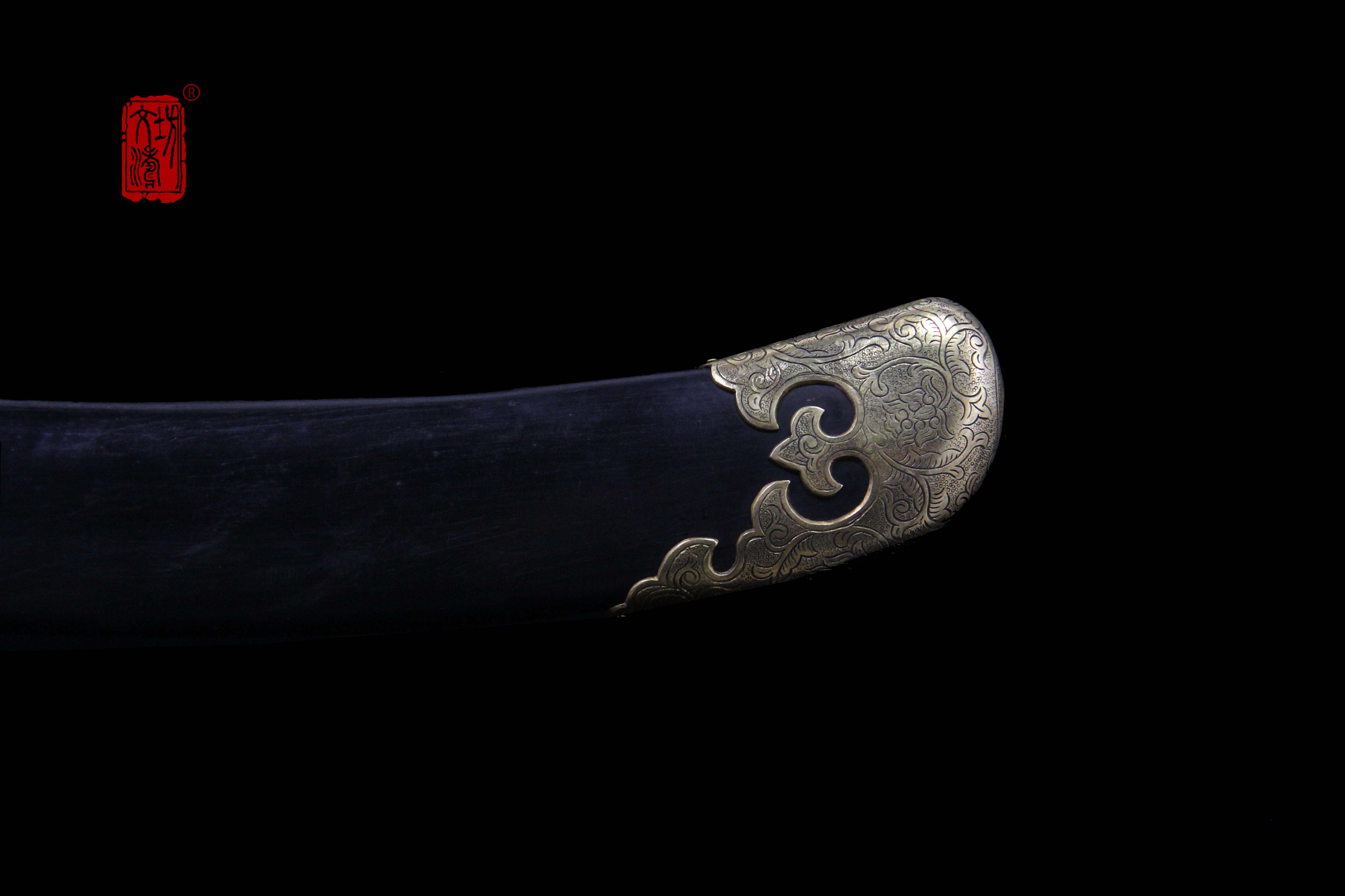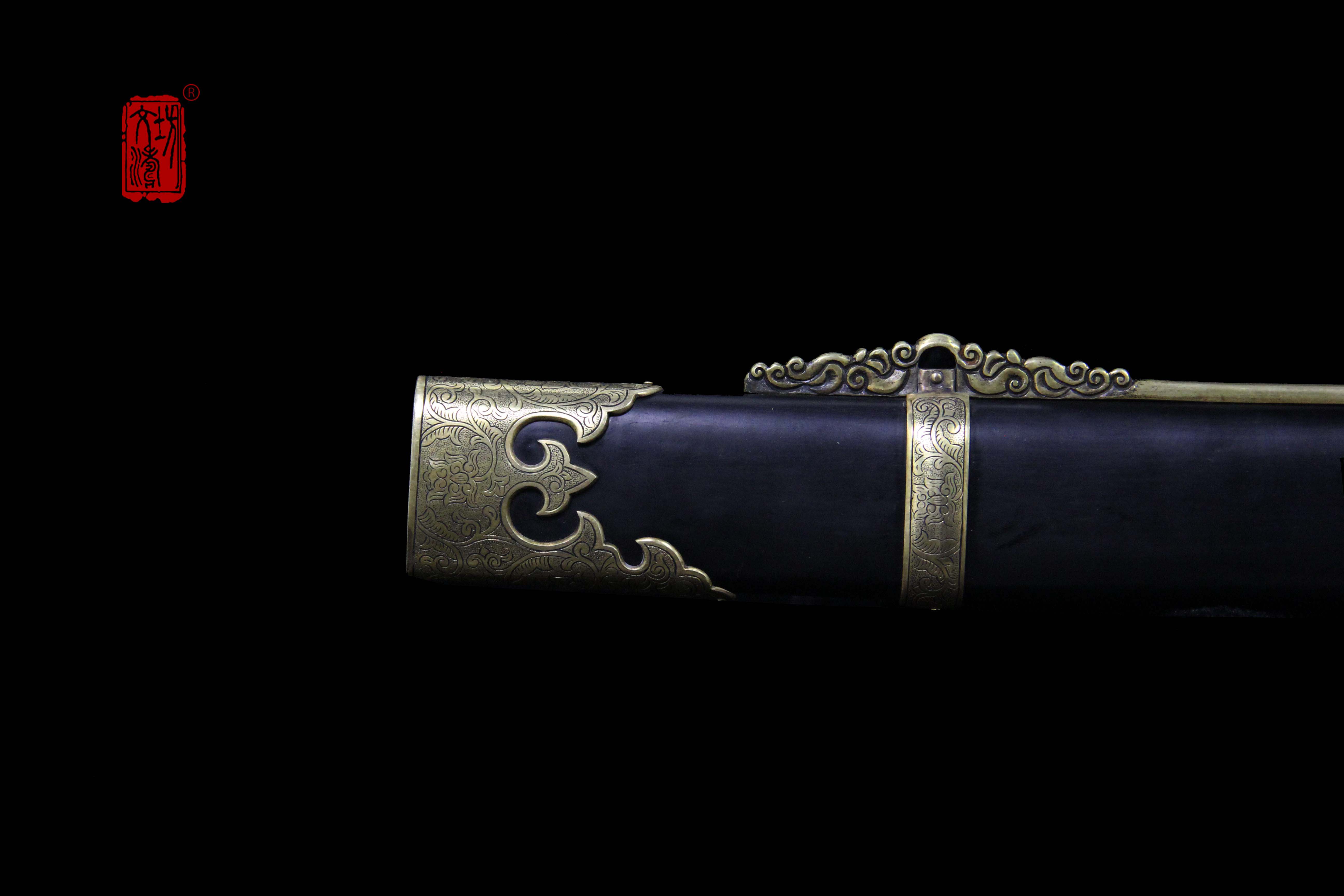 装具按照明代风格配装,全装做阴刻缠枝宝相花纹饰,手工雕刻、线条柔和、生动细腻,整装做旧更显古韵。刀卡为铁鋄银,刀鞘按照传统明饰,披布披灰,刷黑大漆,体现髹漆技艺,手柄包老皮、缠绳、卯花。