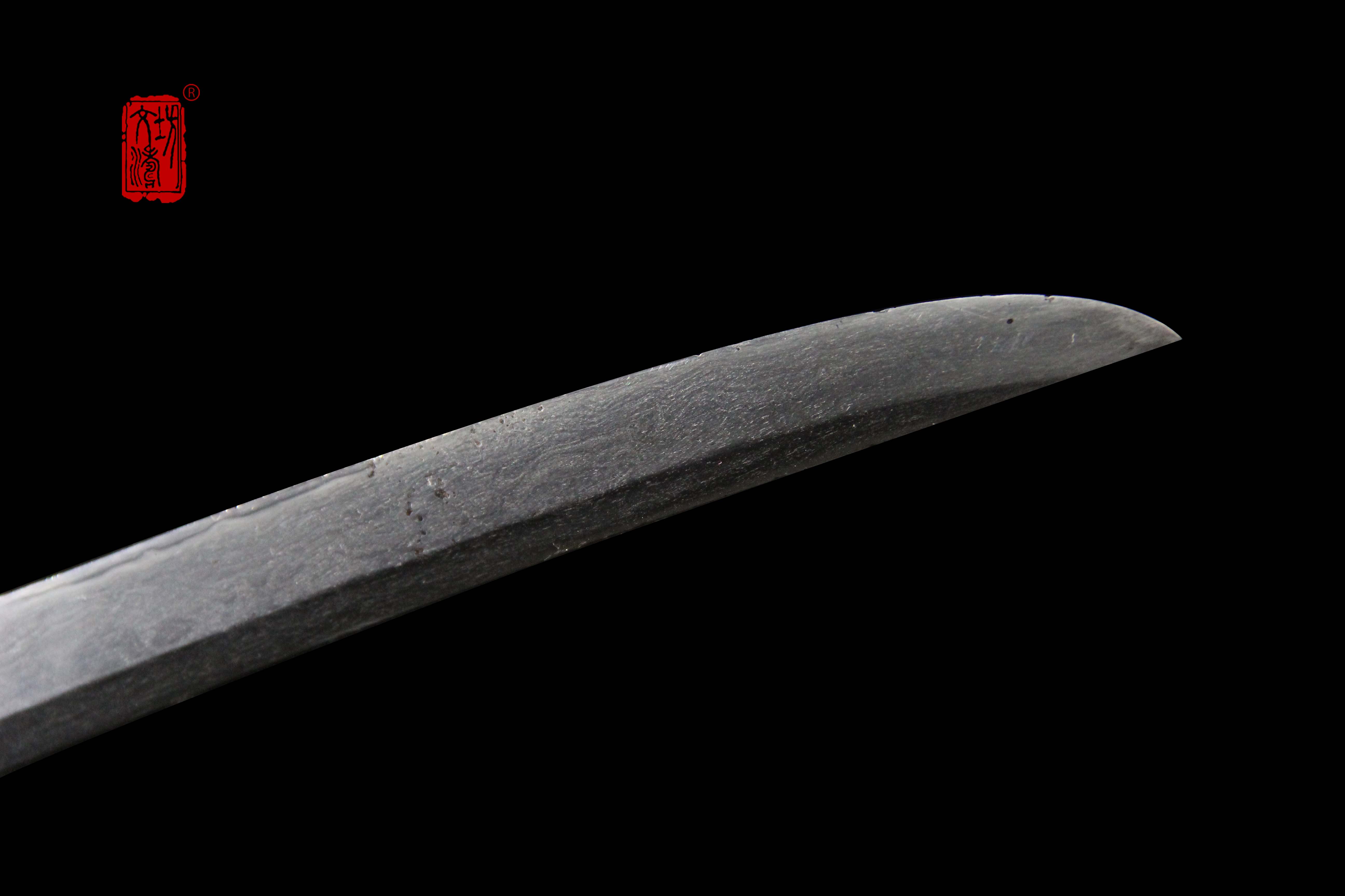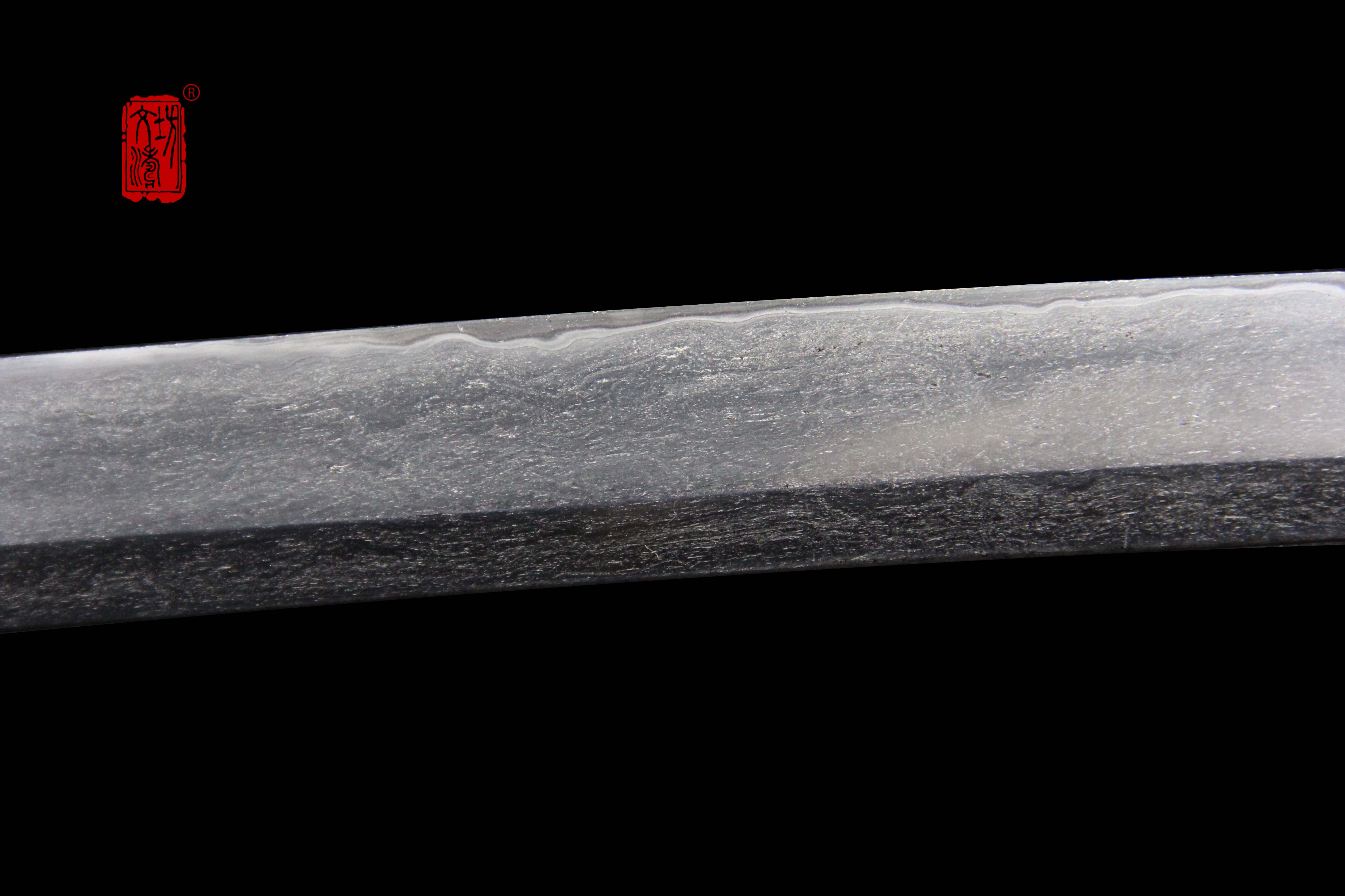 研磨借鉴日本刀磨法,研磨后,镐地部分清晰明亮,近似于镜面;平地部分锻造细腻、纹理清晰;刃部夹钢,刃纹明显。