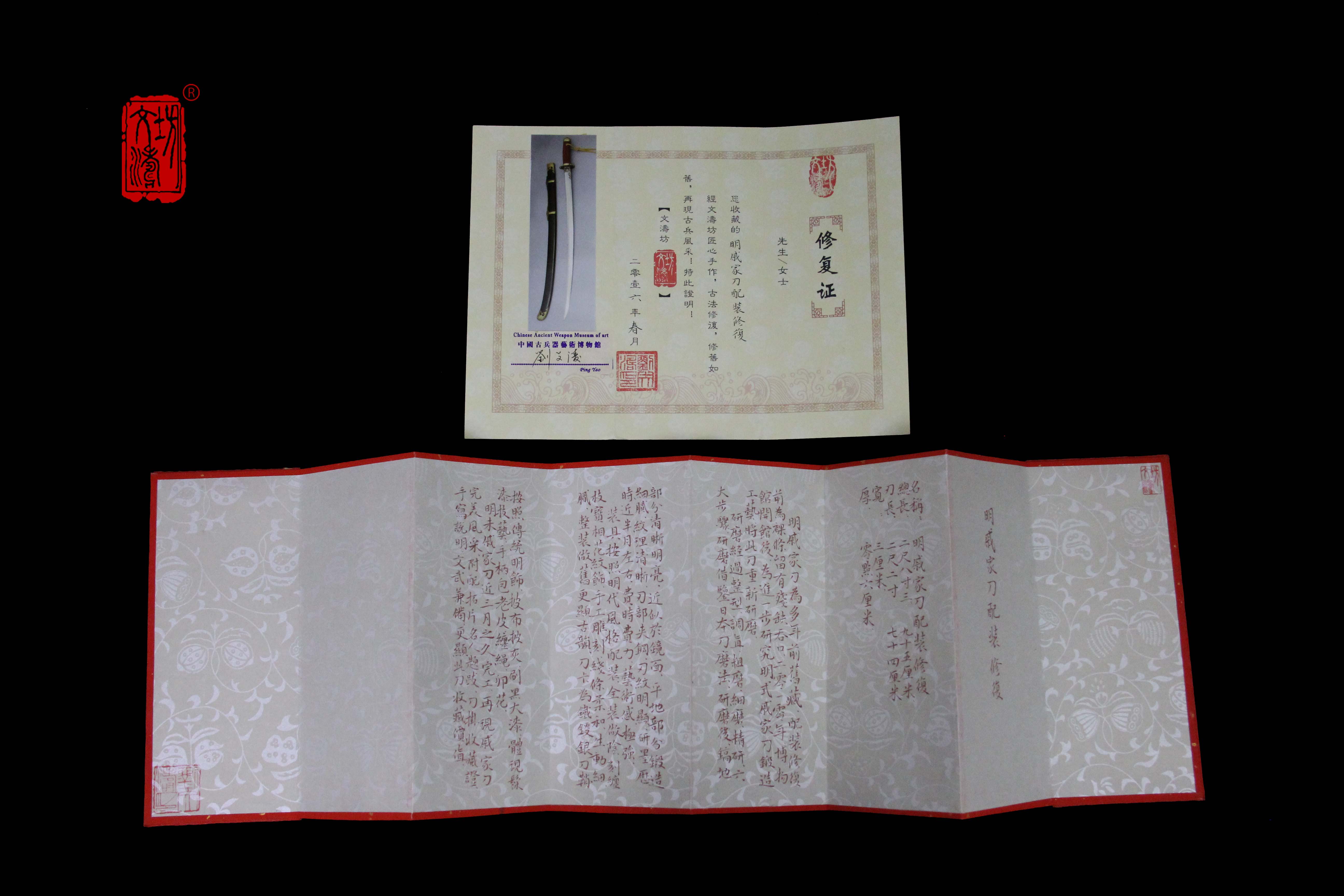 明末戚家刀近三月之久完工,再现戚家刀完美风采。附配拓片名人题跋、刀挂、收藏证、手写说明,文武兼备,更显此刀收藏价值。