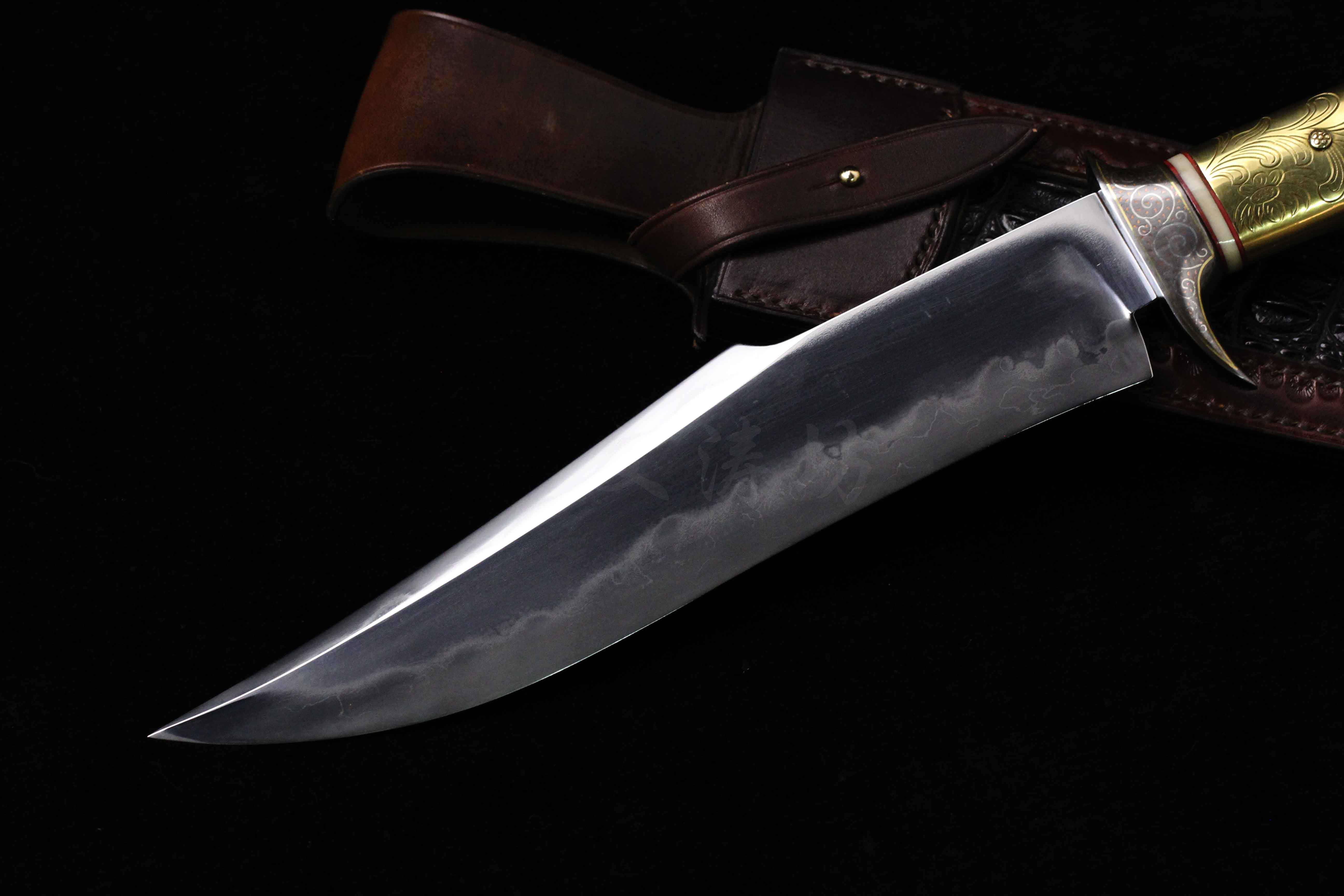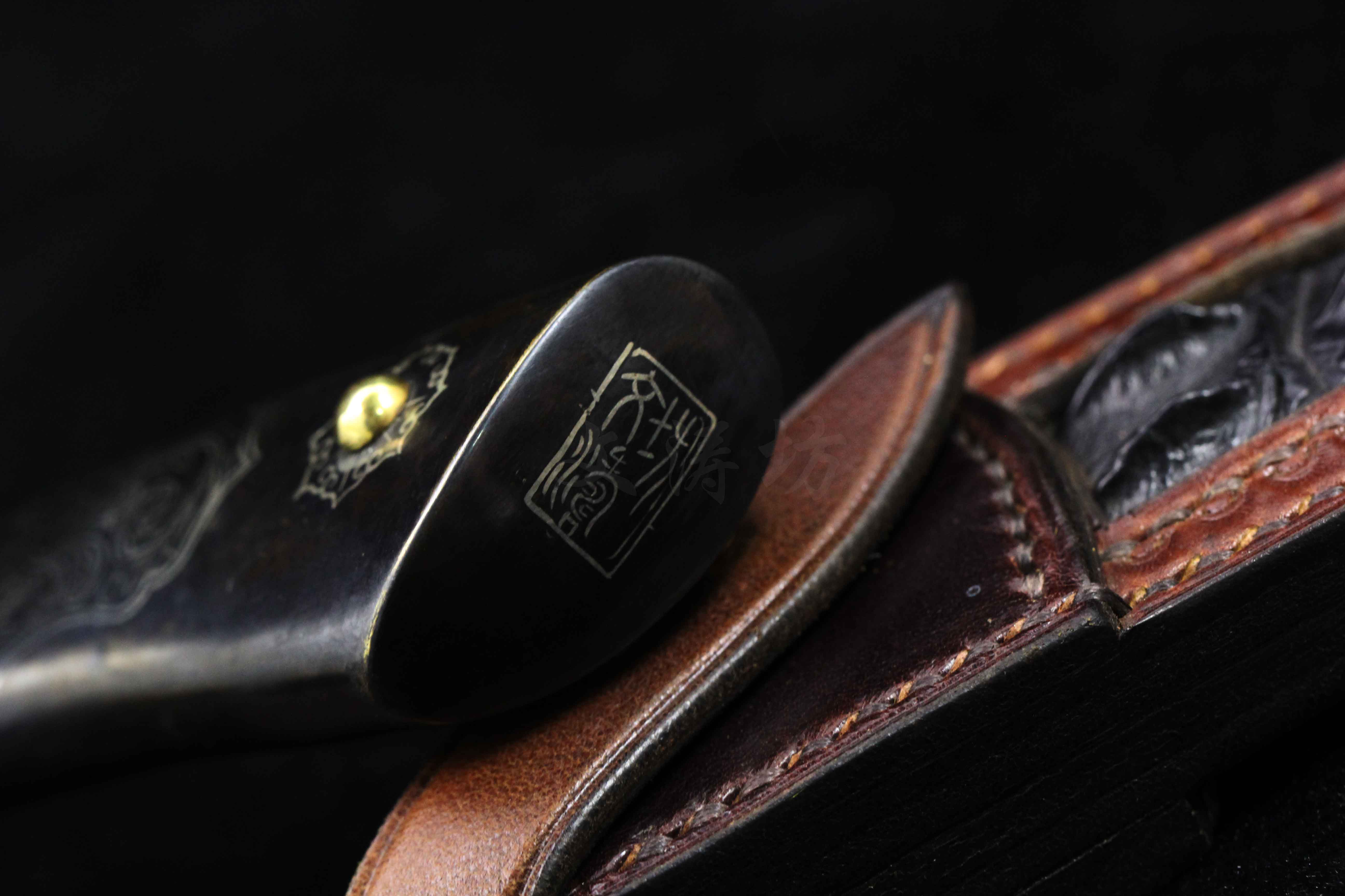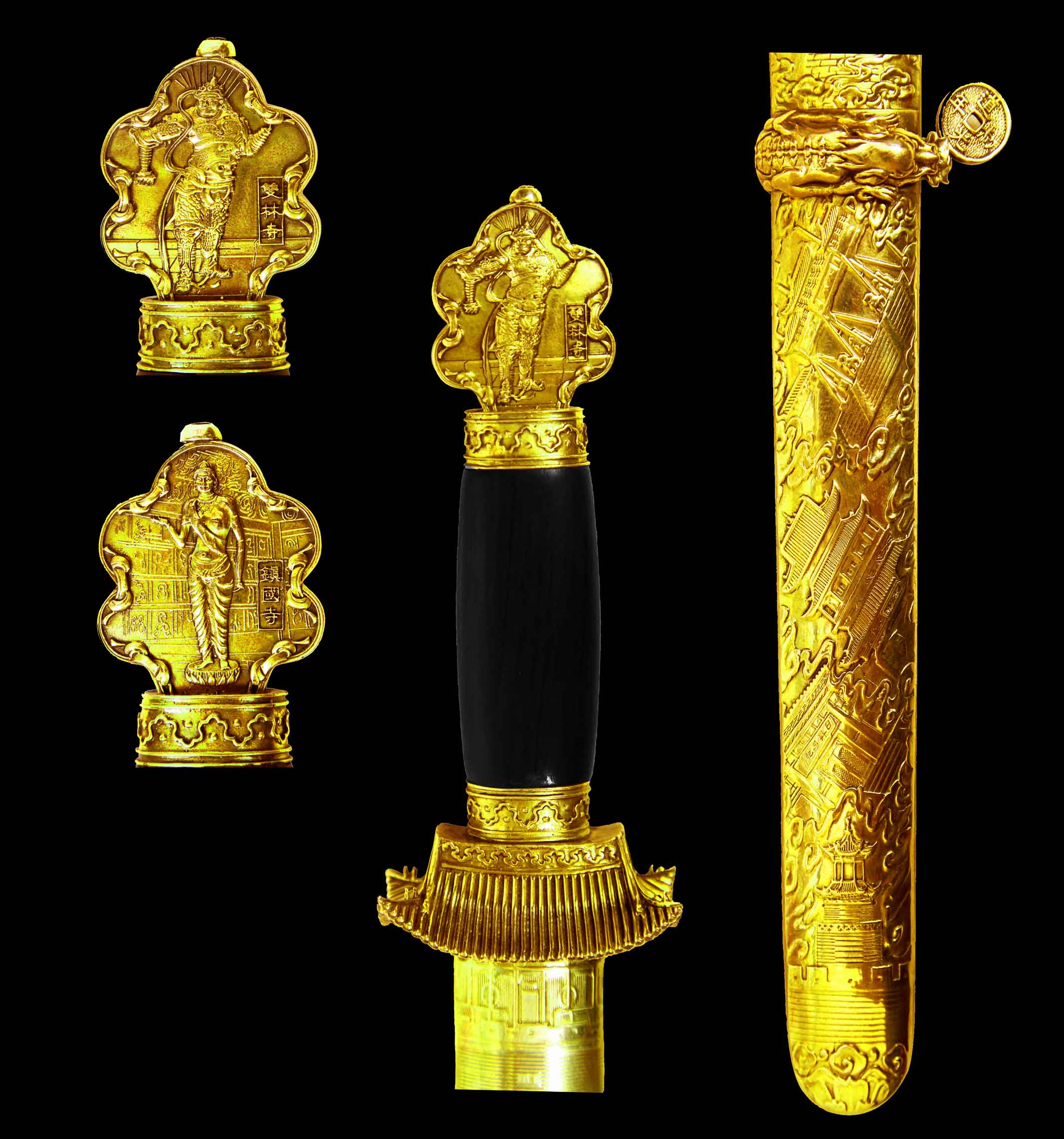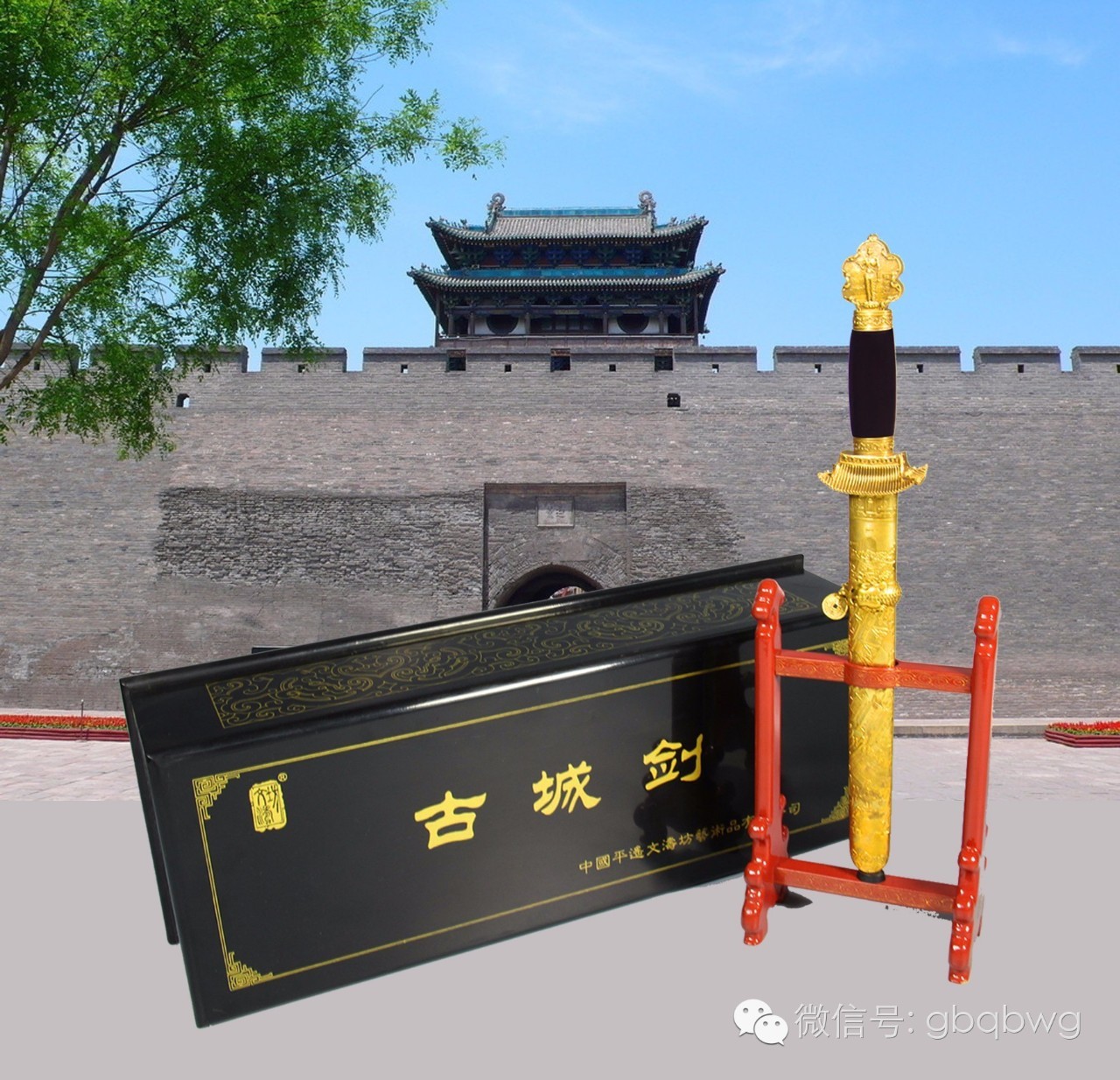 平遥古城距今拥有2700多年的历史,是国家历史文化名城,世界文化遗产。它是中国境内保存最为完整的一座古代县城,是中国汉民族城市在明清时期的杰出范例。此剑是平遥县政府力推的旅游珍品、由锻造技艺第六代传人刘文涛先生精心制作设计;平遥剑鞘以“一城两寺”的设计理念为依托,将古城墙、双林寺、镇国寺、城隍庙、清虚观、县衙、文庙、市楼、日升昌票号等著名景点为装饰图案,体现平遥丰厚、多样的建筑与源源流长的文化内涵。体现中华儒教、道教、佛教以及民俗文化,“两寺”浮雕于柄首,分别是双林寺韦陀与镇国寺菩萨像;剑身手工折叠锻打,子夜淬火,纯手工研磨, 柄为驼骨做瓜棱状、剑格与剑鞘为连体古城楼建筑,剑鞘上盘绕貔貅口吞铜币,代表招财进宝之意,浮雕“汇通天下”字样,代表中国第一家票号——平遥日升昌。平遥剑极致匠心,是刀剑与古城文化的完美融合!
