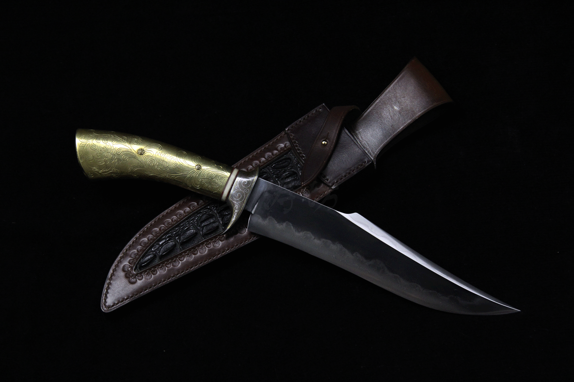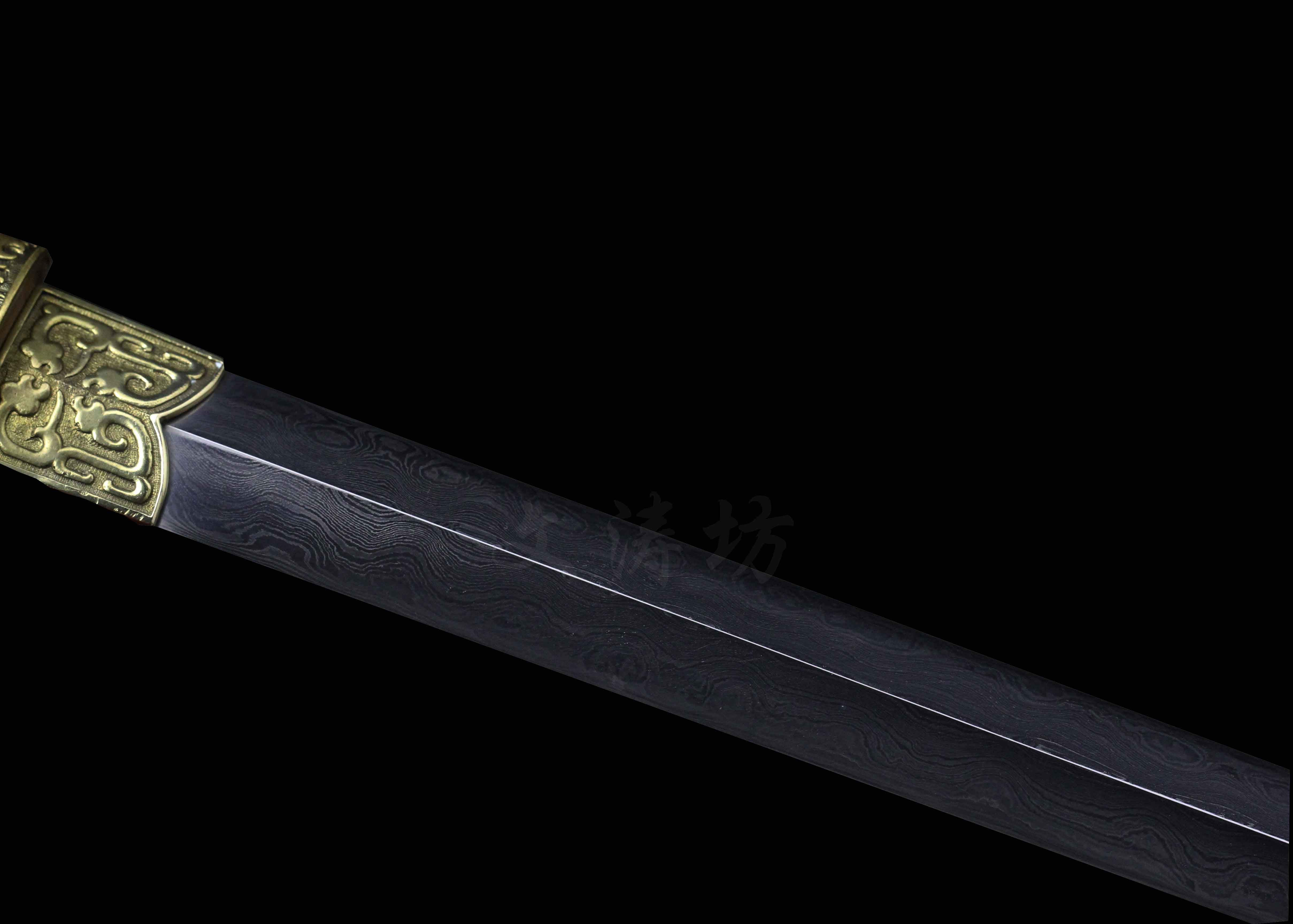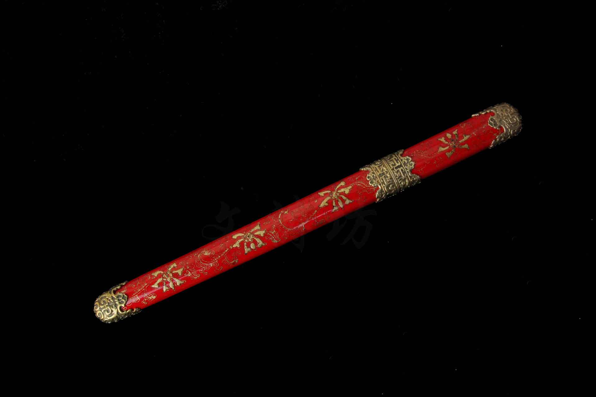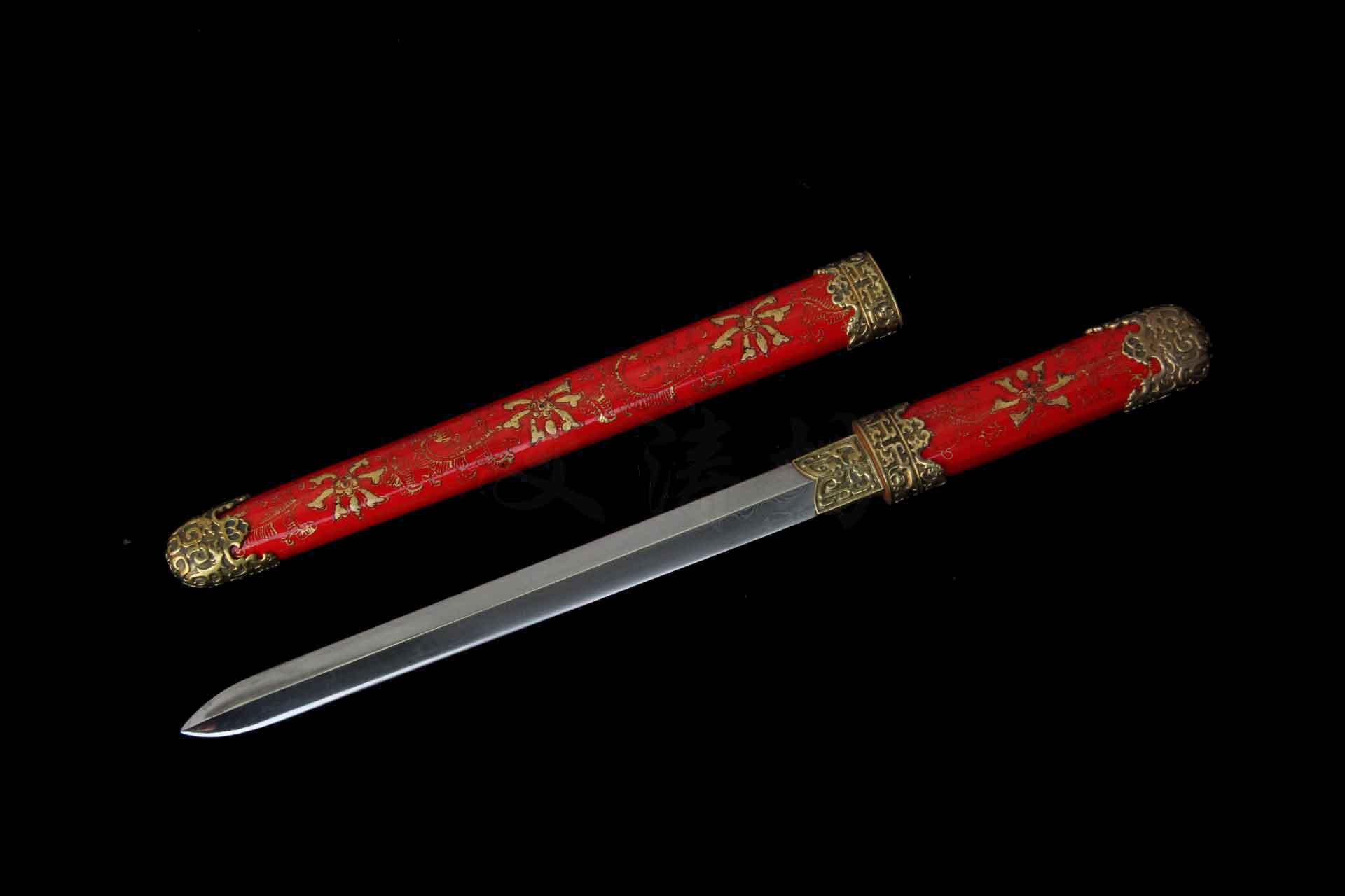 晋商走镖剑参照中国第一镖局创办人——王正清早年随身携带的袖剑与平遥悠久晋商文化相融合,历时半年之剑设计完工。此剑主要为行镖时随身携带。装具为铜装精雕细刻夔龙凤纹,剑鞘采用传统漆艺工艺,剑身为自炼土钢与高碳钢折叠锻打数万层,纯手工精研,是不可多得的收藏佳品!