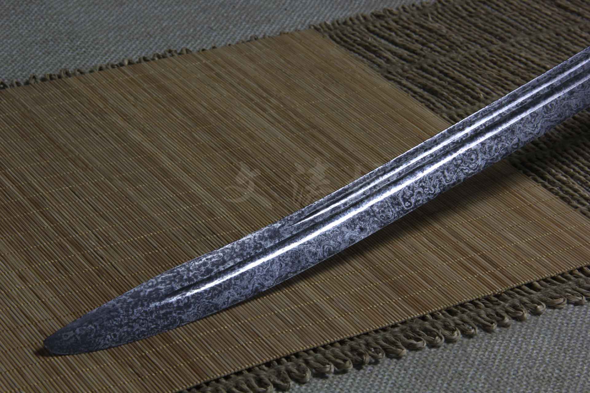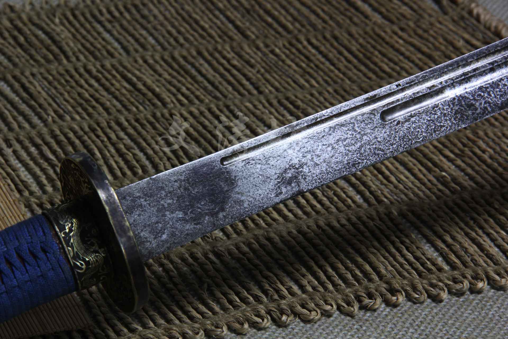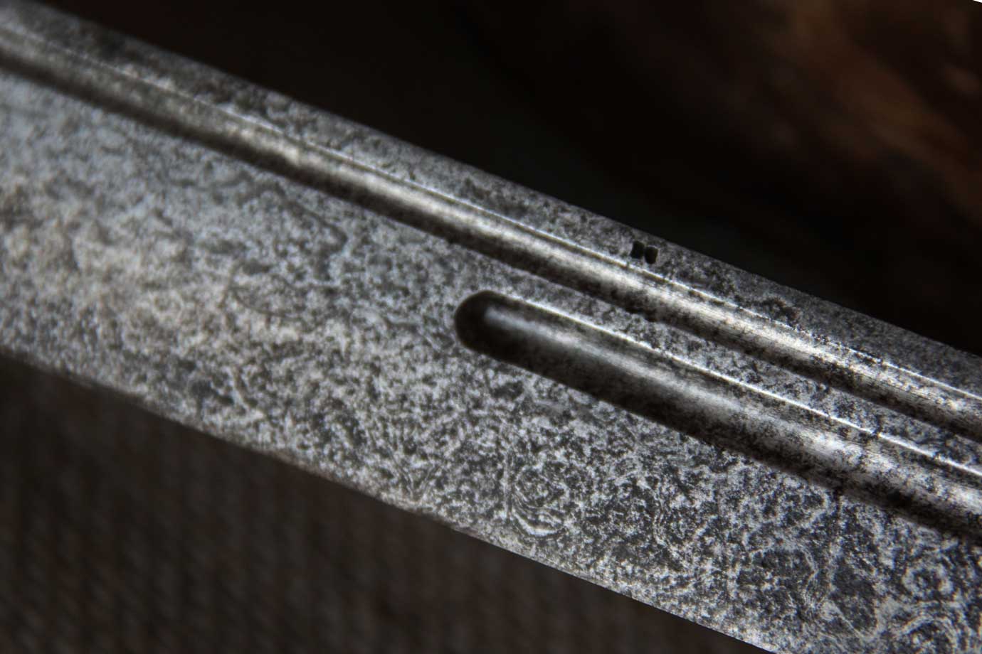 刀条开双血槽,开槽规整,刀身经简单除锈,花纹清晰明了,为折叠团打纹。刀身中部有一处埋金工艺,也是传统金工技法的信息,图片以示。