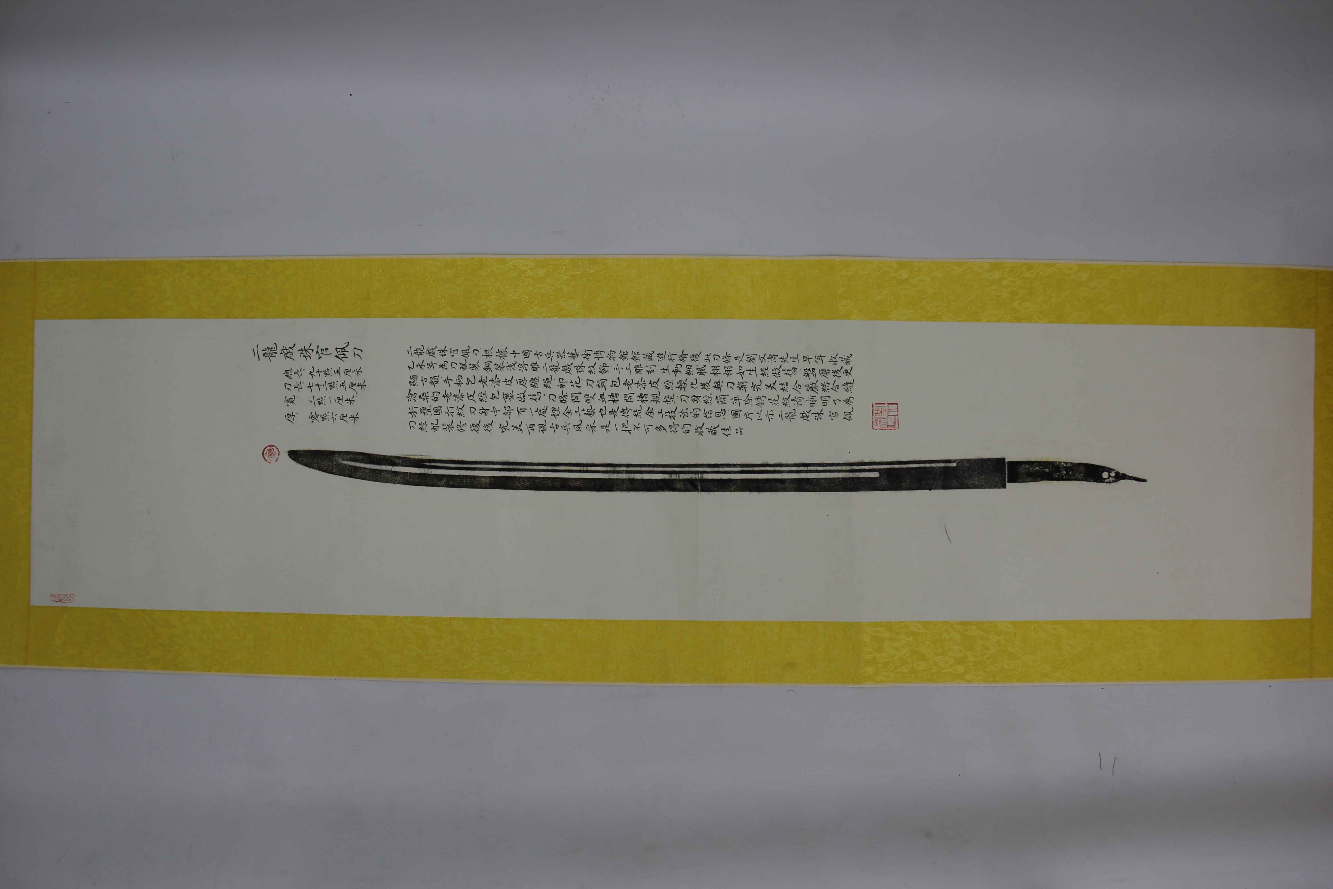 此刀条是刘文涛先生早年收藏,乙未年为刀配装,铜装浅浮雕二龙戏珠纹饰,手工雕刻,生动细腻,栩栩如生,经做旧、盘磨后更显古韵。