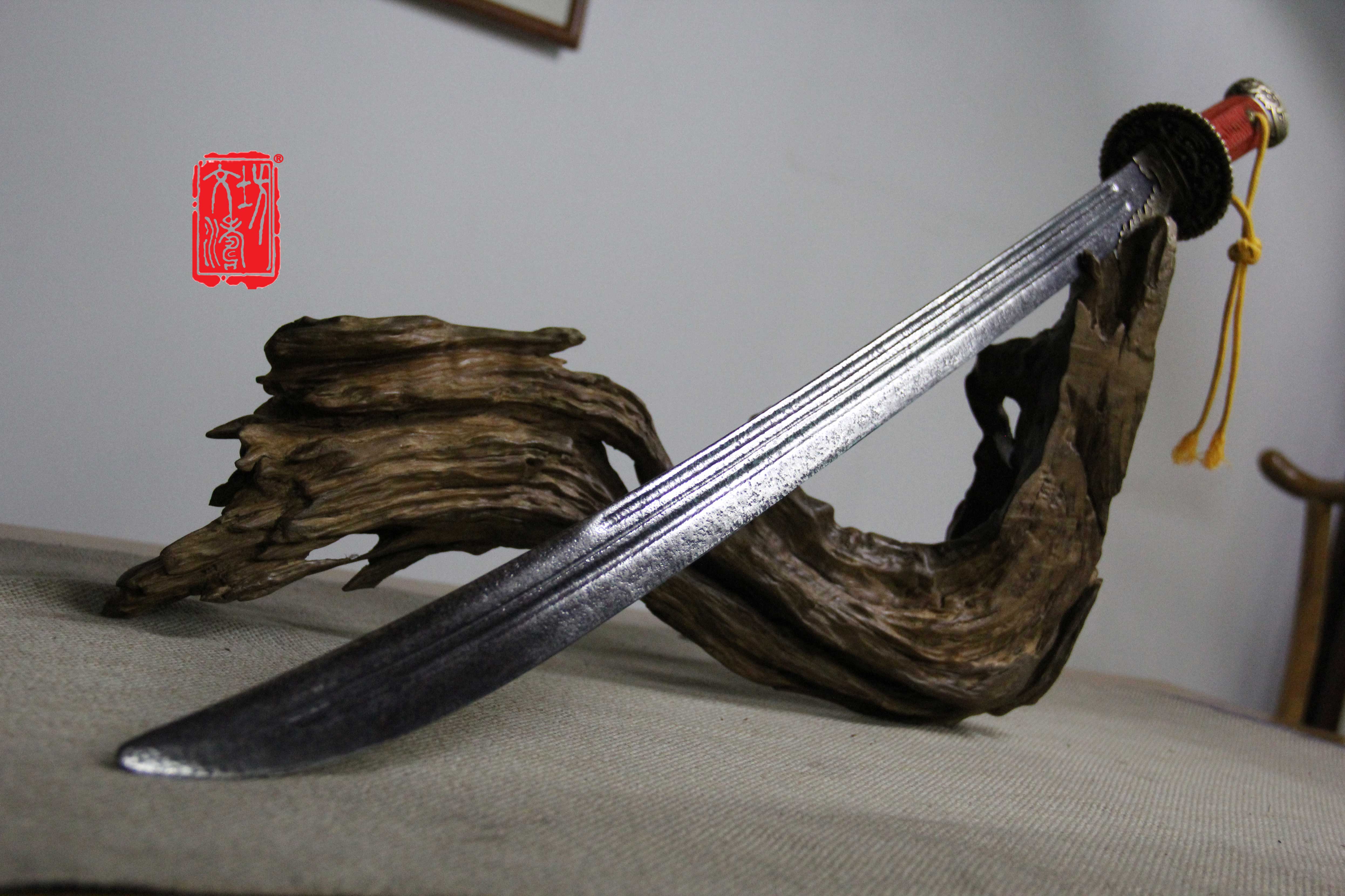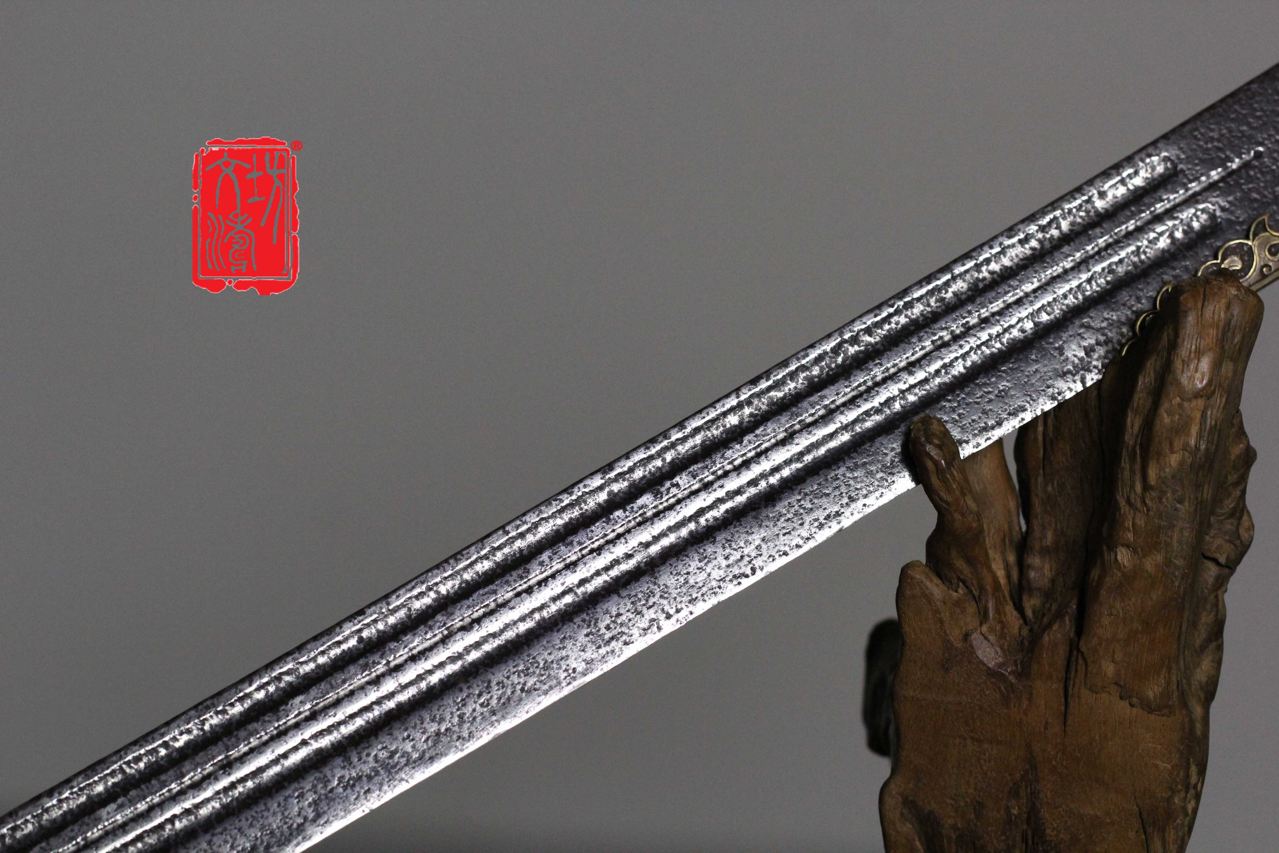 此刀刀姿挺拔,刀体长、背厚,几乎无亏刃,刀身开三条血槽,刀槽两粗一细,开槽规整,直汇刀尖。刀身小麻坑黑皮,上手后手感极佳,