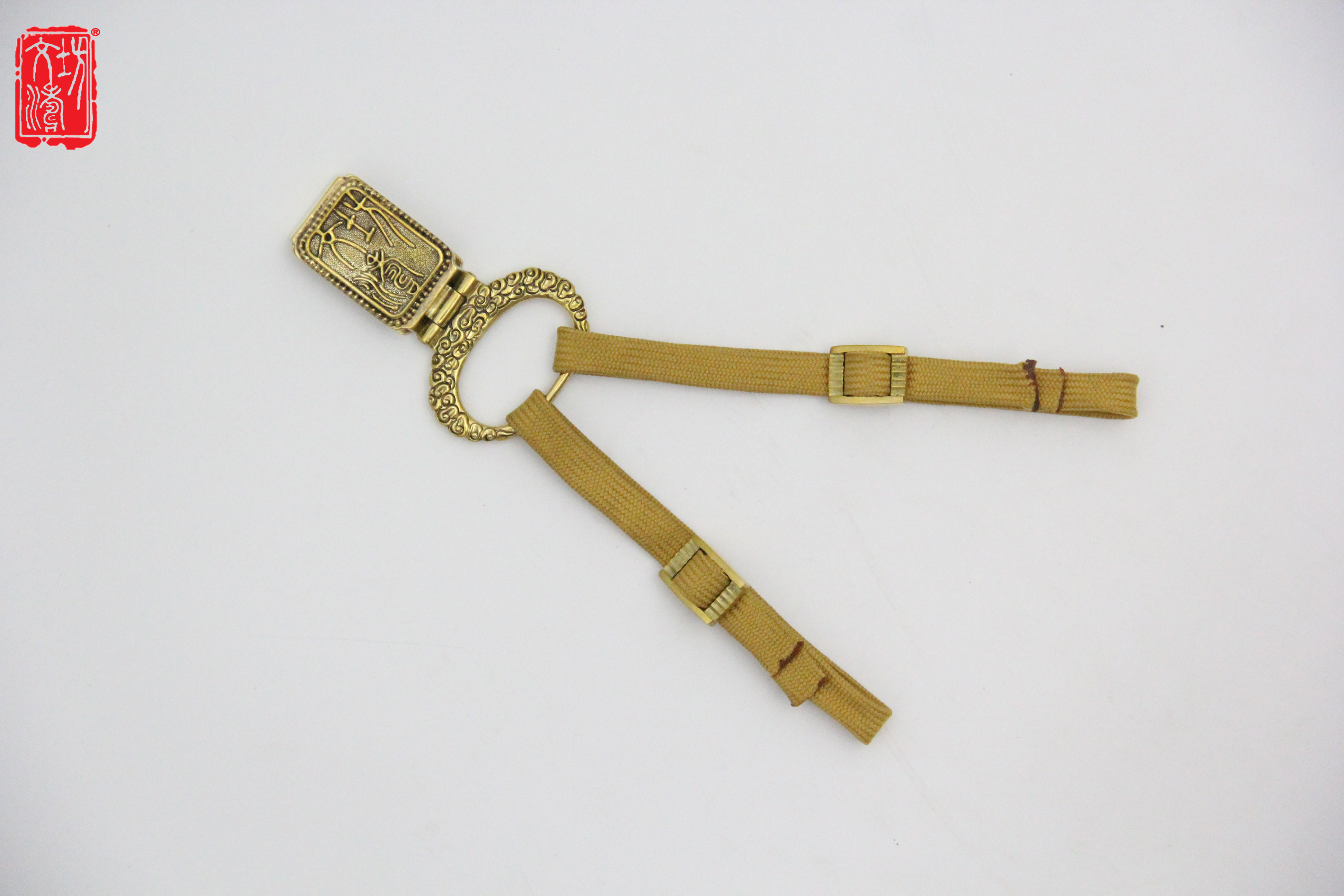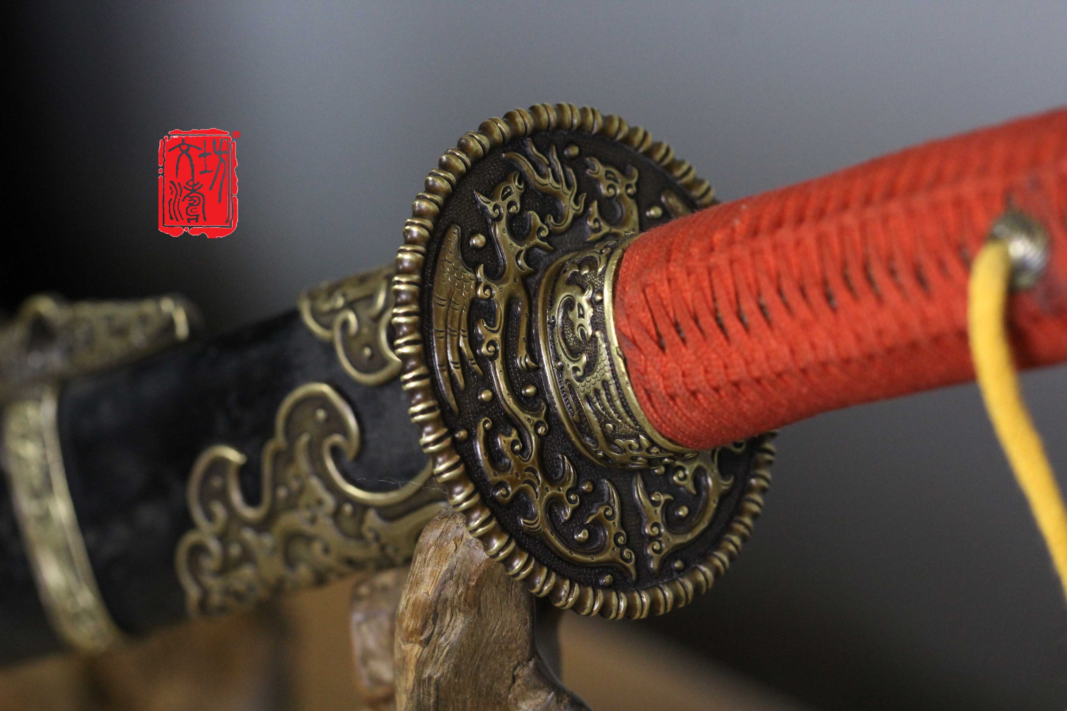 装具按照清代风格配装,吞口铜浮雕夔凤纹,装具浮雕夔凤纹饰,手工雕刻、生动细腻,底部打鱼子地,更显精美,装具整装做旧后古韵十足。