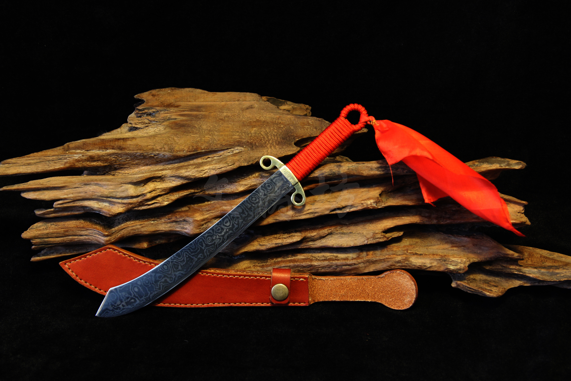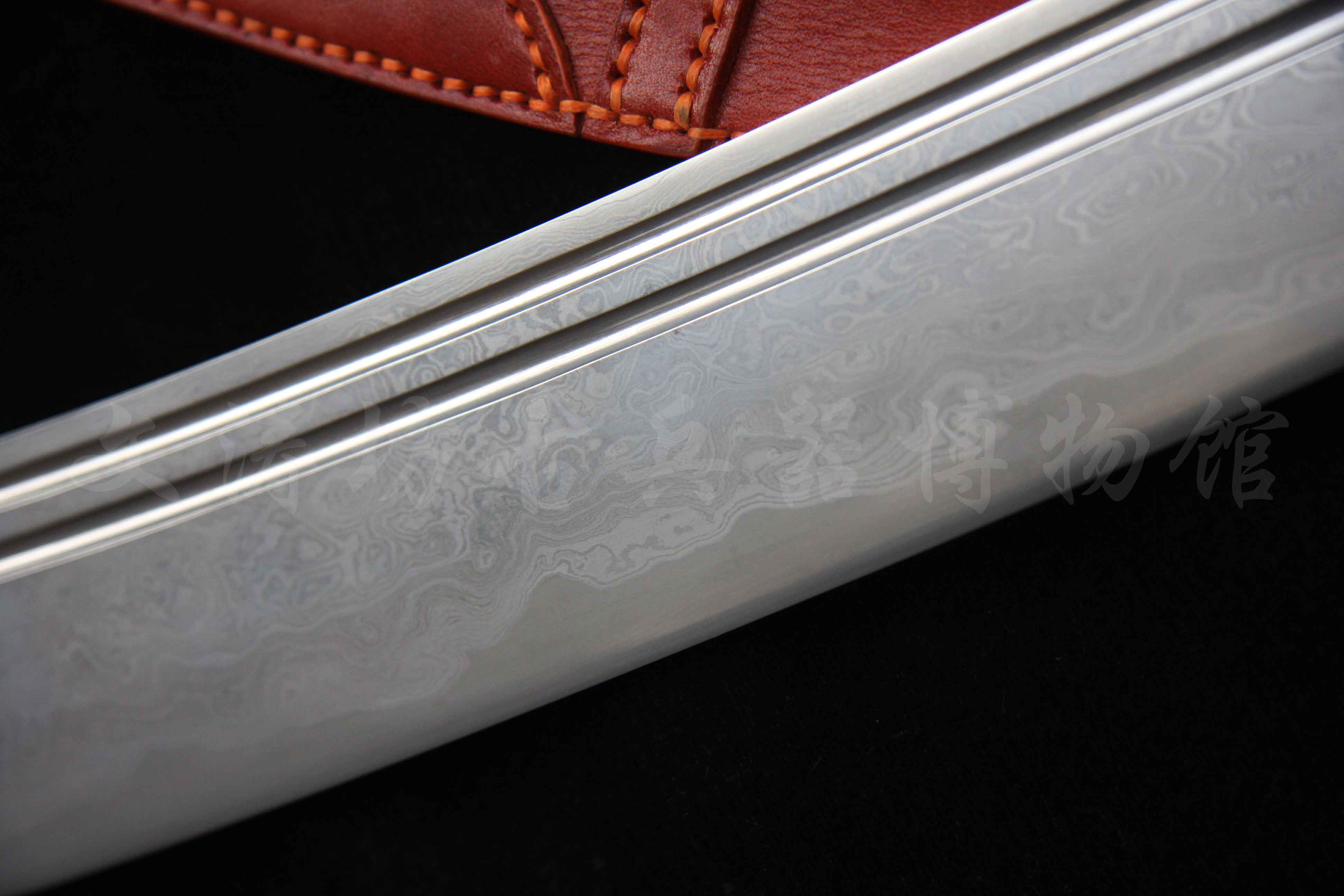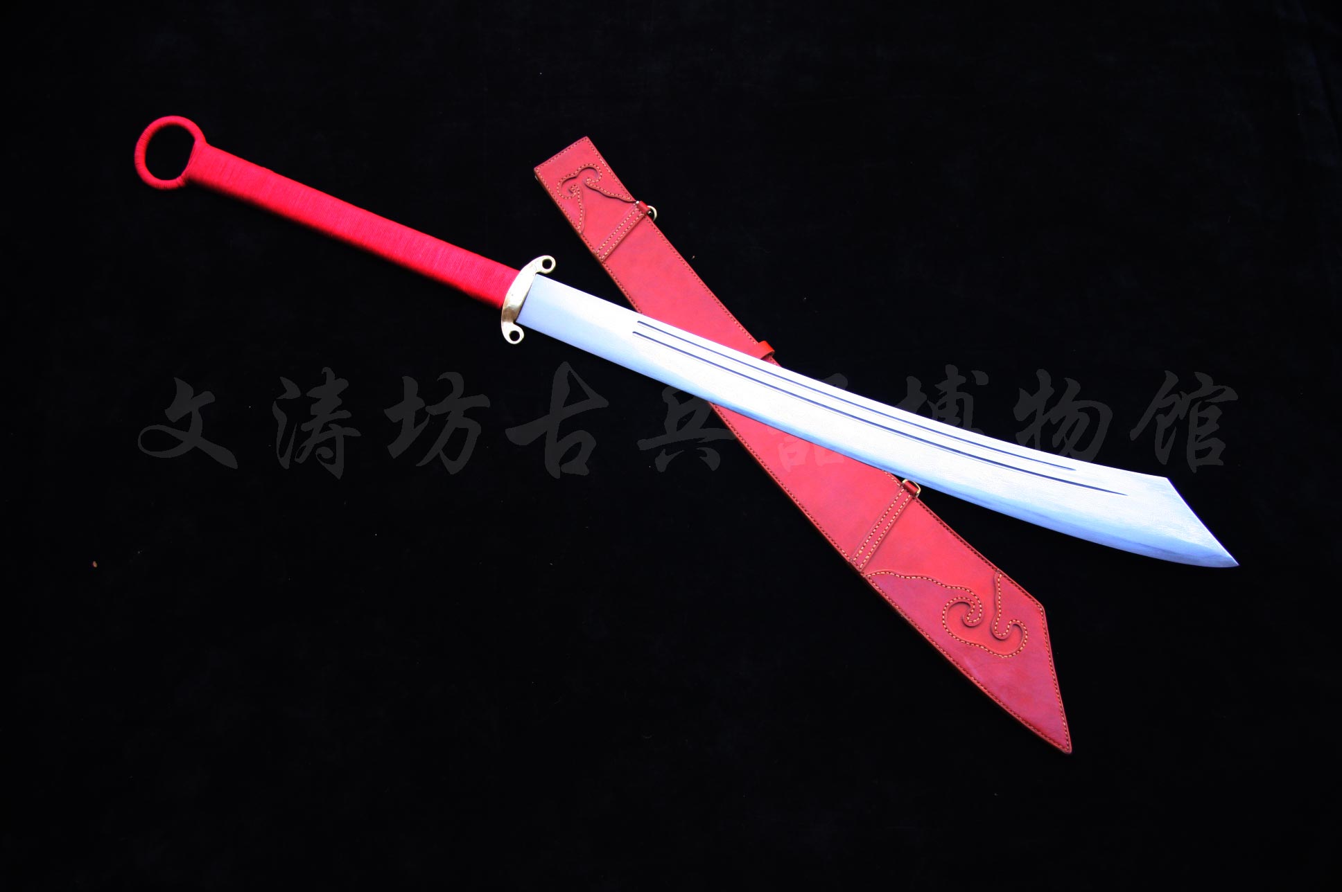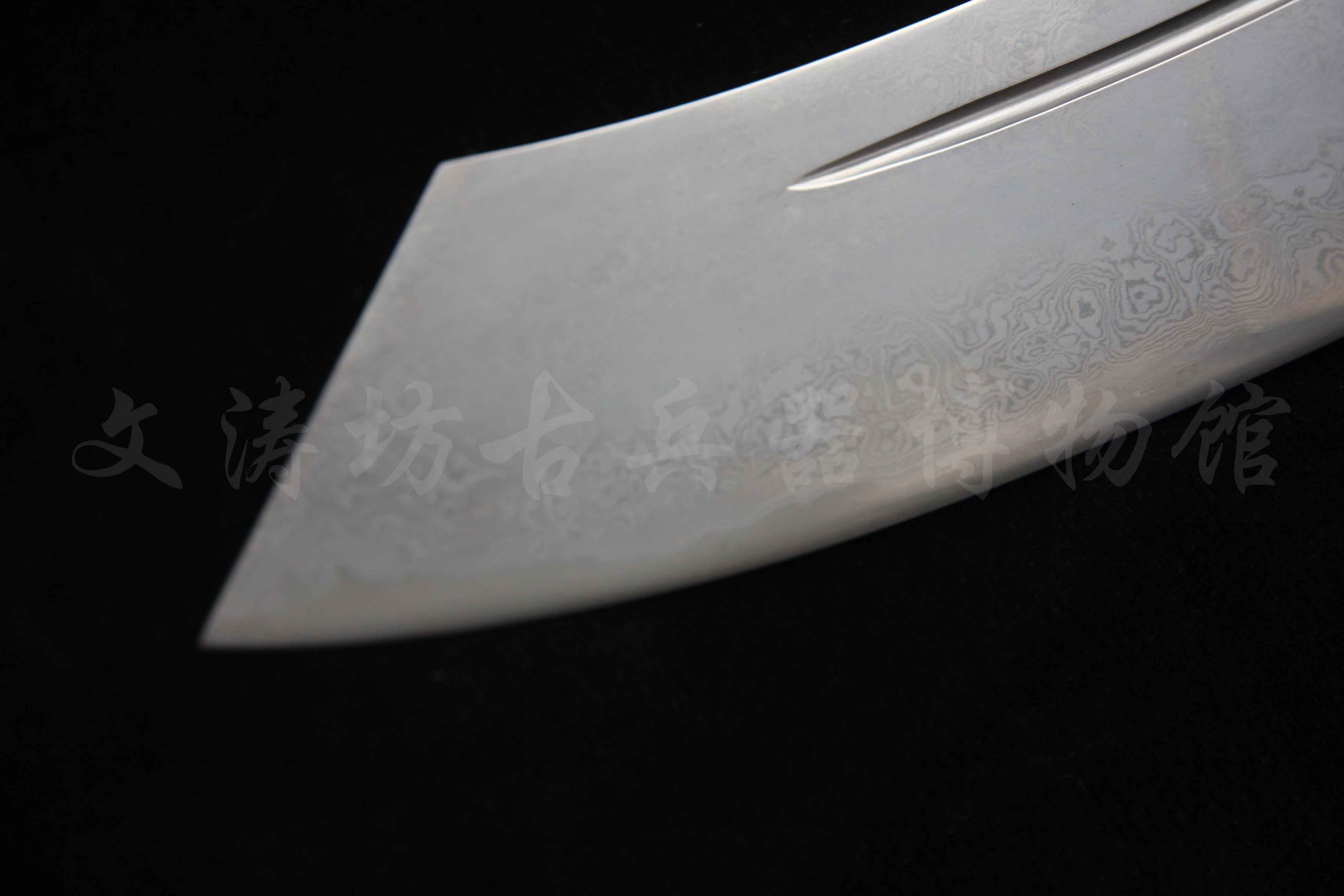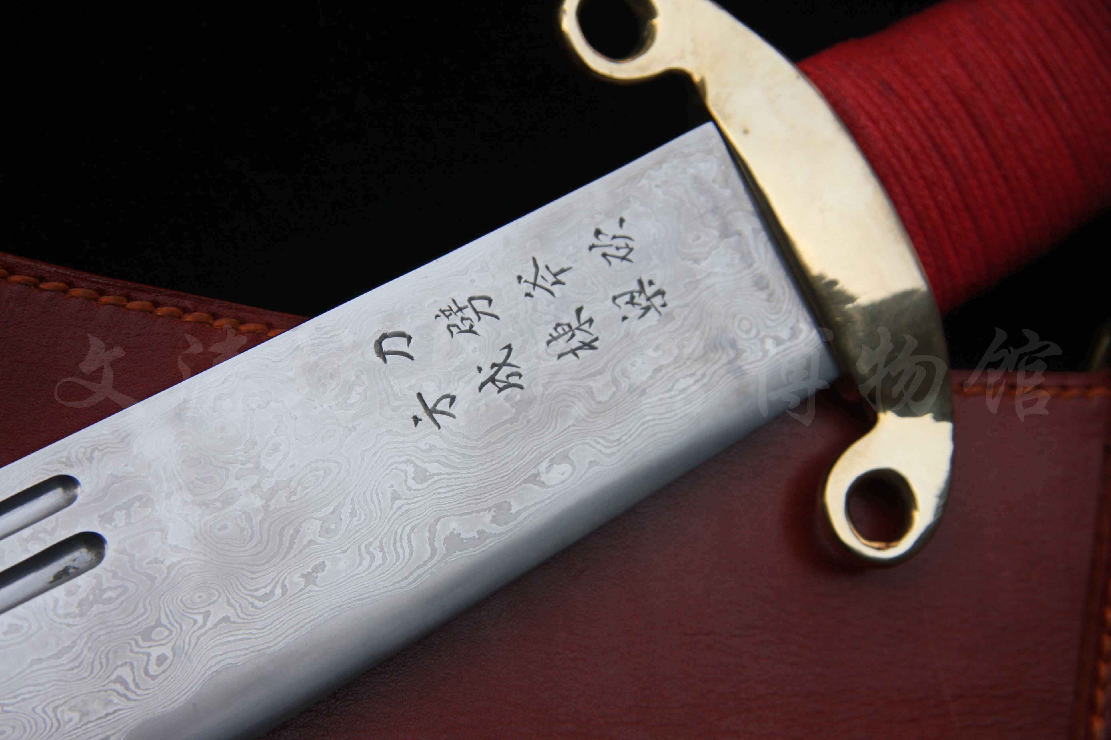 此刀根据文涛坊古兵器博物馆馆藏红军大砍刀设计制作,经数月完工。刀身材质为自炼土钢与高碳钢折叠锻打花纹钢,经十余道工序手工研磨花纹绚丽;刀身楷书“抗战到底”四个大字,充分体现出当时军民抗战到底的决心与信心!!!鞘为进口牛皮手工缝制而成;刀刃宽大刀头加阔,其可单手或双手操持的功能性,結合了重量前傾的刀刃所帶來的极大殺傷力,使之成為理想的近身作战兵器。