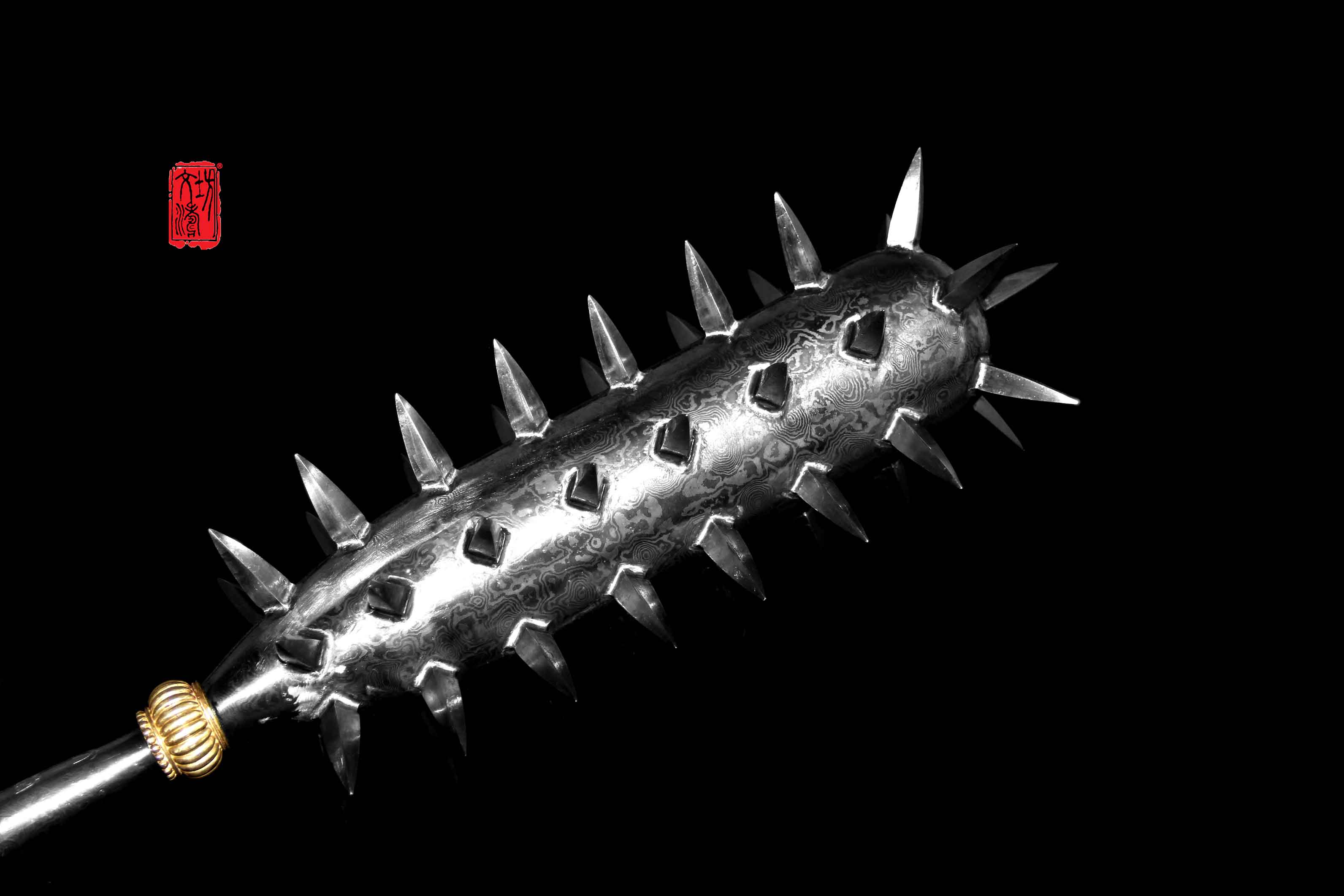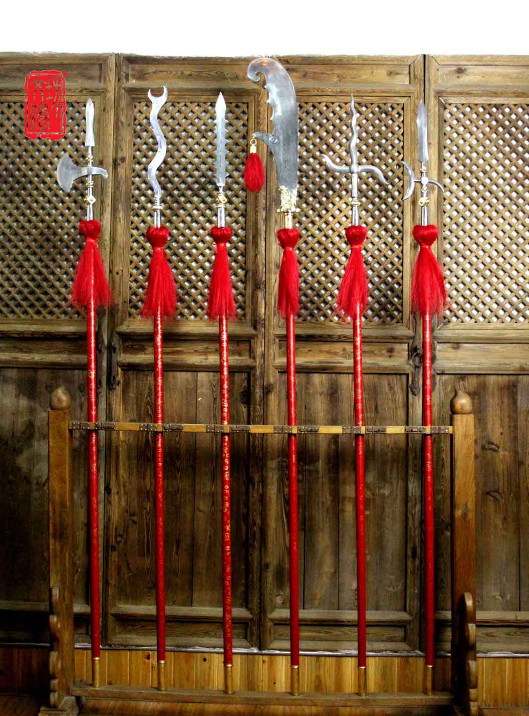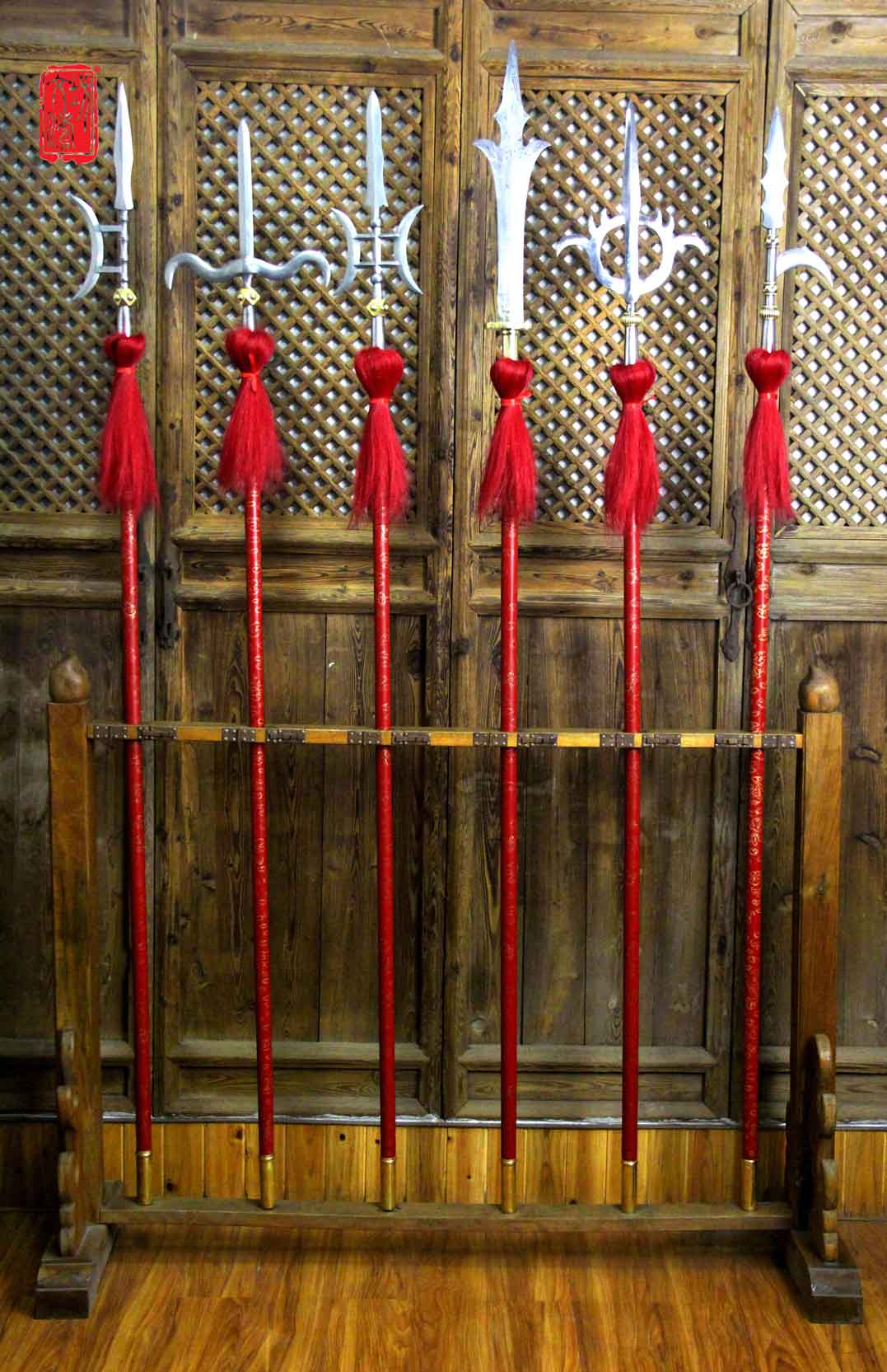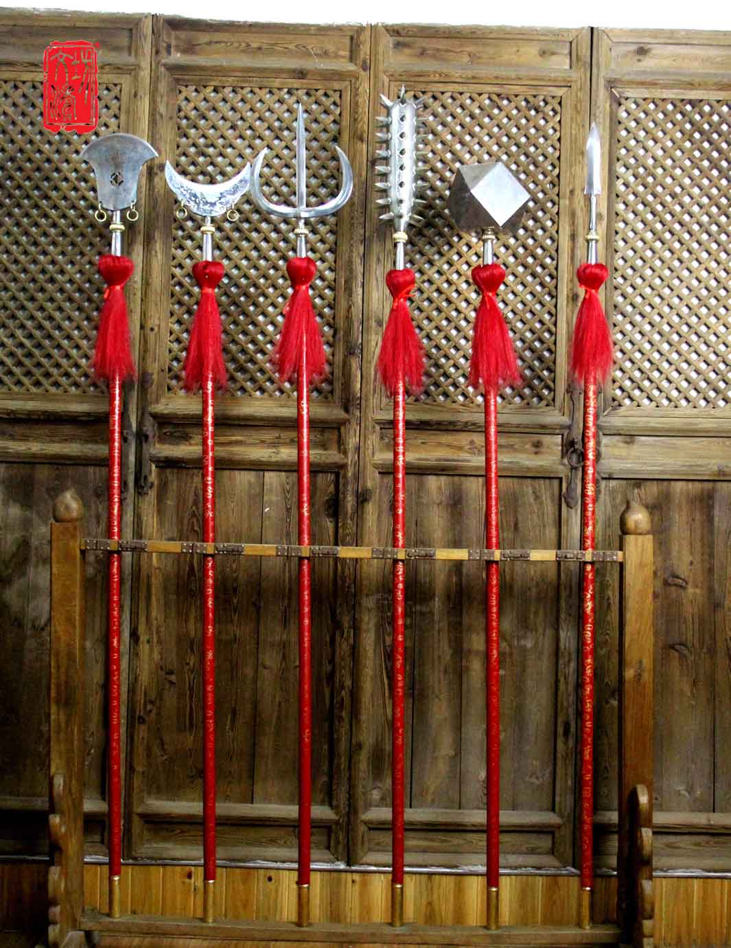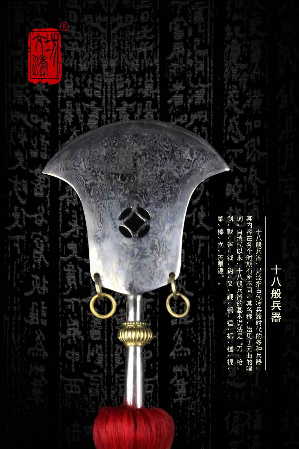 十八般兵器由中国古兵器艺术博物馆馆长刘文涛设计、制作、团队历时三月之久纯手工制作而成。兵器,仪仗之器,以此用来表明使用者的身份、等级与权力。十八般兵器兼顾美学与实战性,杆首材质全部为文涛坊沿用古法,自炼土钢与高碳钢折叠锻打而成花纹钢,子夜淬火、硬度极佳。花纹绚丽多彩、千变万化,由文涛坊顶级研磨师纯手工研磨而成。杆身为铁芯外包硬木,披麻挂灰,上朱红色大漆更添喜气,手绘祥云与蝙蝠纹饰并贴金。寓意吉祥如意、镇宅辟邪、迎福添喜。属文涛坊定制之精品!