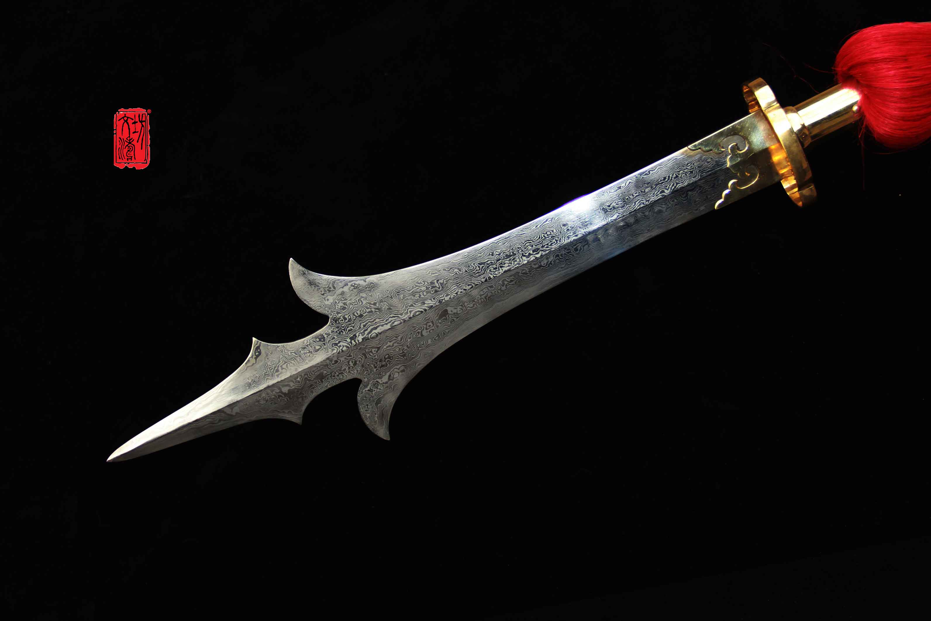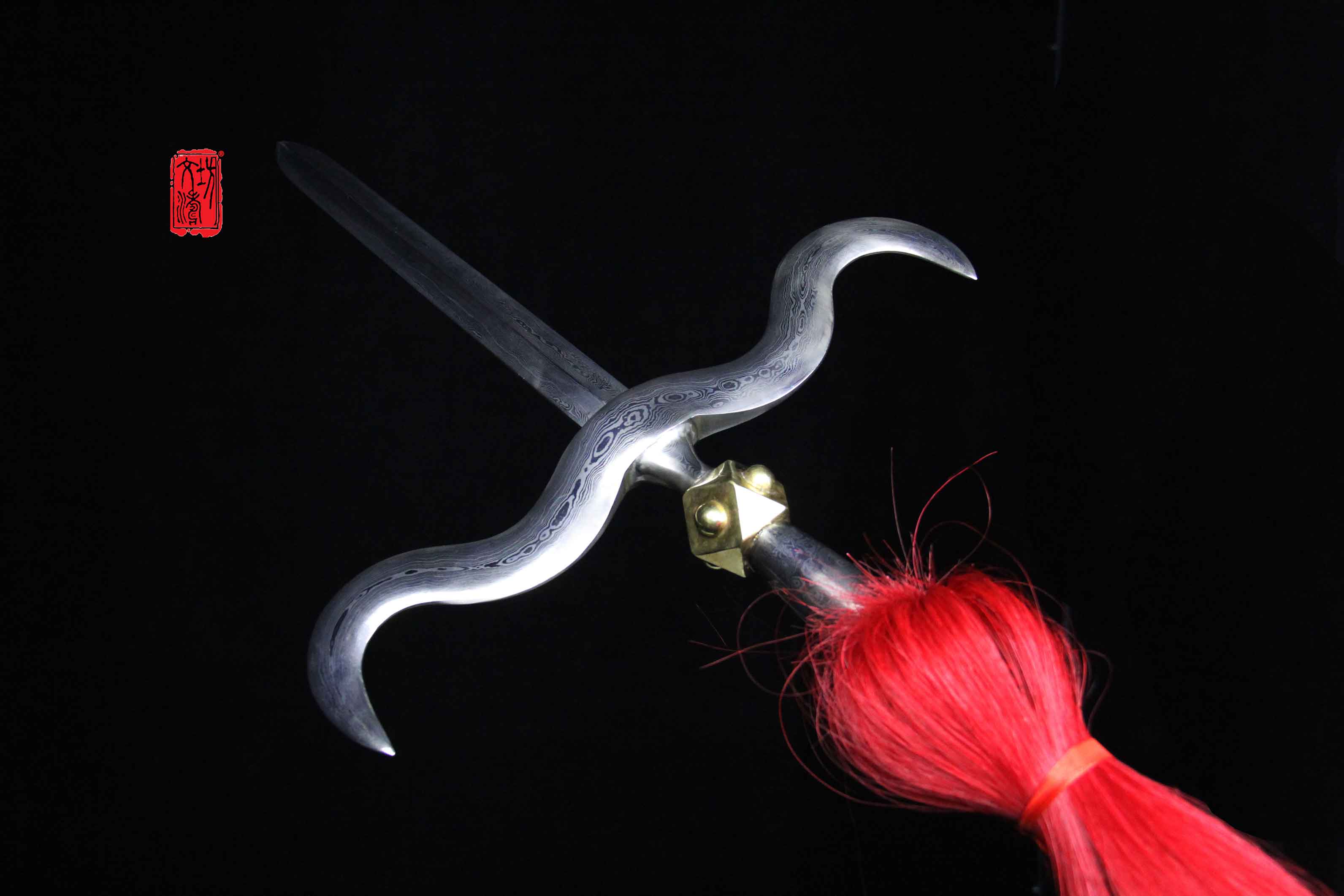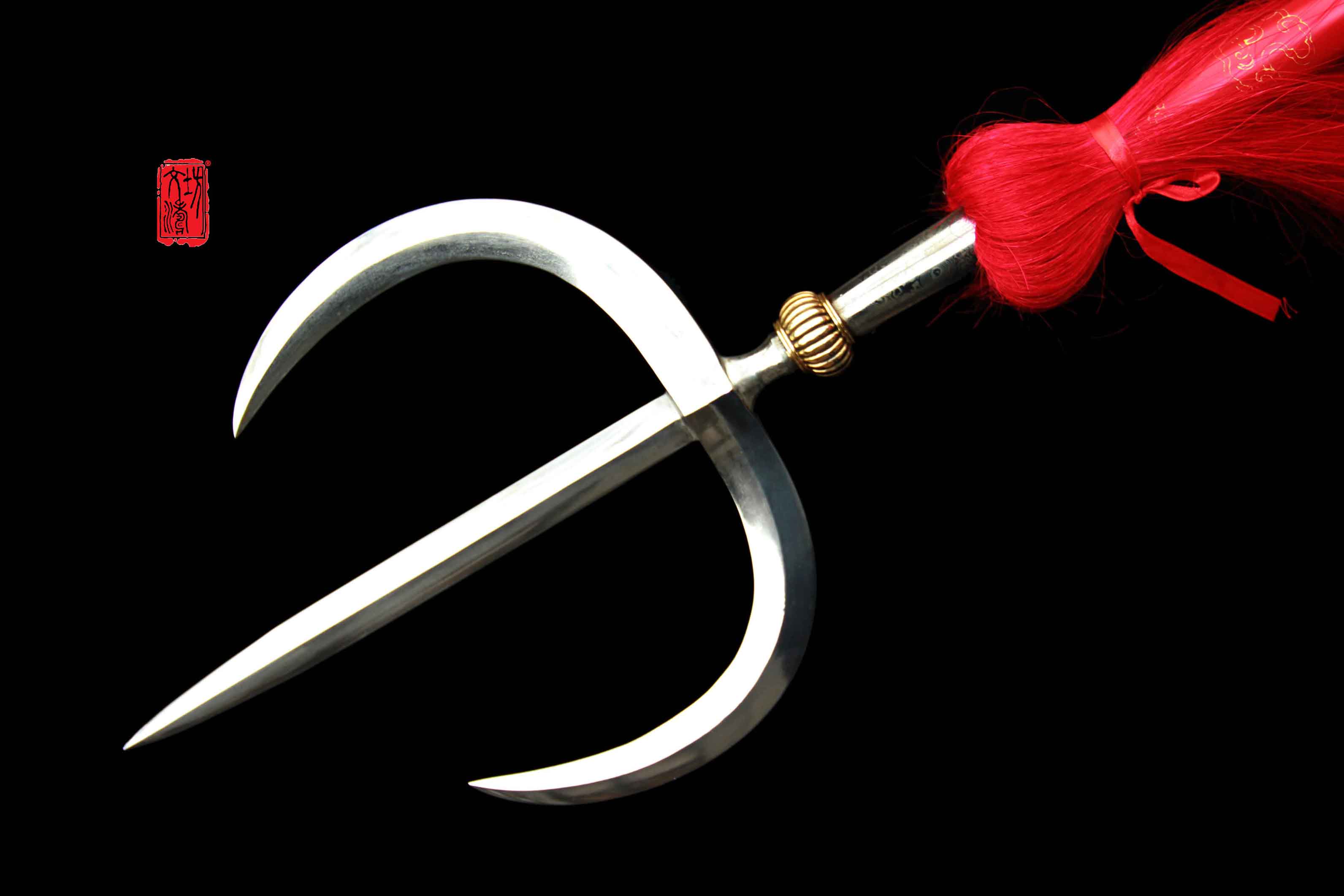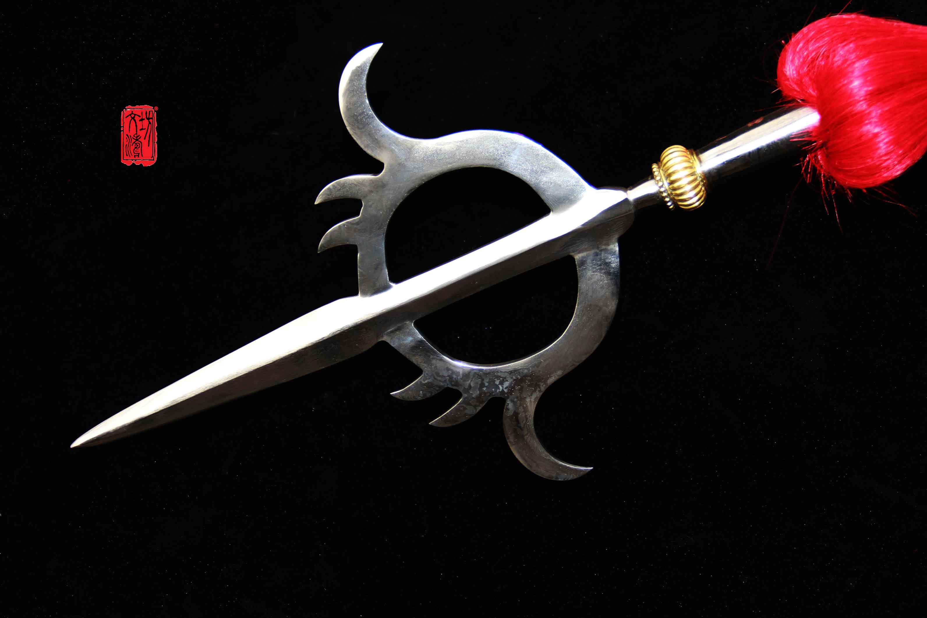 三尖两刃刀属长兵器,也可称二郎刀,相传为二郎神所使用之兵器,此械的前端有三叉刀形,刀身两面有刃,构成其法门独特,随一般大刀之使用法门外,其前端三叉刀可作锁、铲之用,加上配合各种步法、身法演舞,构成一套完整的套路。