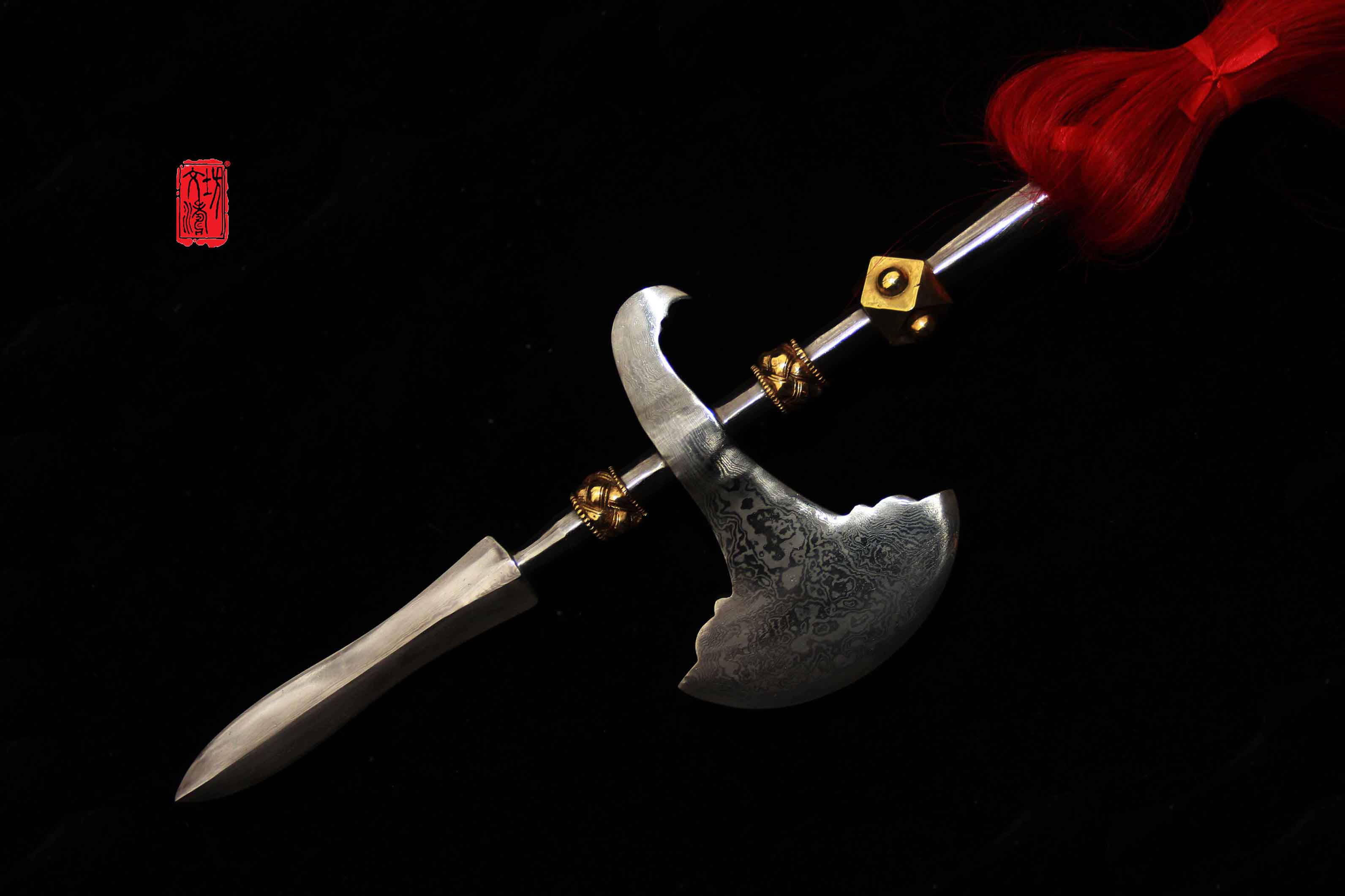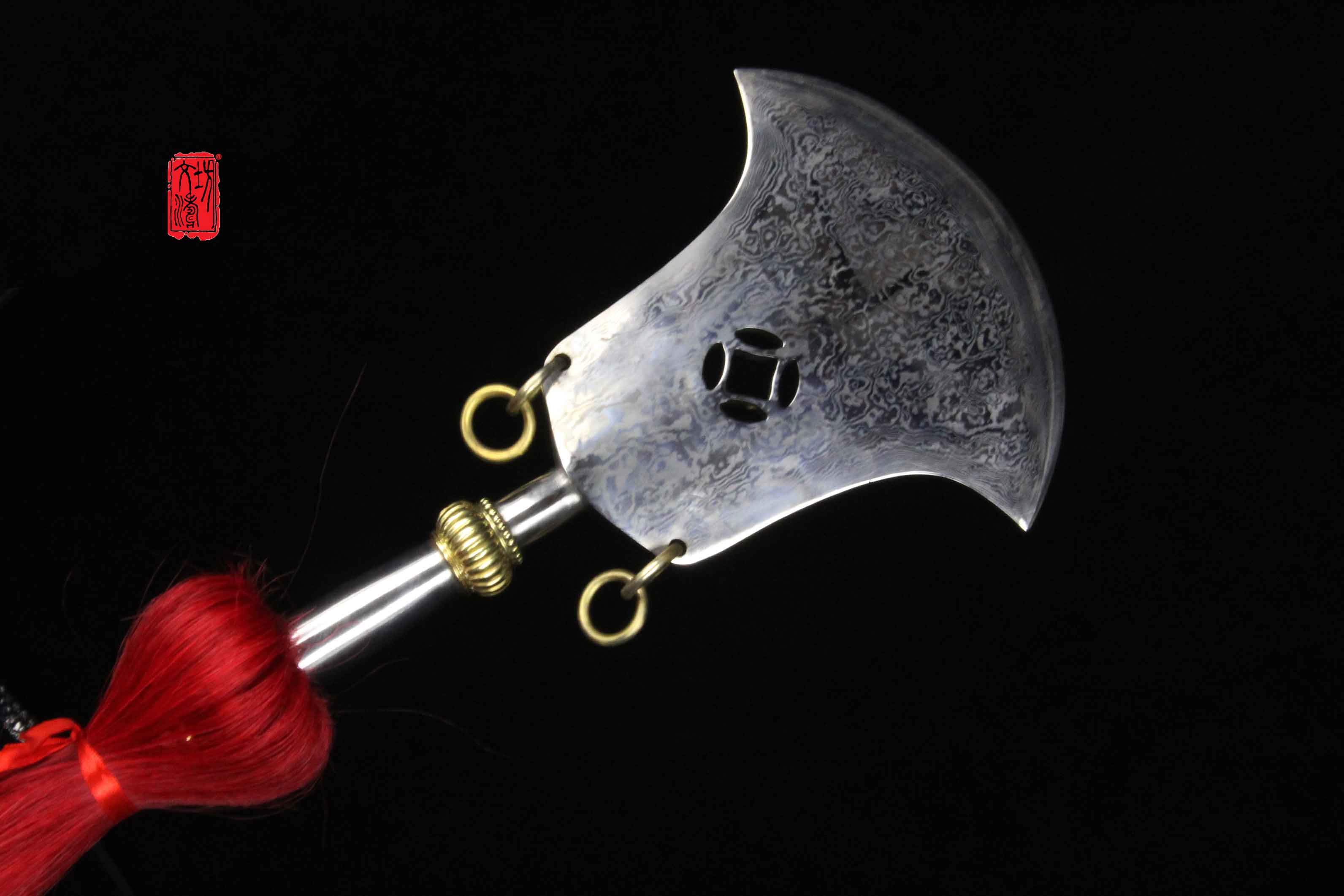 斧与钺是罕见的兵器,斧钺在古时候是不分的,长柄巨斧名为钺,也叫大斧,长达2.66米。《古今注》载:“金斧黄钺也,铁斧玄钺也,三代通以断斩”。但由于使用方法的不同,斧和钺还是有所区别的,凡在斧背上有钩或斧上有枪刺者,即为钺。