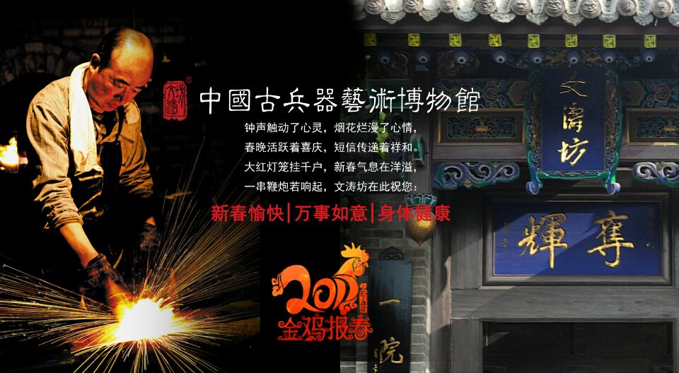 大家好!欢声辞旧岁,笑语迎新年。作别不平凡的2016,迎来了充满吉祥的鸡年。在这个春潮涌动、万象更新的日子里,“中国古兵器艺术博物馆”馆长刘文涛,携全馆员工向长期给予我们巨大支持的广大藏家、铁粉致以最诚挚的新年祝福,对支持古兵器文化发展的各级政府部门致以最衷心的感谢!祝大家新年快乐!身体健康!万事如意!鸡年大吉!