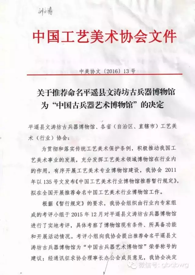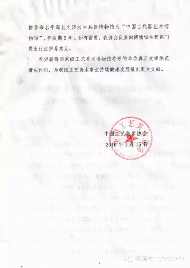 3 2016年01月15日,获评“中国古兵器艺术博物馆”殊荣。 争取“国字号”不易,守护好、发展好“国字号”更不易,文涛坊人将更好地传承、弘扬、传承古兵器传统文化,进一步提升平遥文化旅游的社会效应和经济效益.