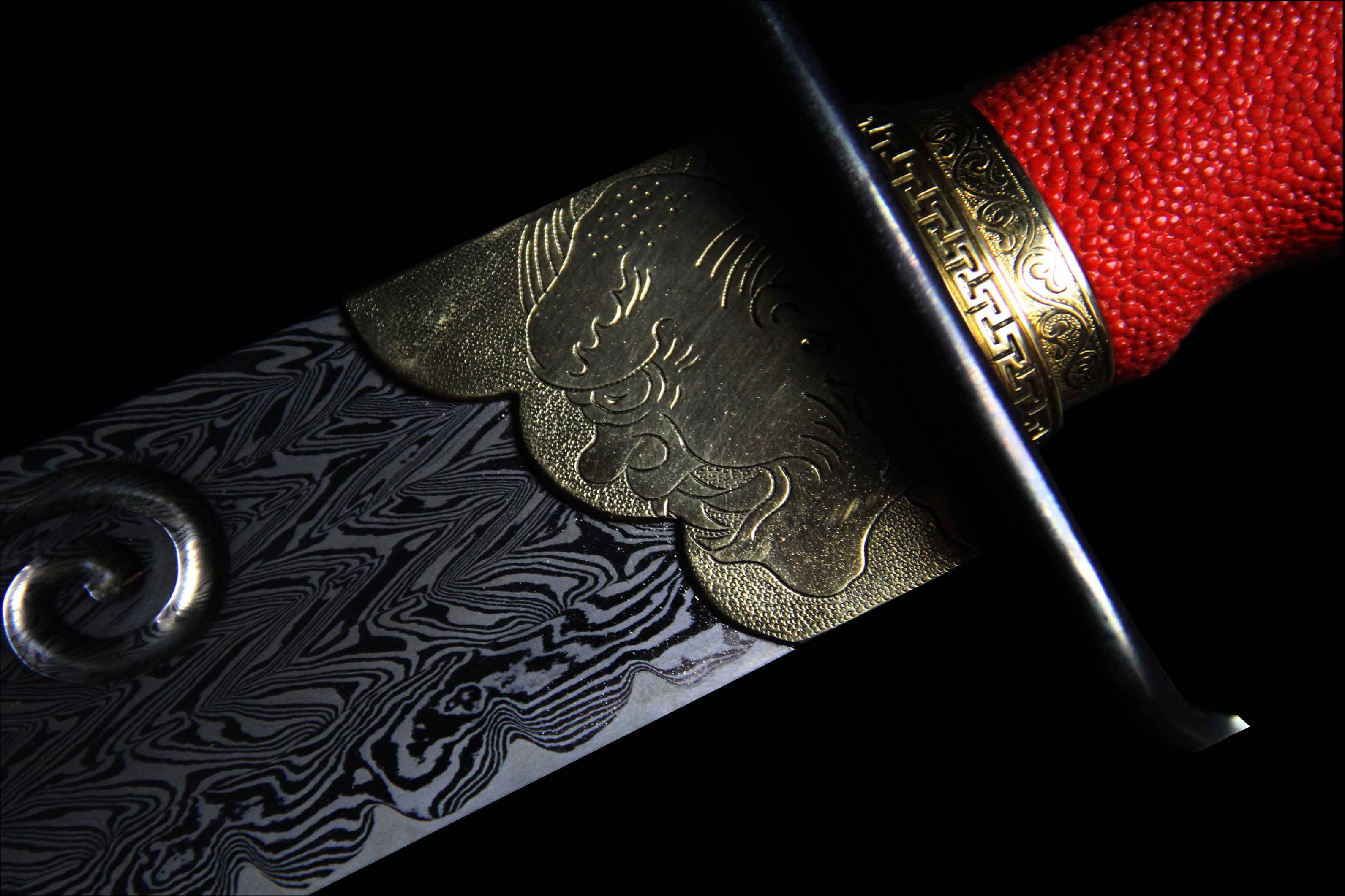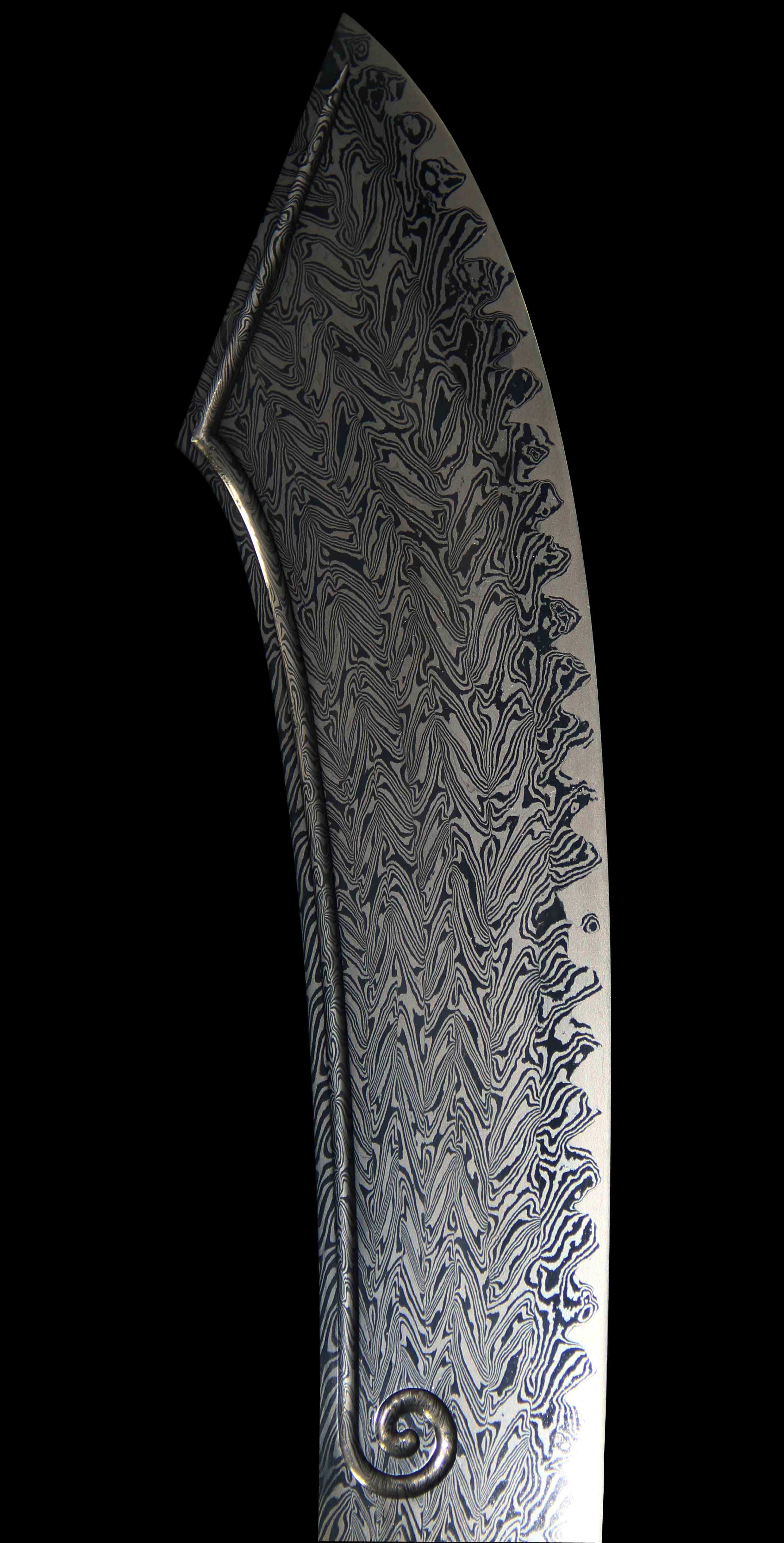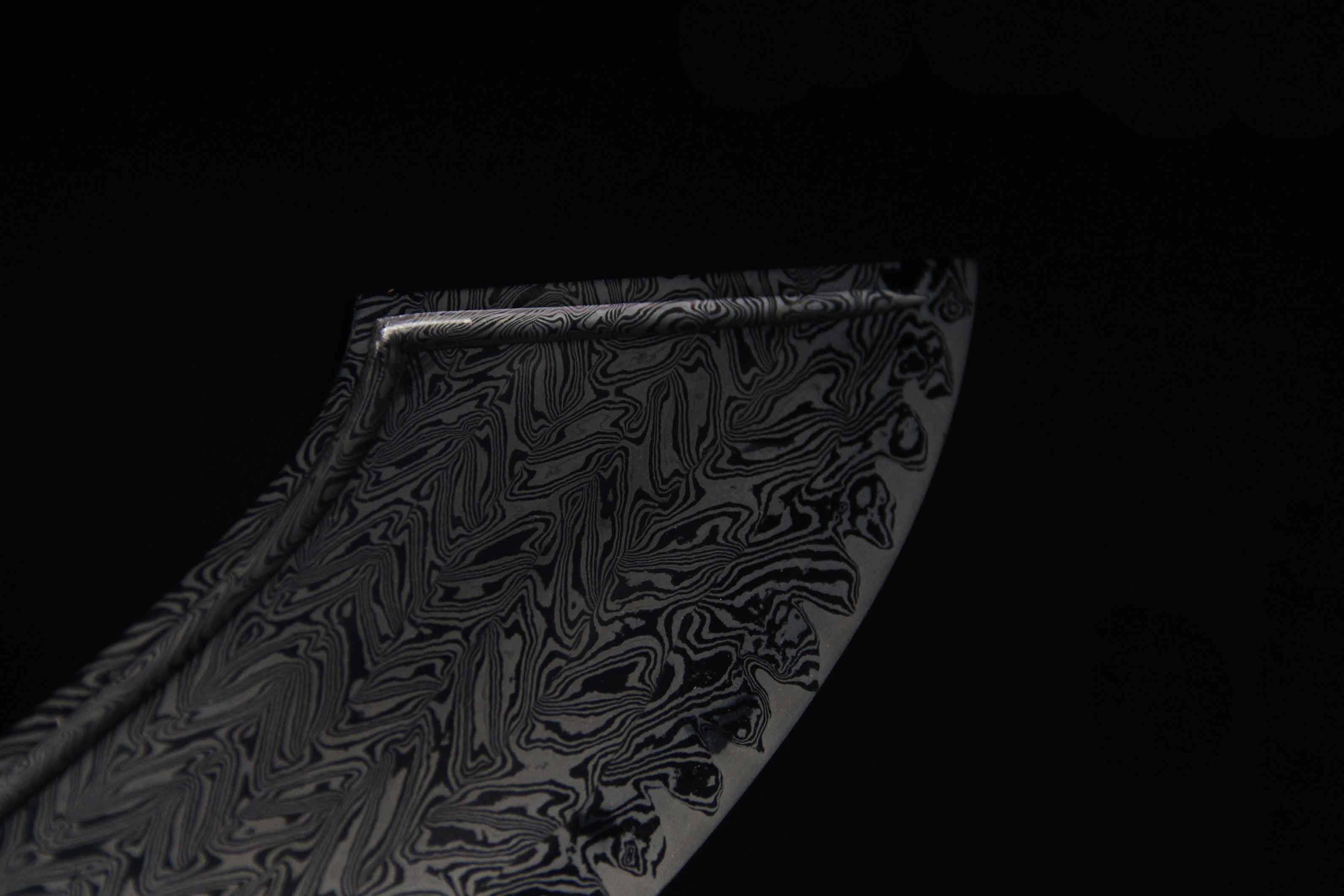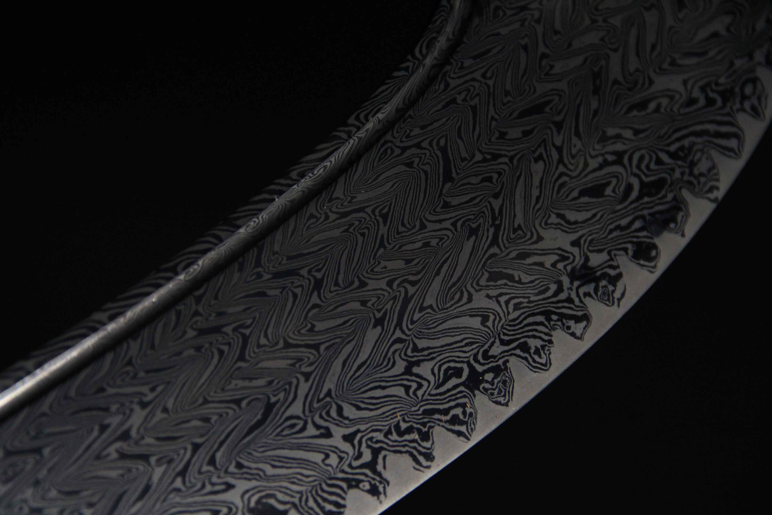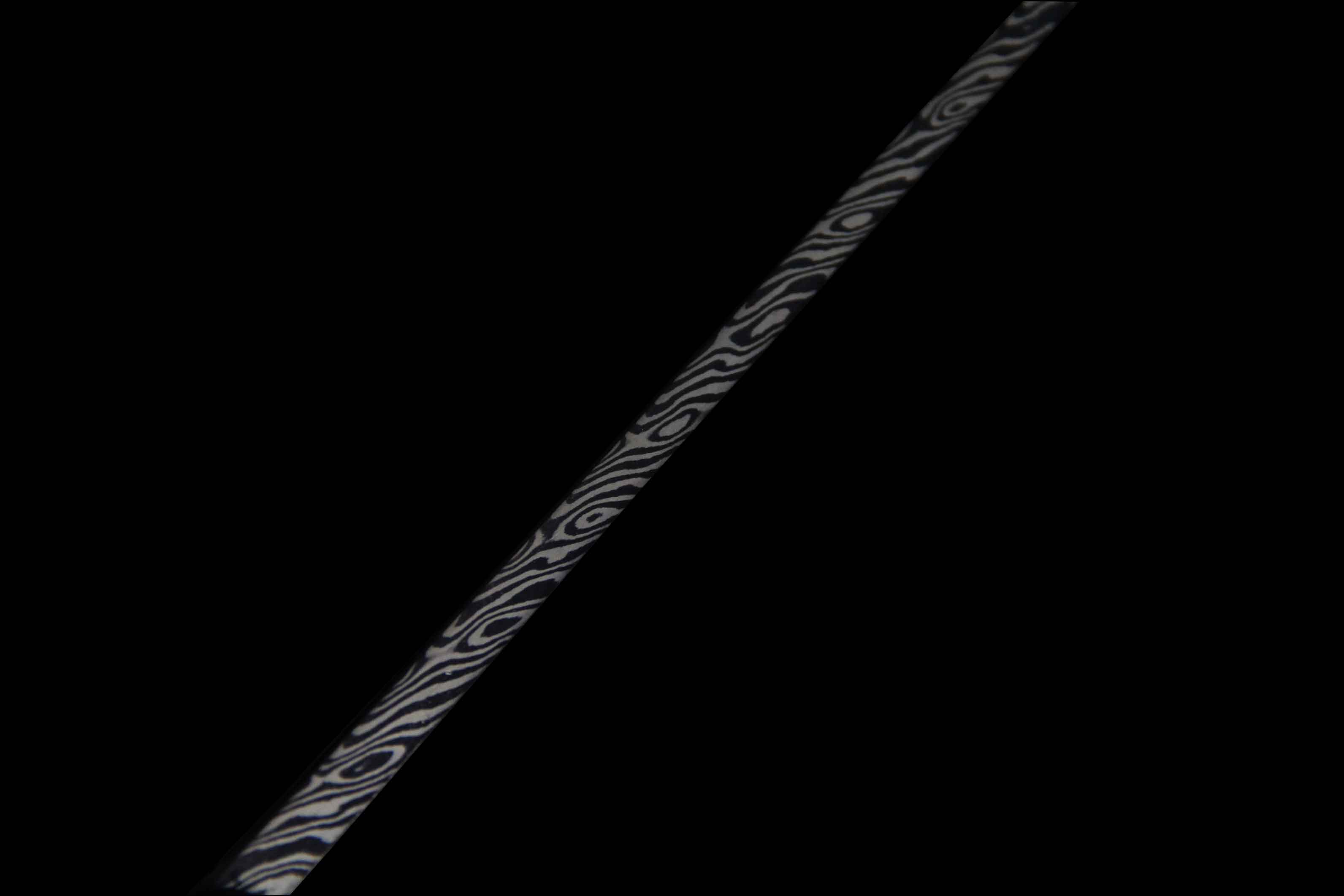 刀身材质由文涛坊特制自炼钢与高碳钢折叠锻打而成的花纹钢,采用特殊锻造方式而成旋焊纹,刃部马齿嵌钢,硬度极佳,体现极高的锻造工艺。研磨历时一月左右完工,耗时费工,花纹绚丽。刀身宽厚,开卷云纹血槽贯通刀体,气势不俗。
