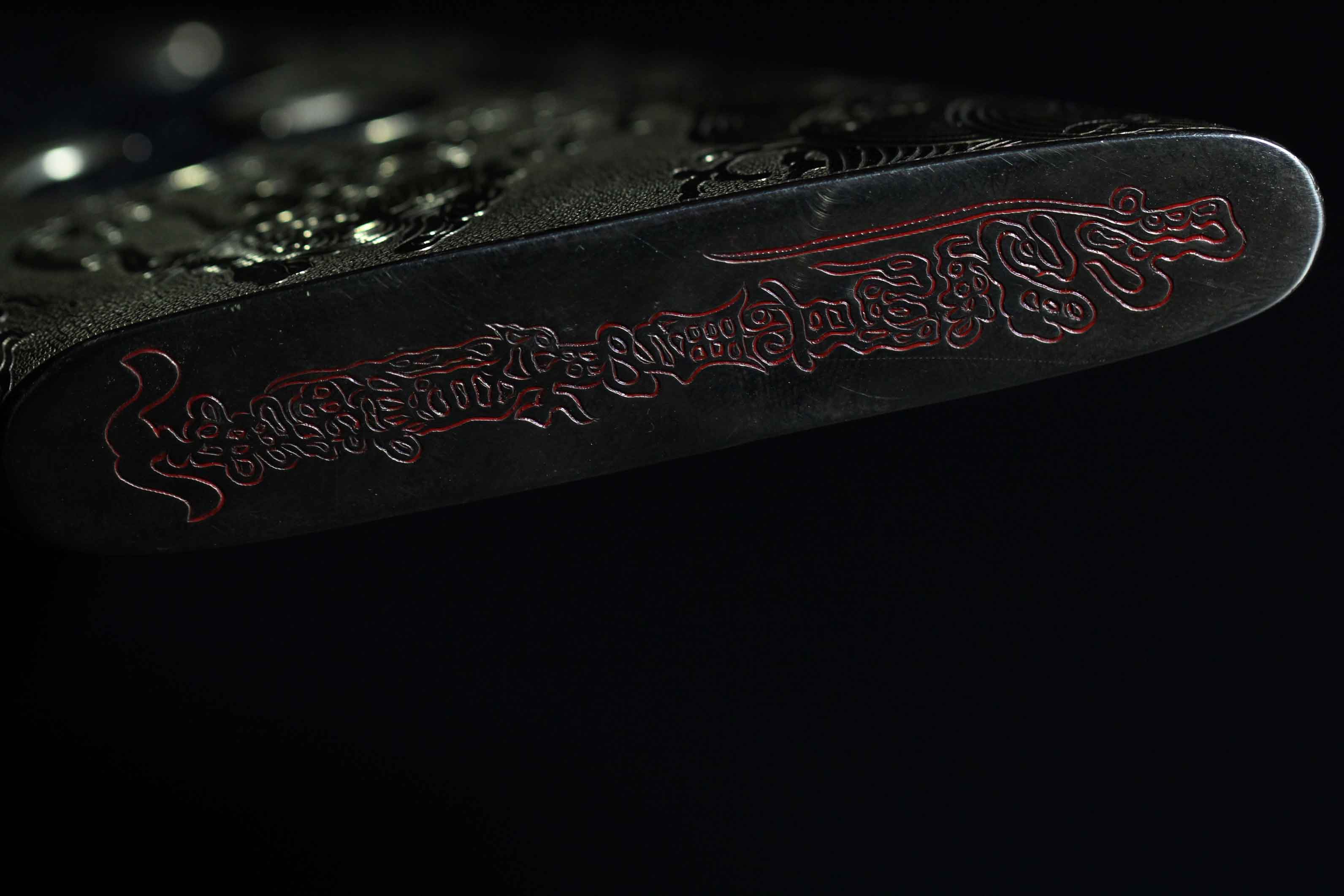 鞘尾底部阴刻吕洞宾的一道符,内部填充朱砂,寓意镇宅辟邪!