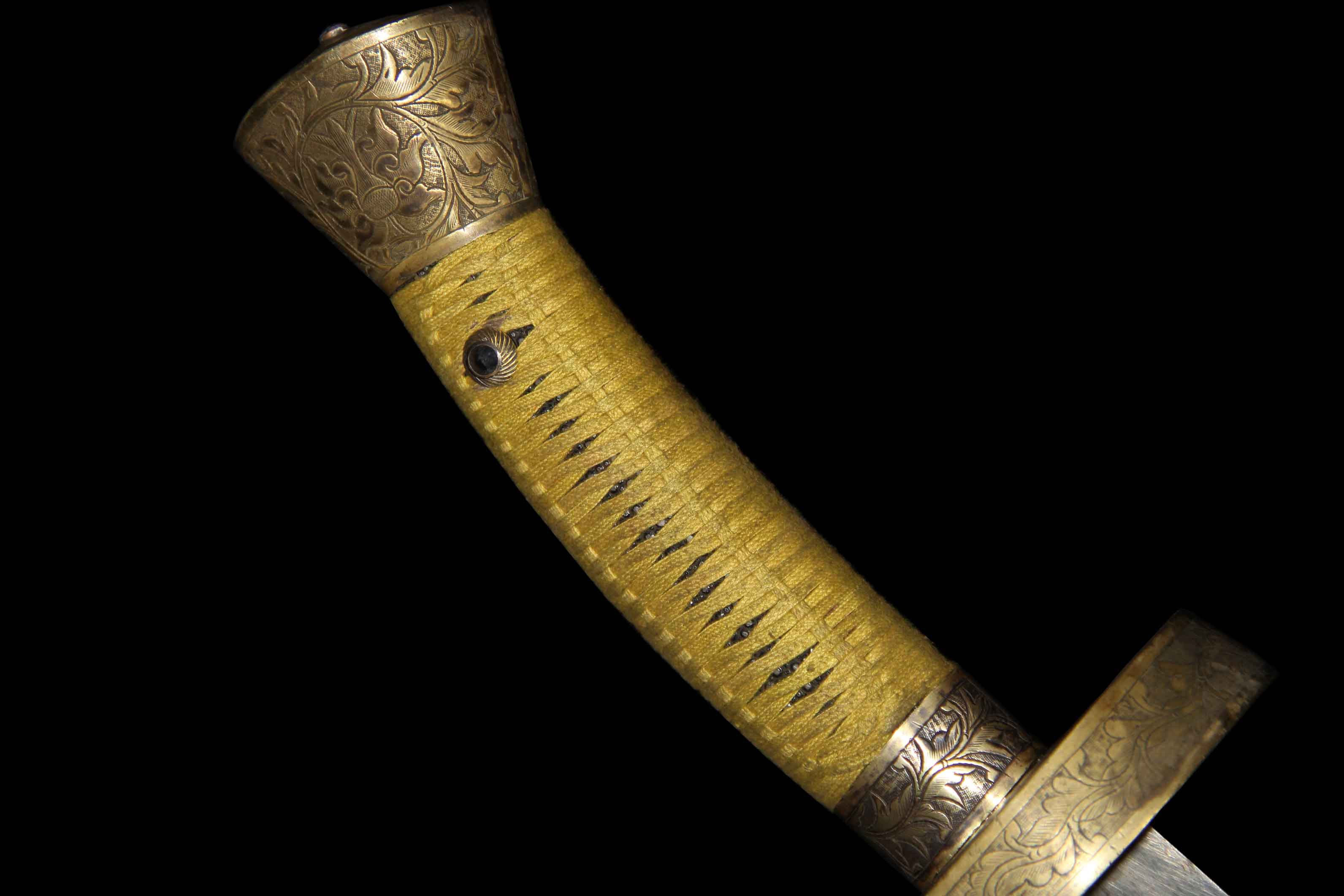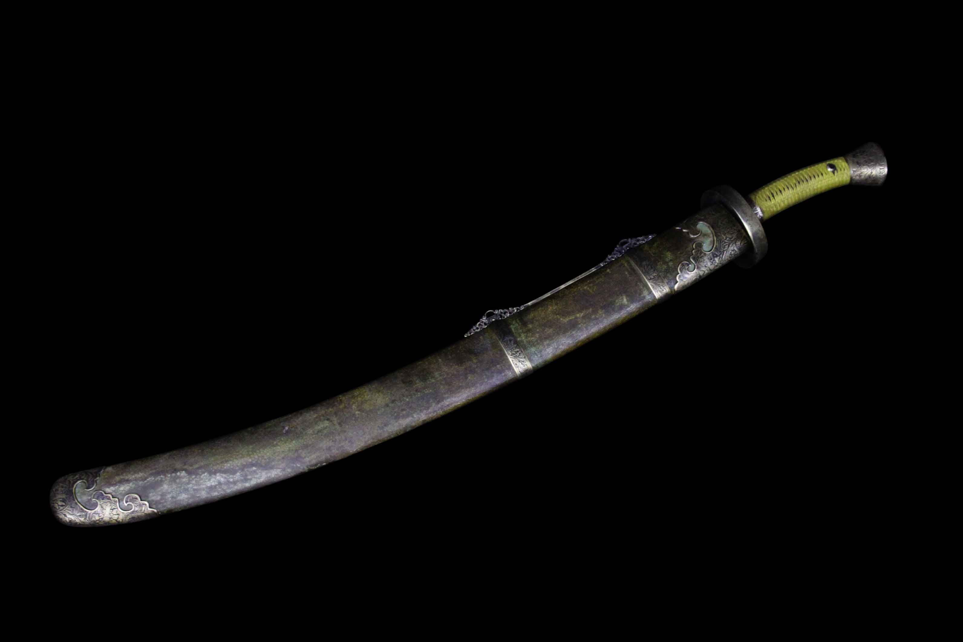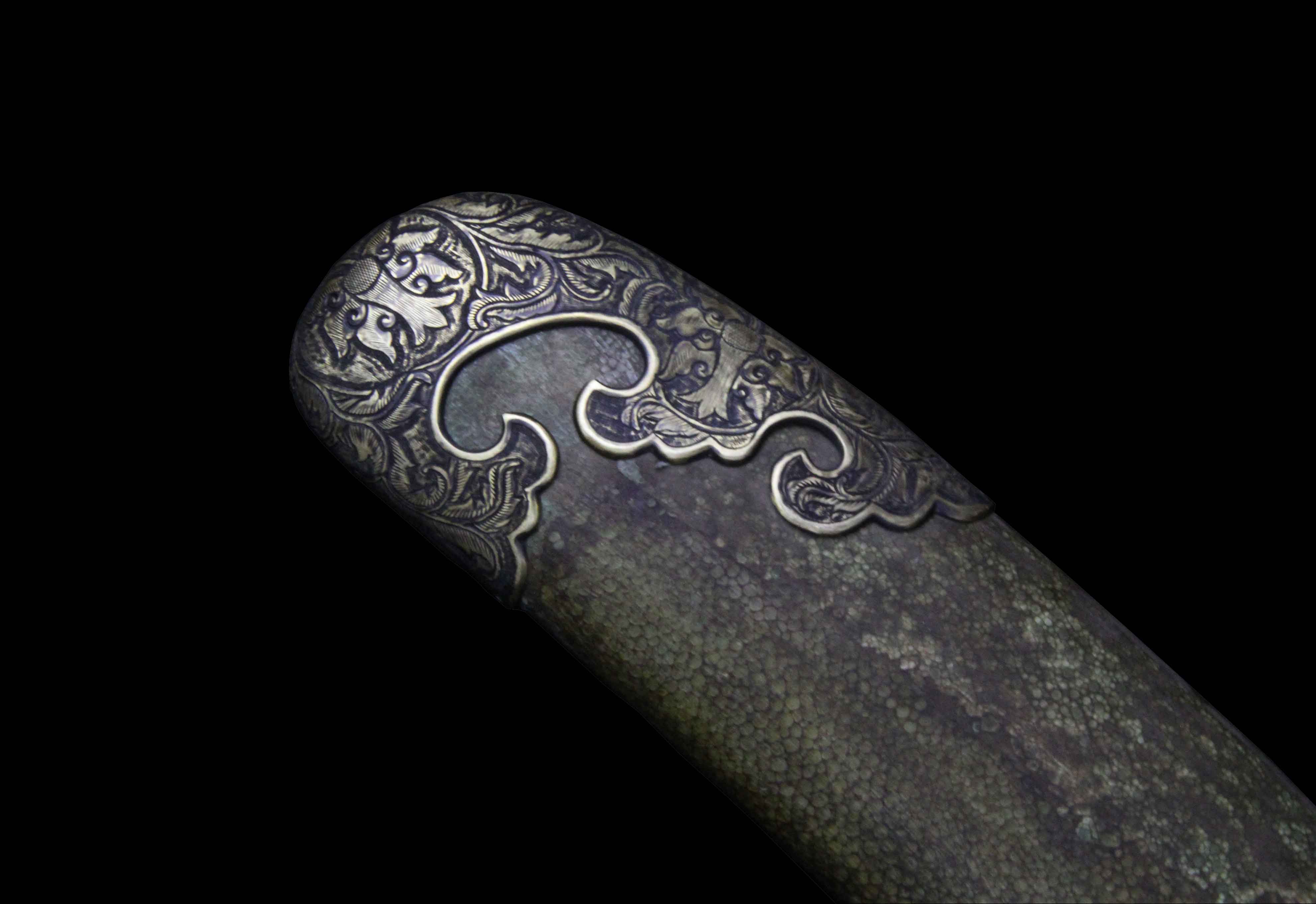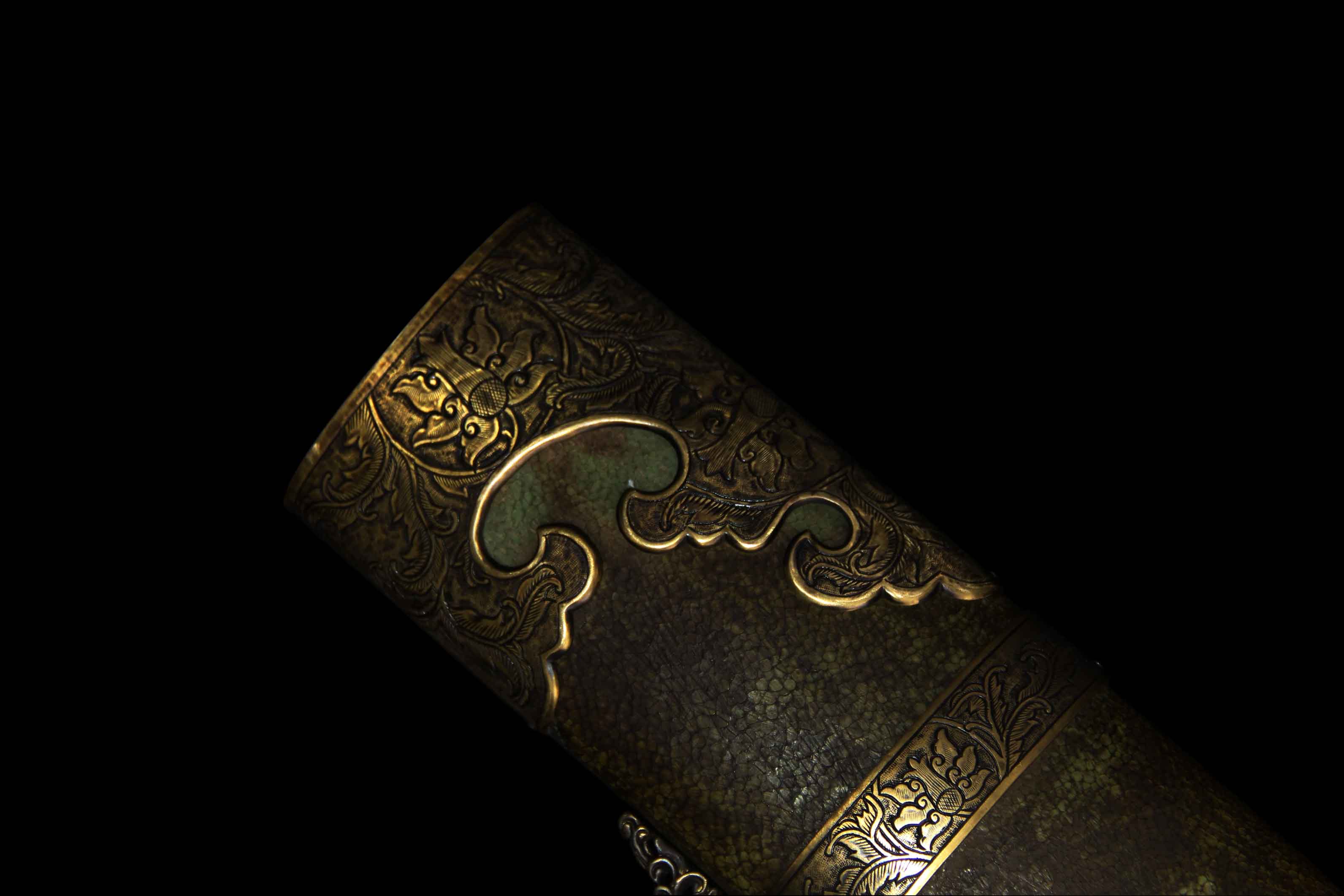 鞘口、鞘尾、提梁手工錾刻穿枝莲。莲花雕刻生动,笔法细腻。完工后,历时两月进行做旧、盘磨。