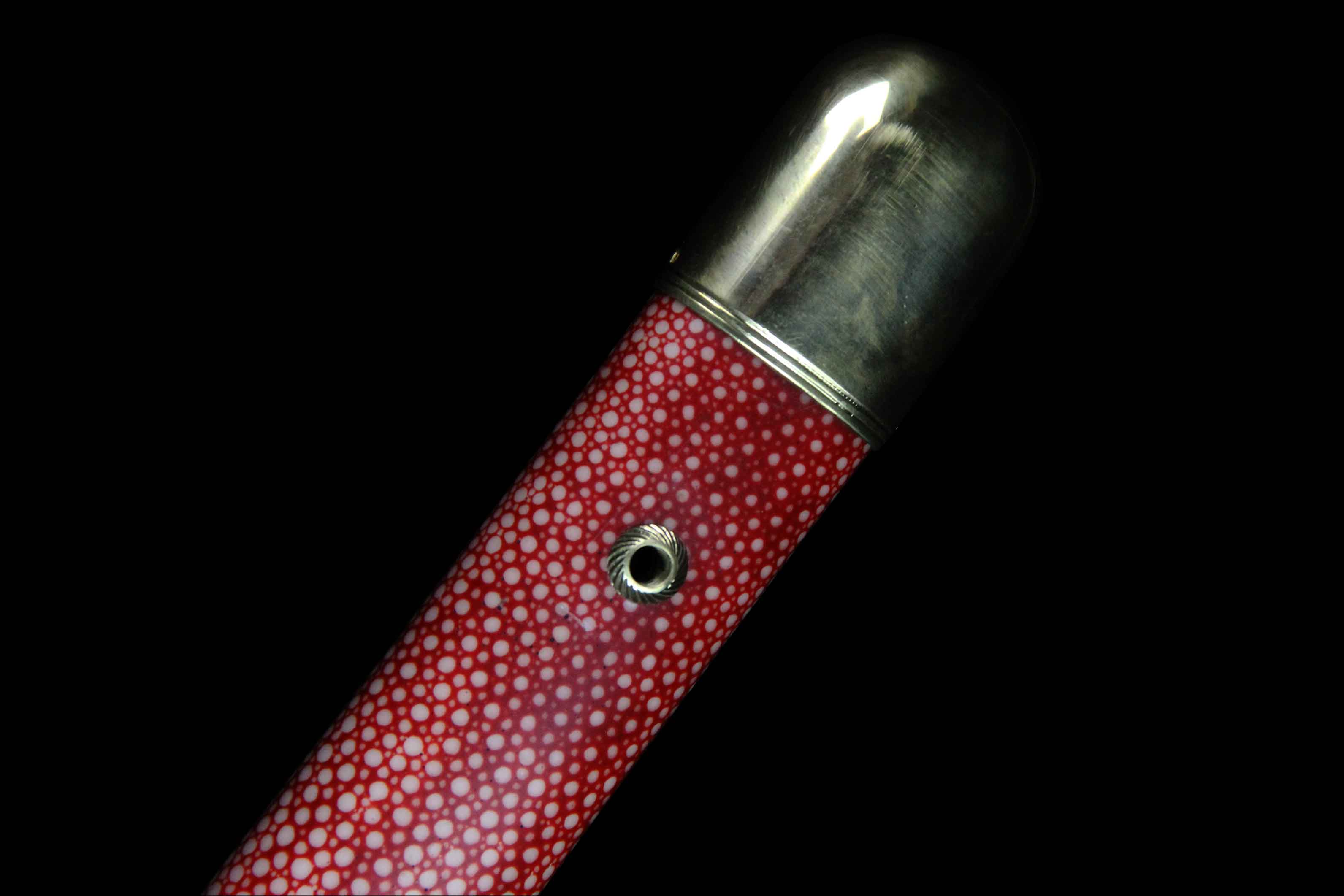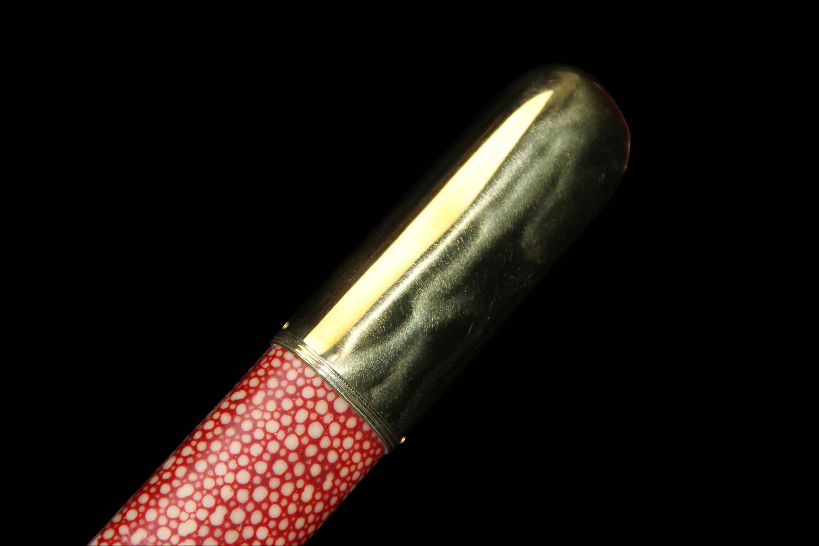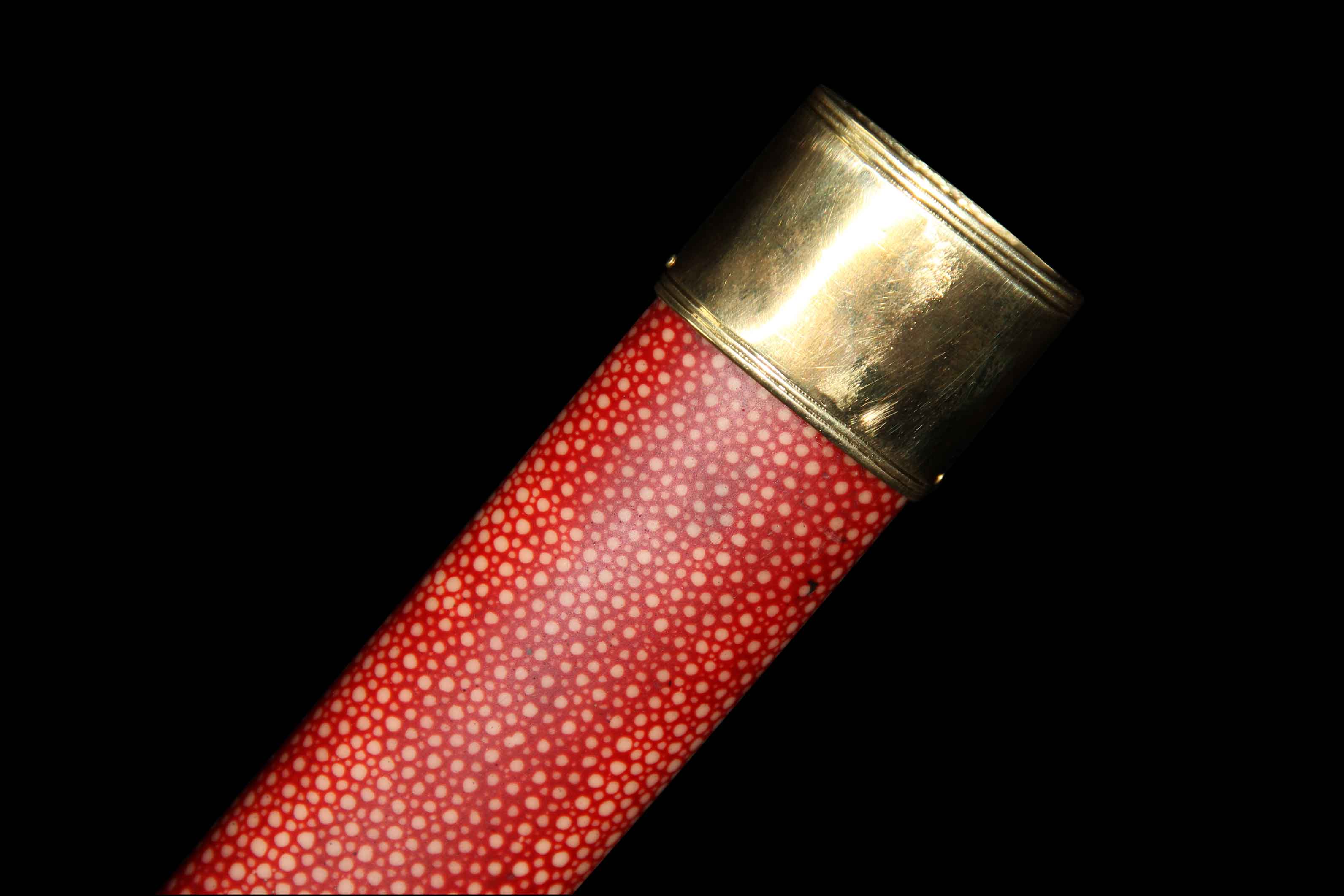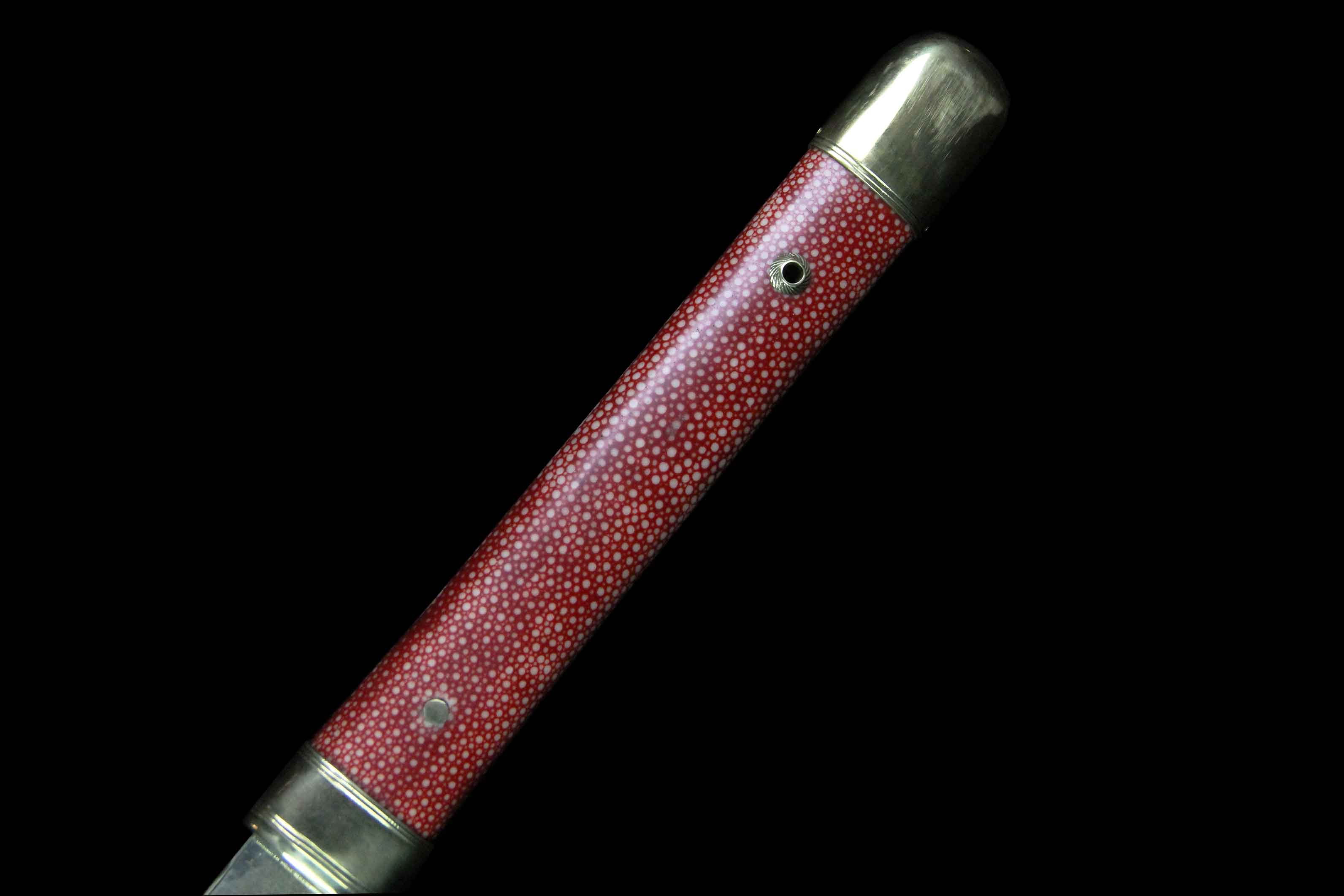 装具为手工素铜装边缘起双线,鞘为珍珠鱼皮上红色大漆。