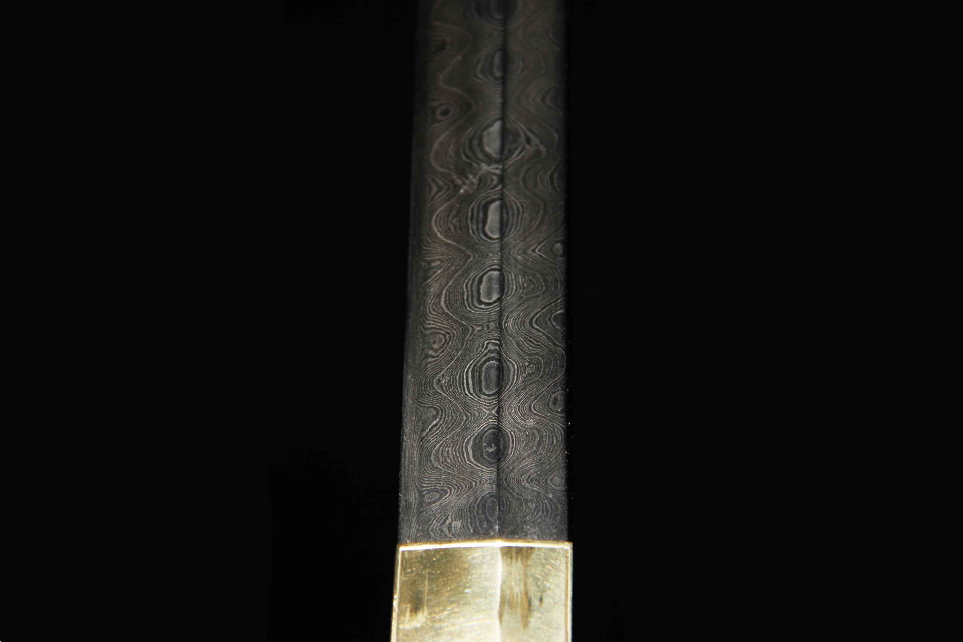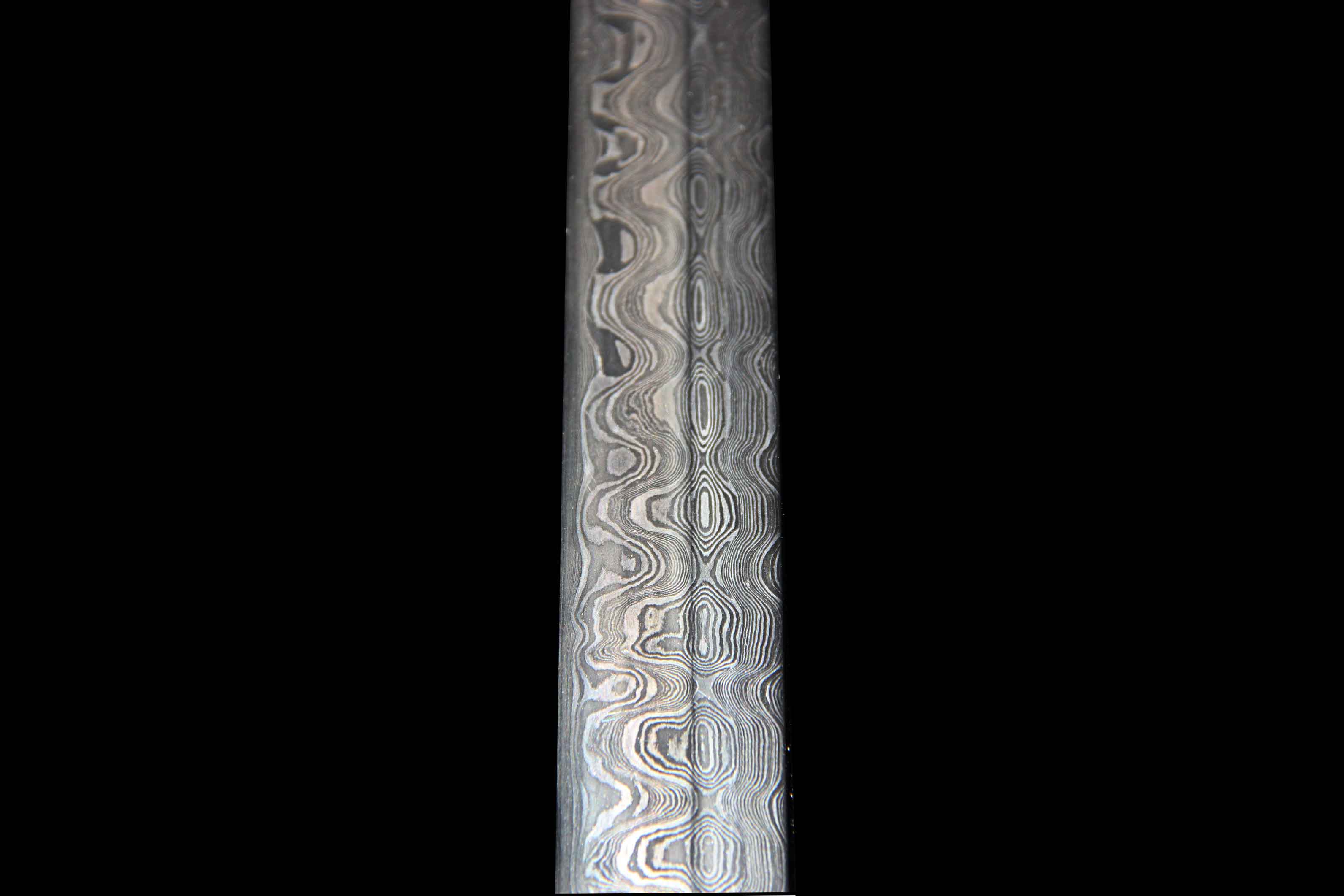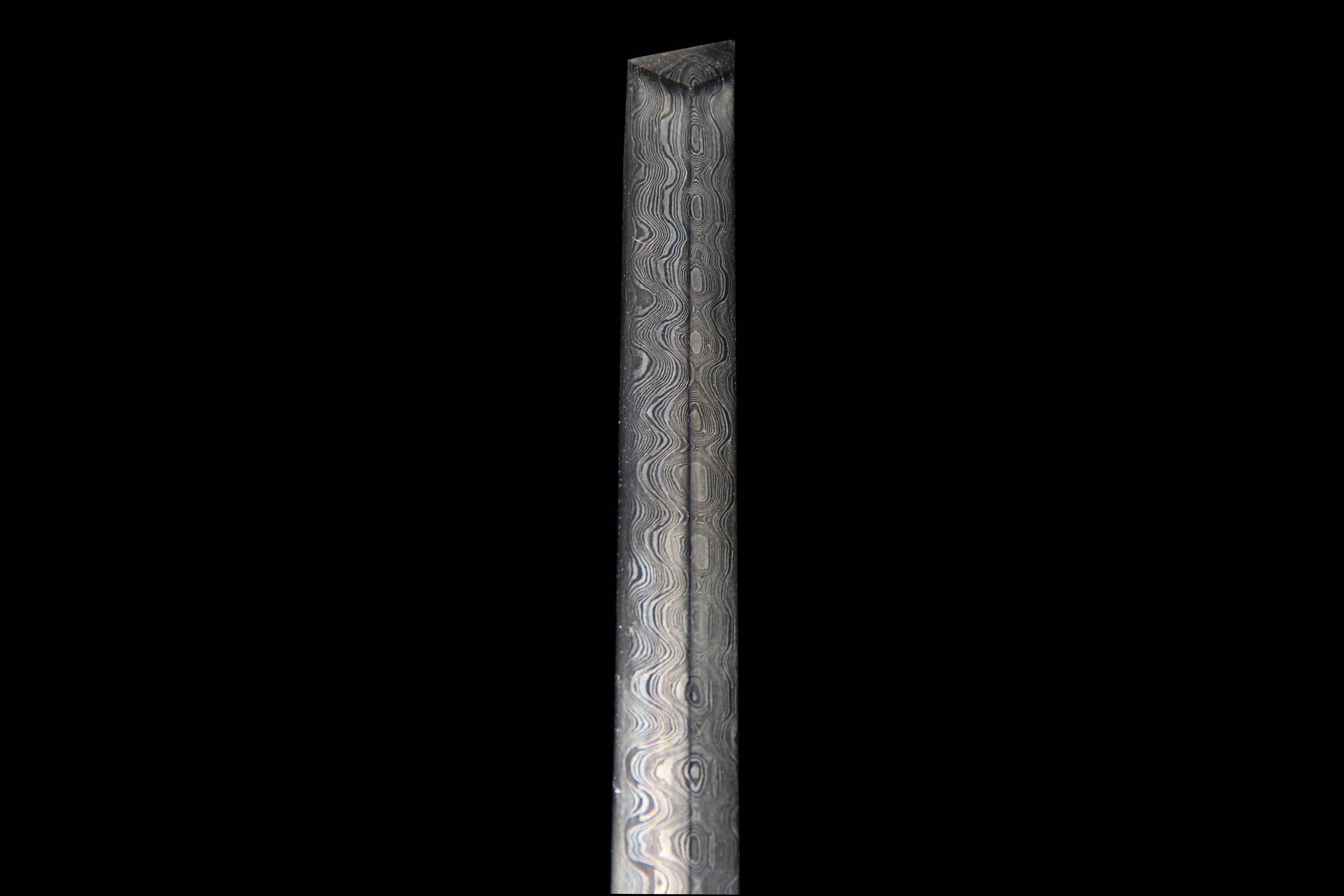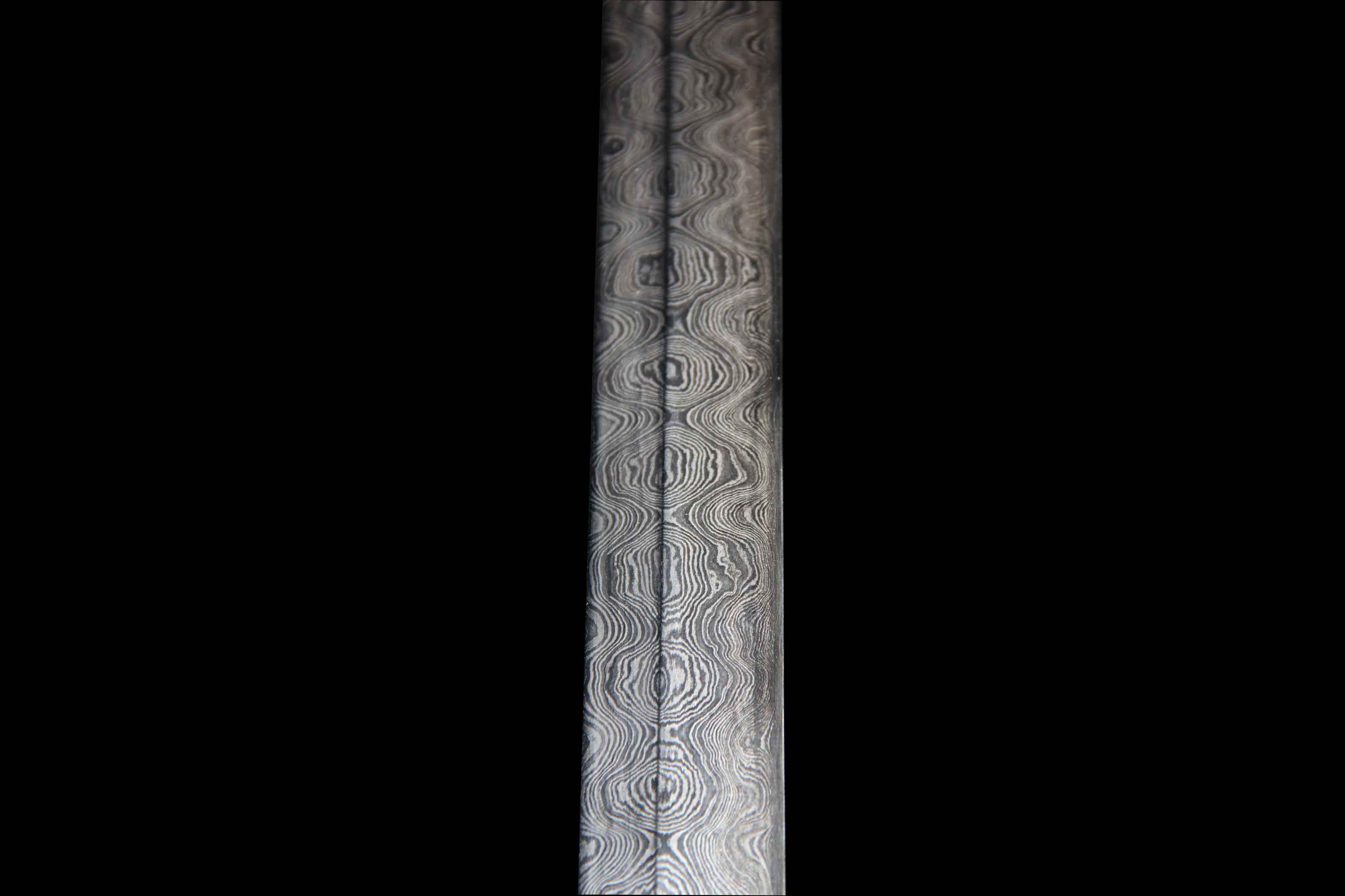 刀身材质为高碳钢与自炼土钢折叠锻打花纹钢,子夜淬火,刀身起脊,适合大力劈砍。经十七道工序精度研磨而成,花纹绚丽多彩,呈龟背纹。