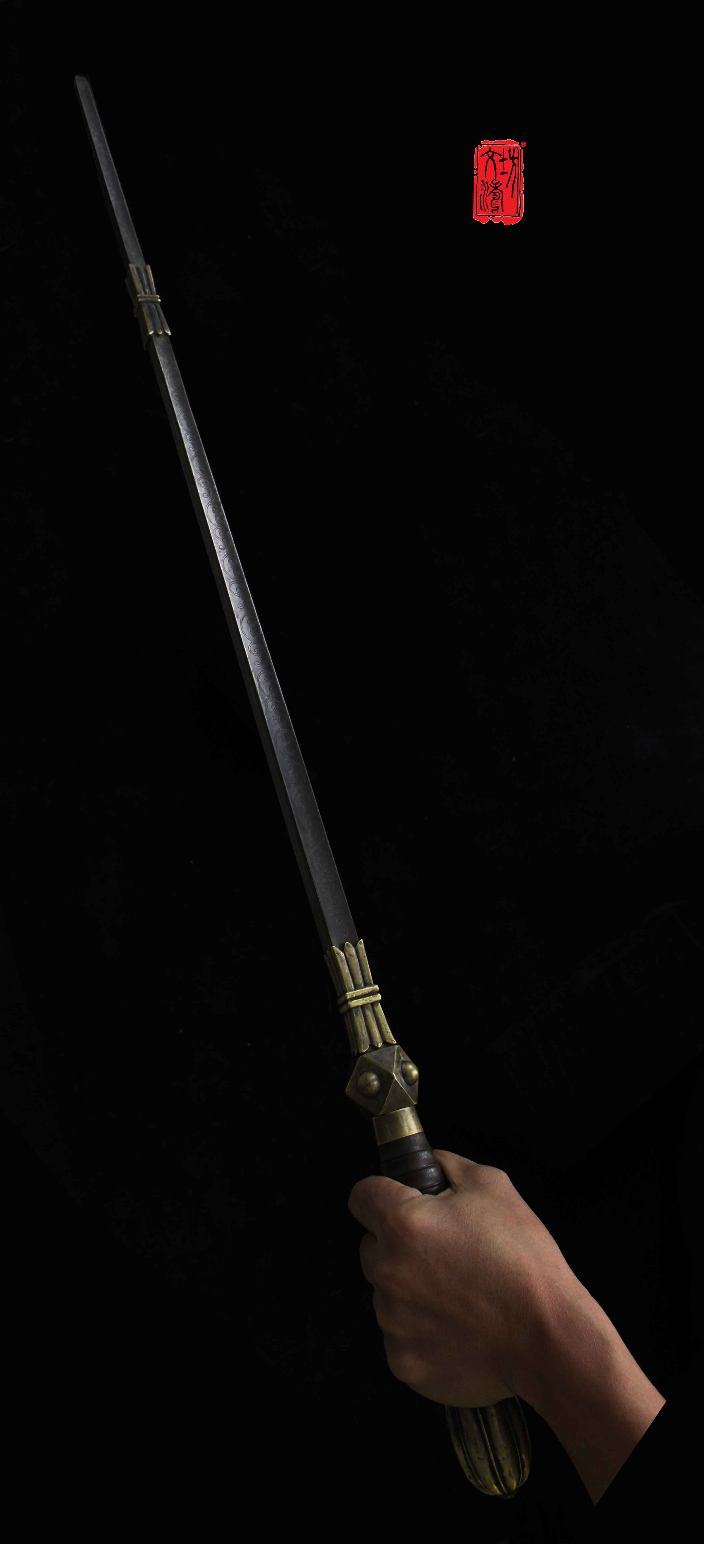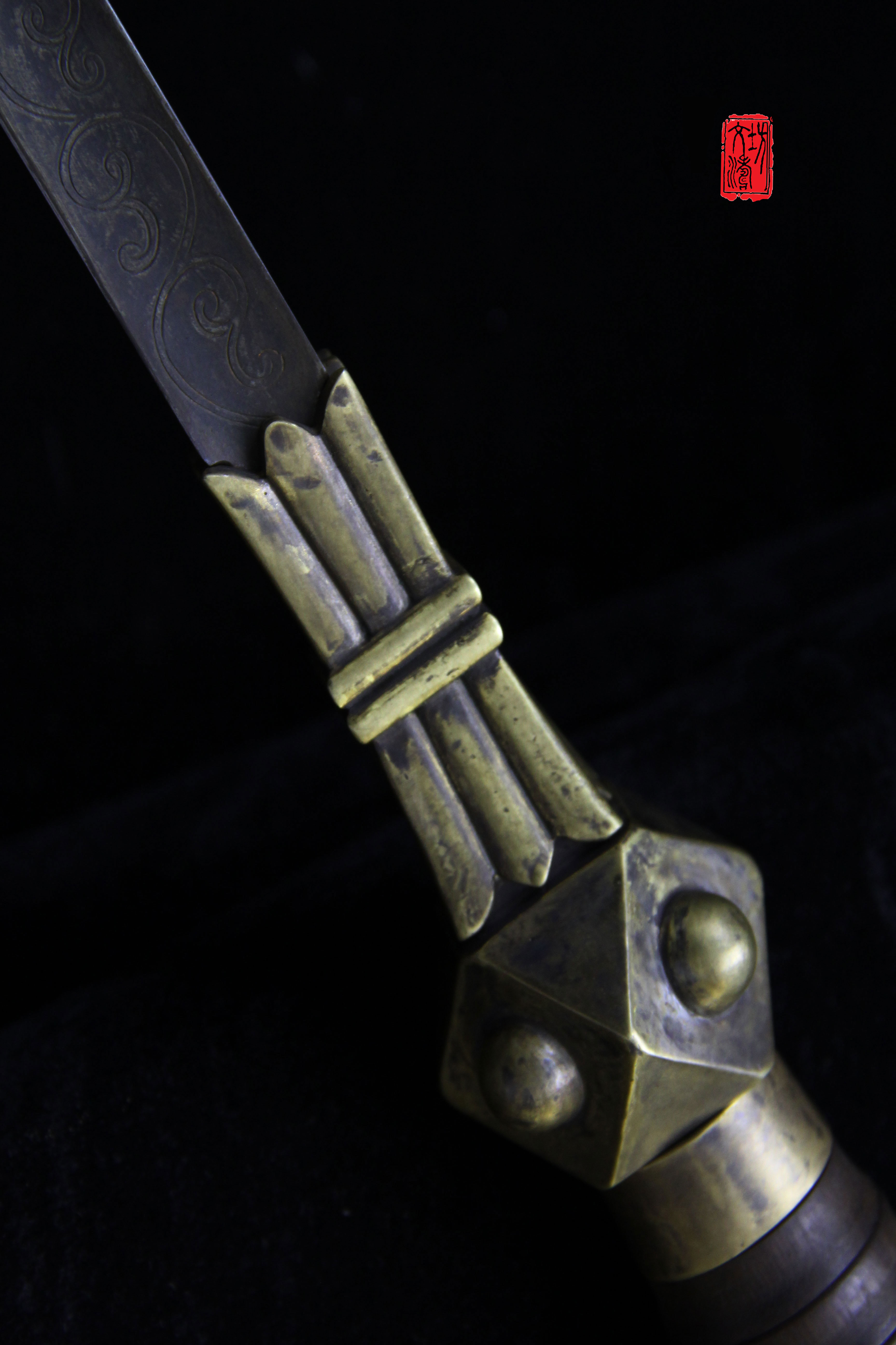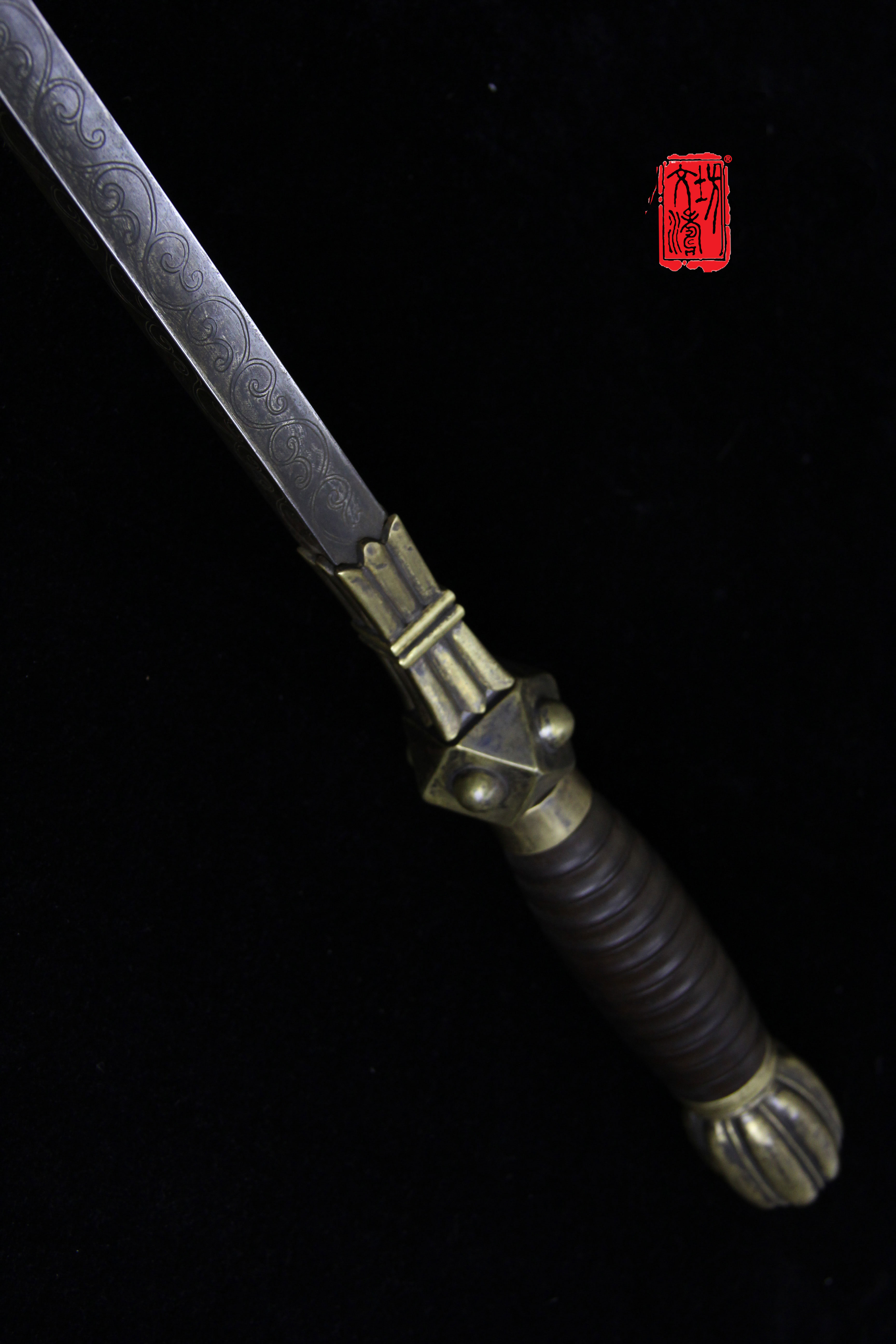 锏,无刃有四棱刚直不阿,锏体四面成瓦面开凹槽,采用两种钢折叠煅打而成,水磨成型,多面乳钉护手前和锏体中部分置两朵束莲雕饰,寓意高雅与自律。