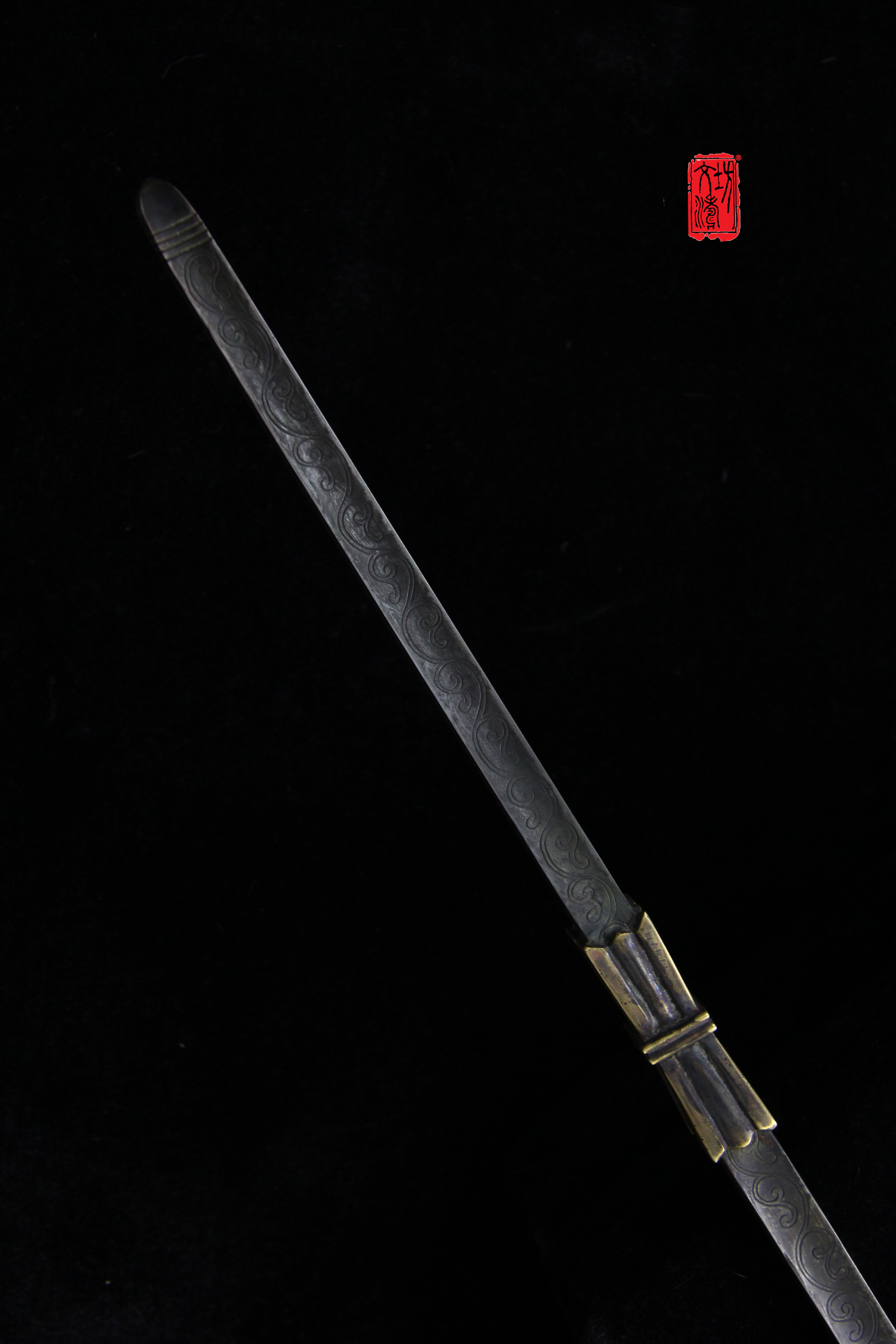 纯手工阴刻的缠枝花贯穿整个锏体。柄首做瓜棱状,手柄为硬木竹节型,古朴典雅。此锏修长大气,可闲情把玩与实用并存。