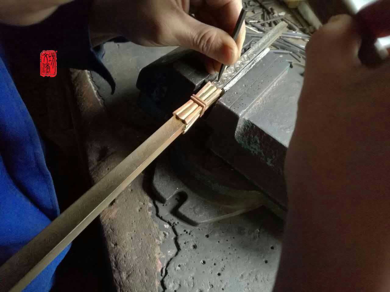 此钢锏为中国非物质文化遗产锻造技艺第六代传人刘文涛大师,参照中国古兵器艺术博物馆馆藏历代古锏实物资料,结合中国传统文化元素精心设计制作,历时九十天完工。
