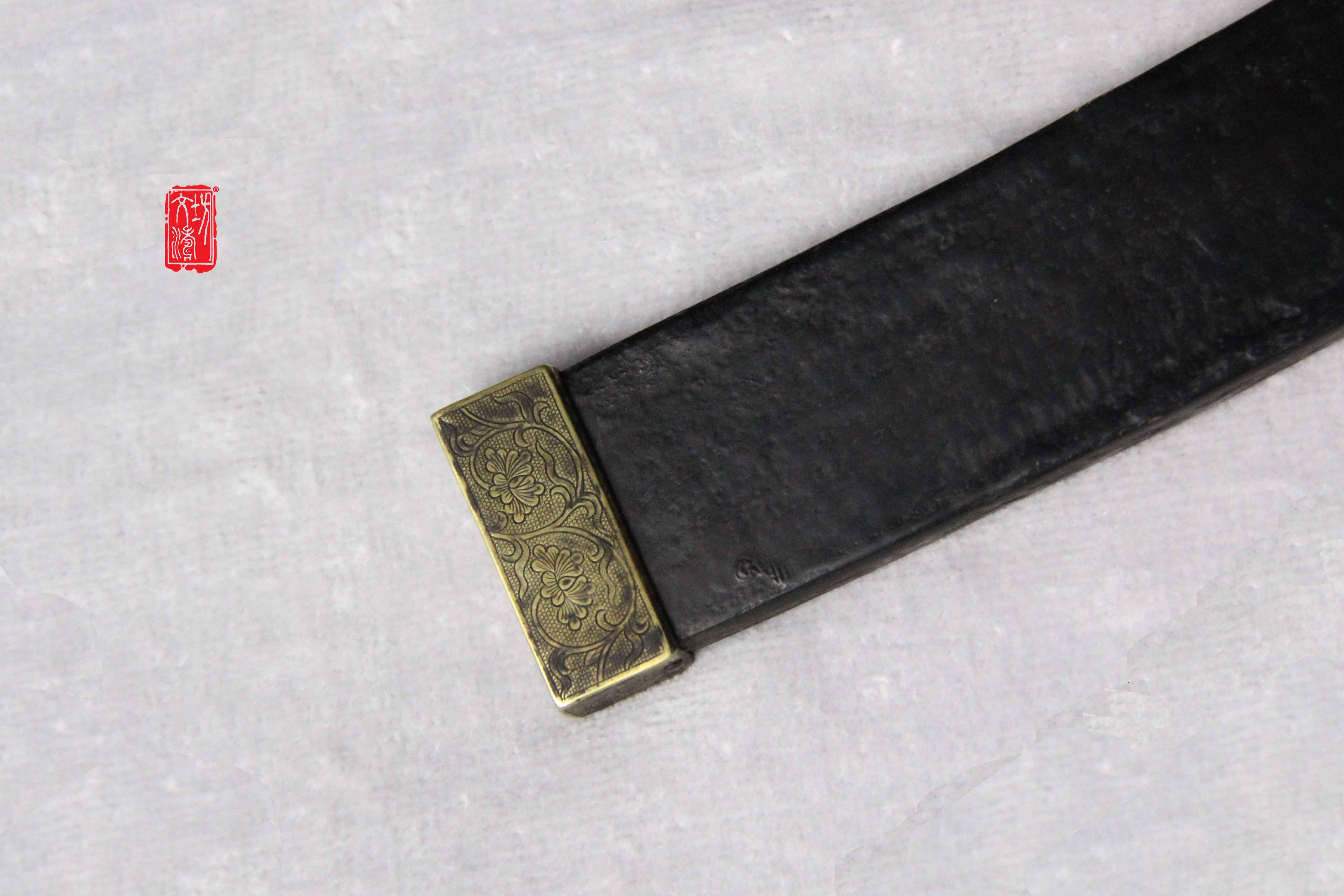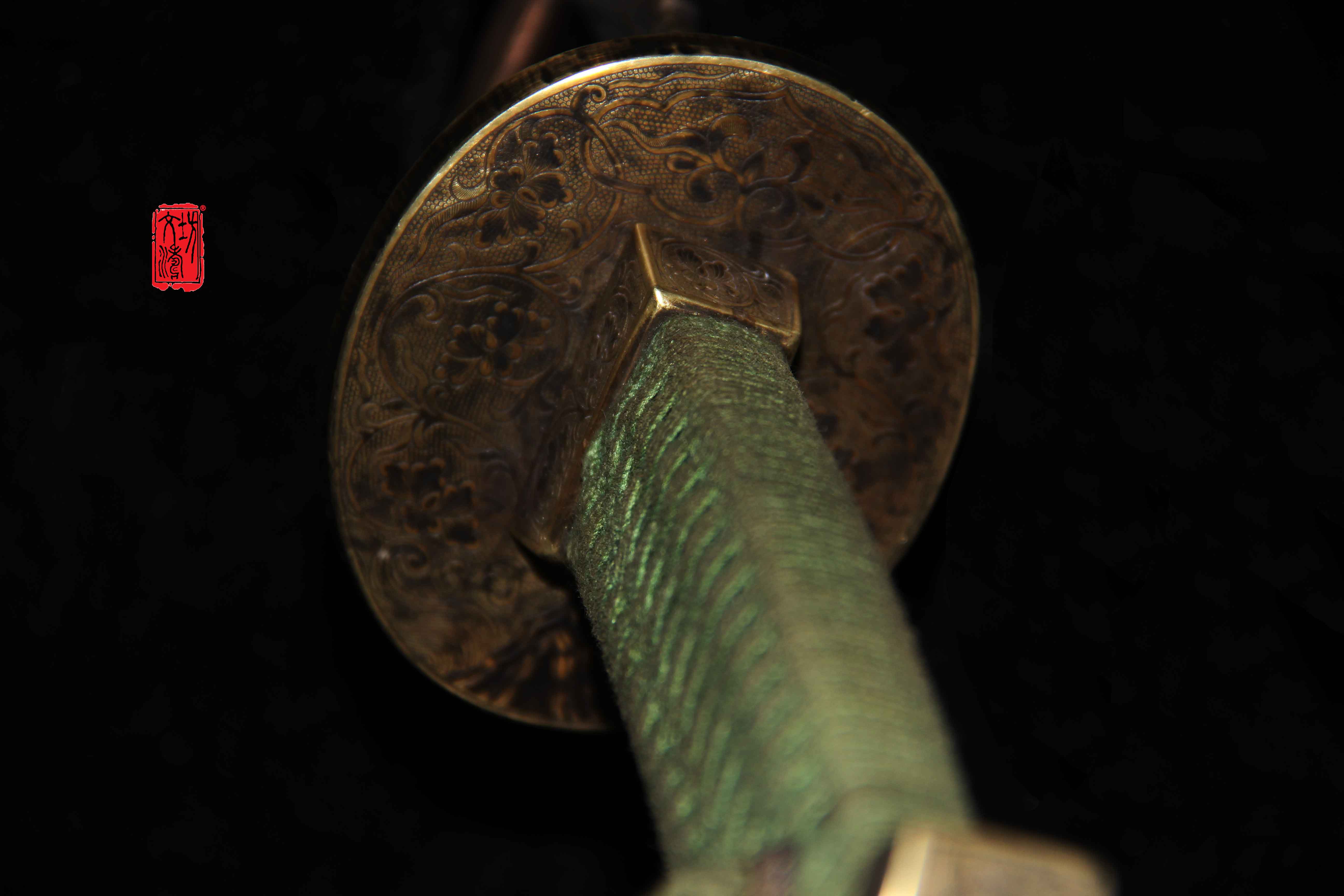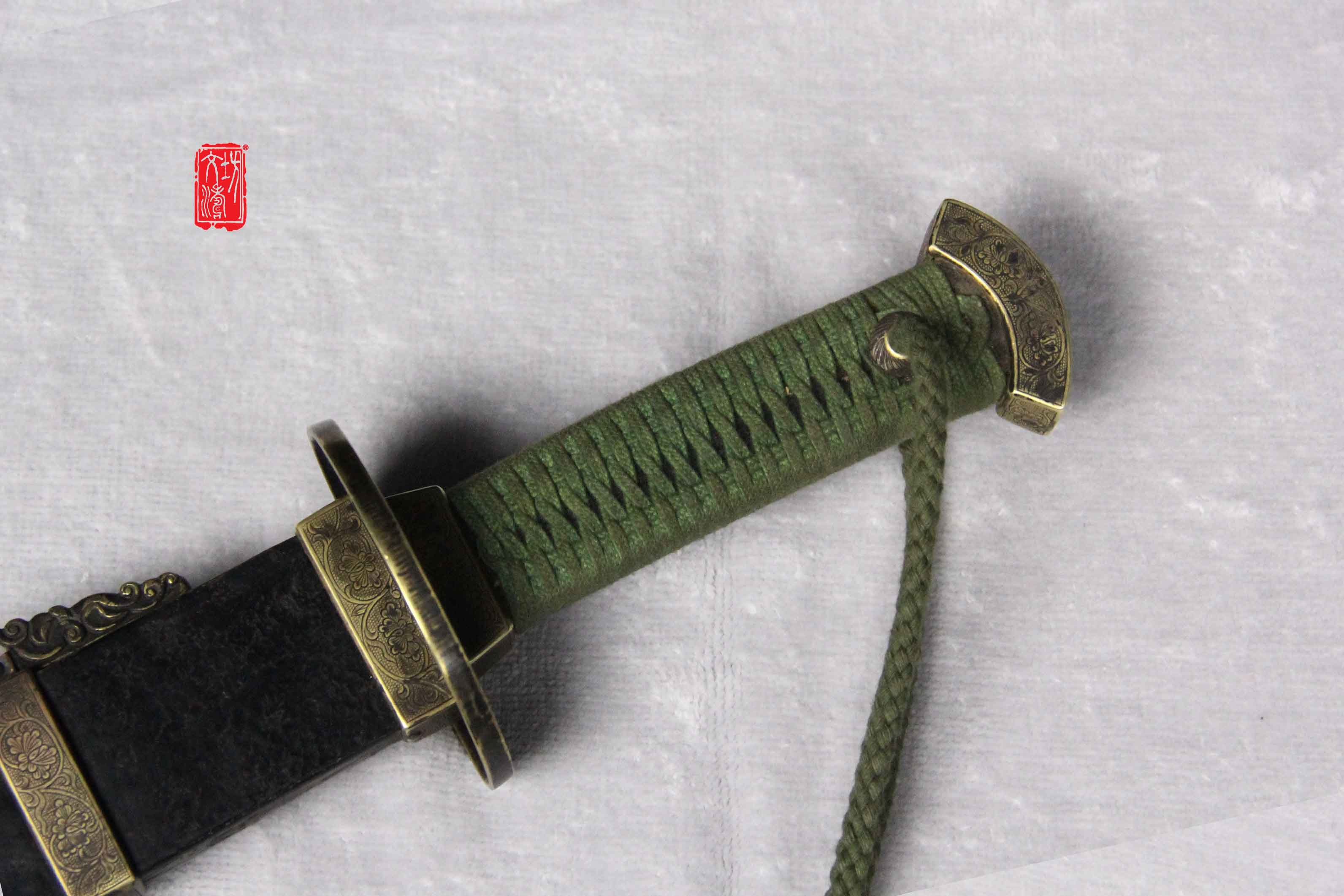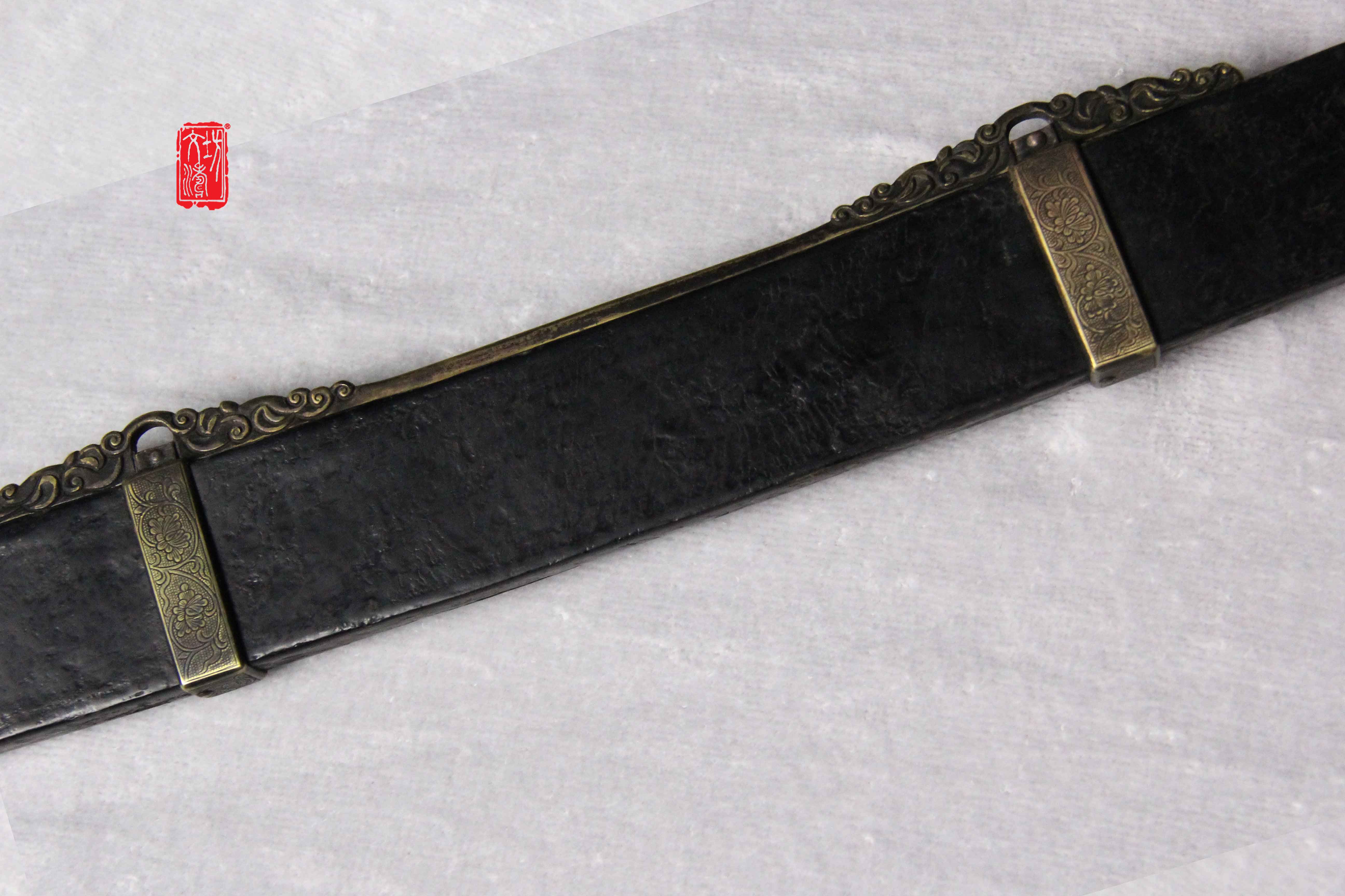 刀装阴刻穿枝牡丹纹打鱼籽地,护手为椭圆型挡型,雕刻生动细腻,整体做旧后盘磨,具有当时风格。刀鞘为软木包大漆皮,更显古朴。