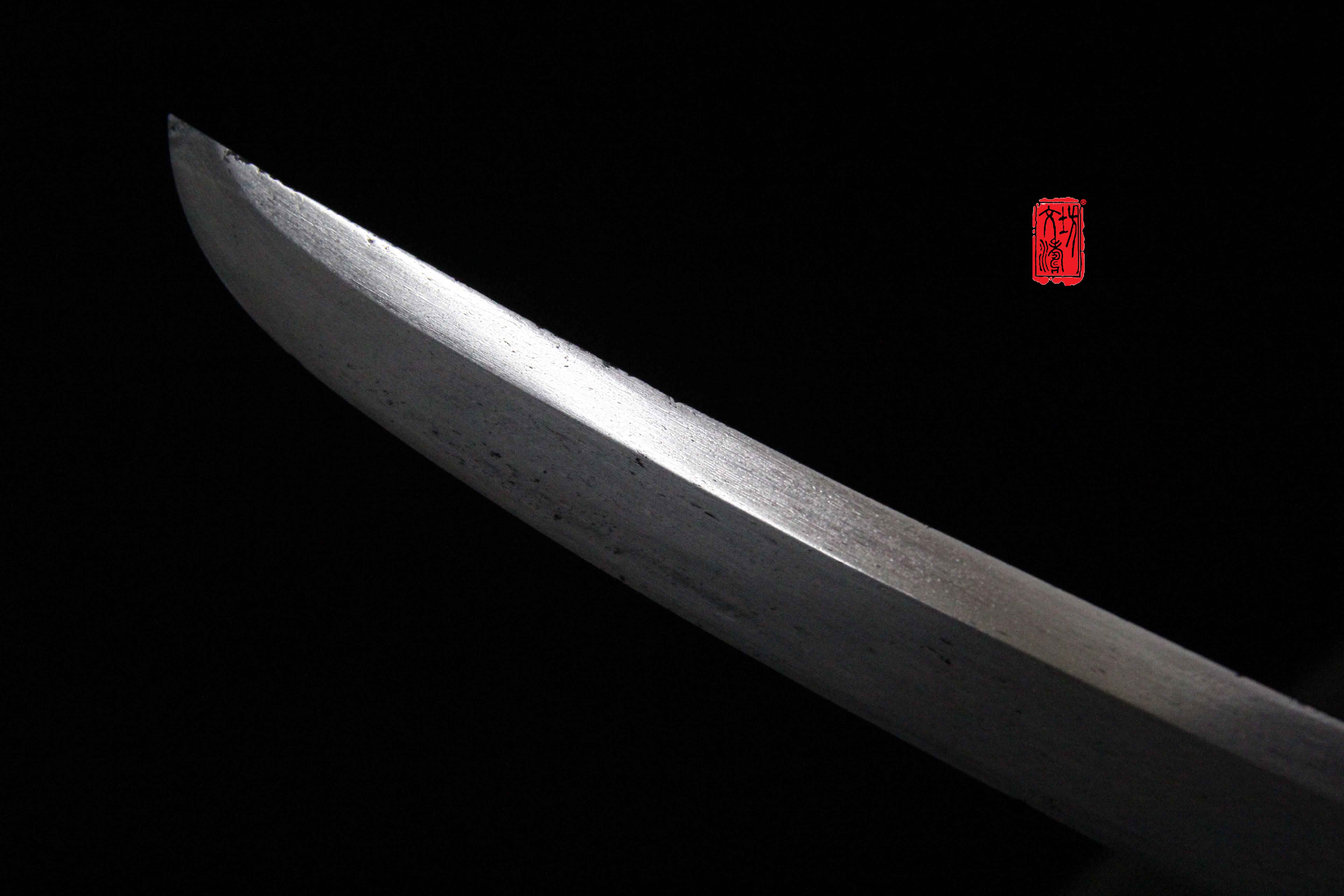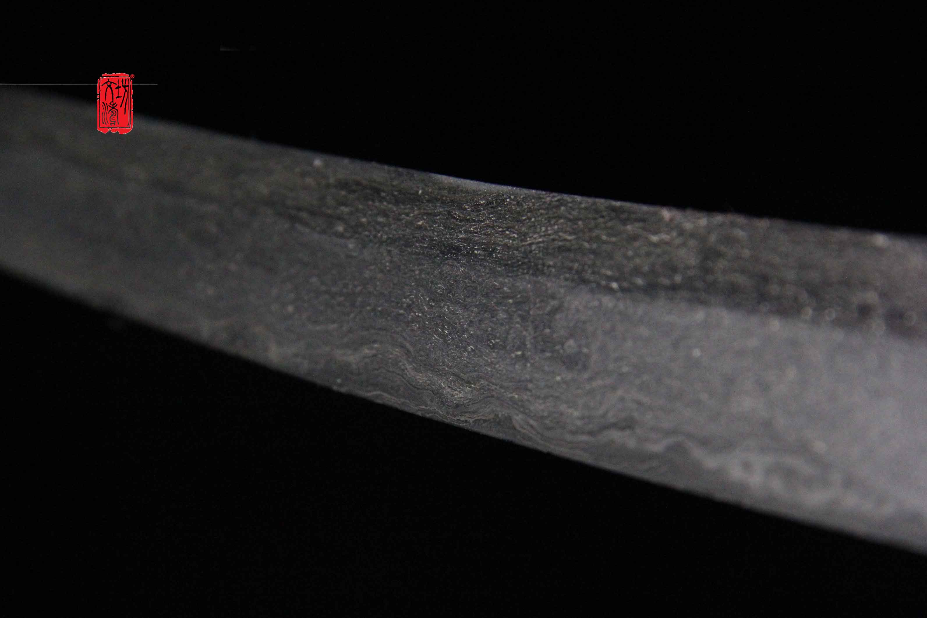此刀经文涛坊专业研磨,再现锻造纹理。花纹呈流水纹,如祥云、流水,惊涛拍岸,夹钢线明显。研磨经过整型、调直、粗磨、细磨、精研,压光、刃研六大步骤,研磨历时近半月左右,费时费力,艺术感极强,戚家刀经修复,完美再现戚继光军队的风采。