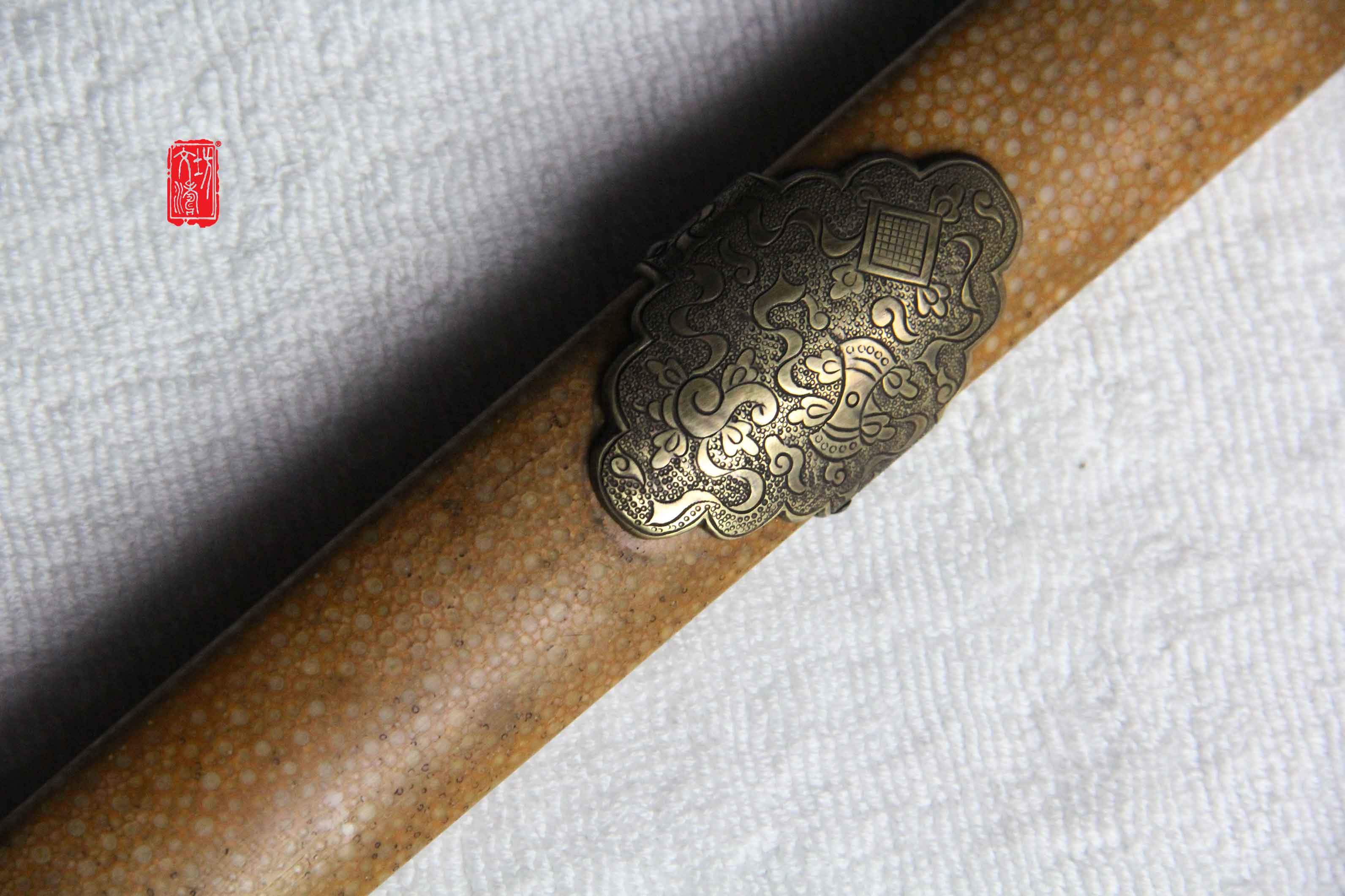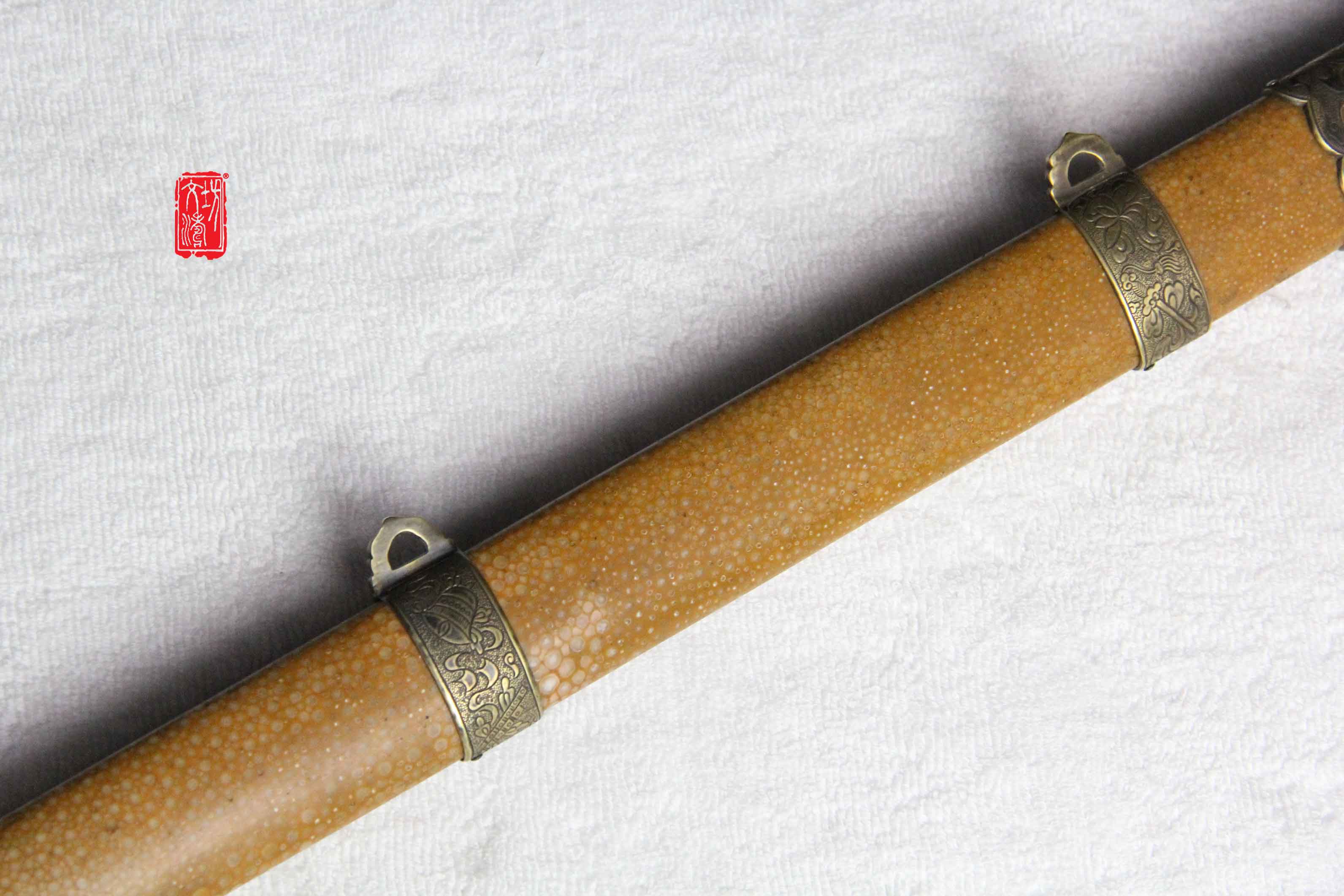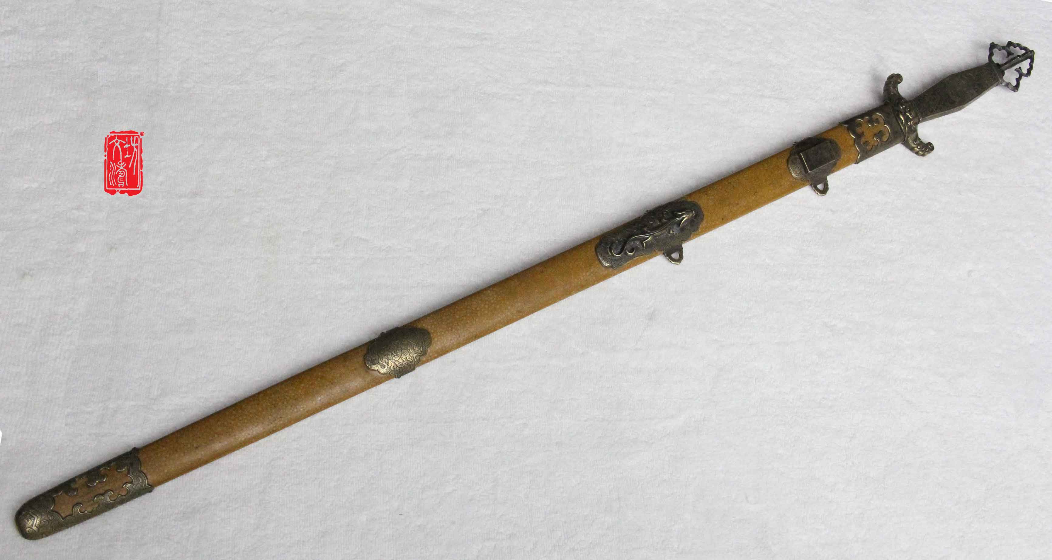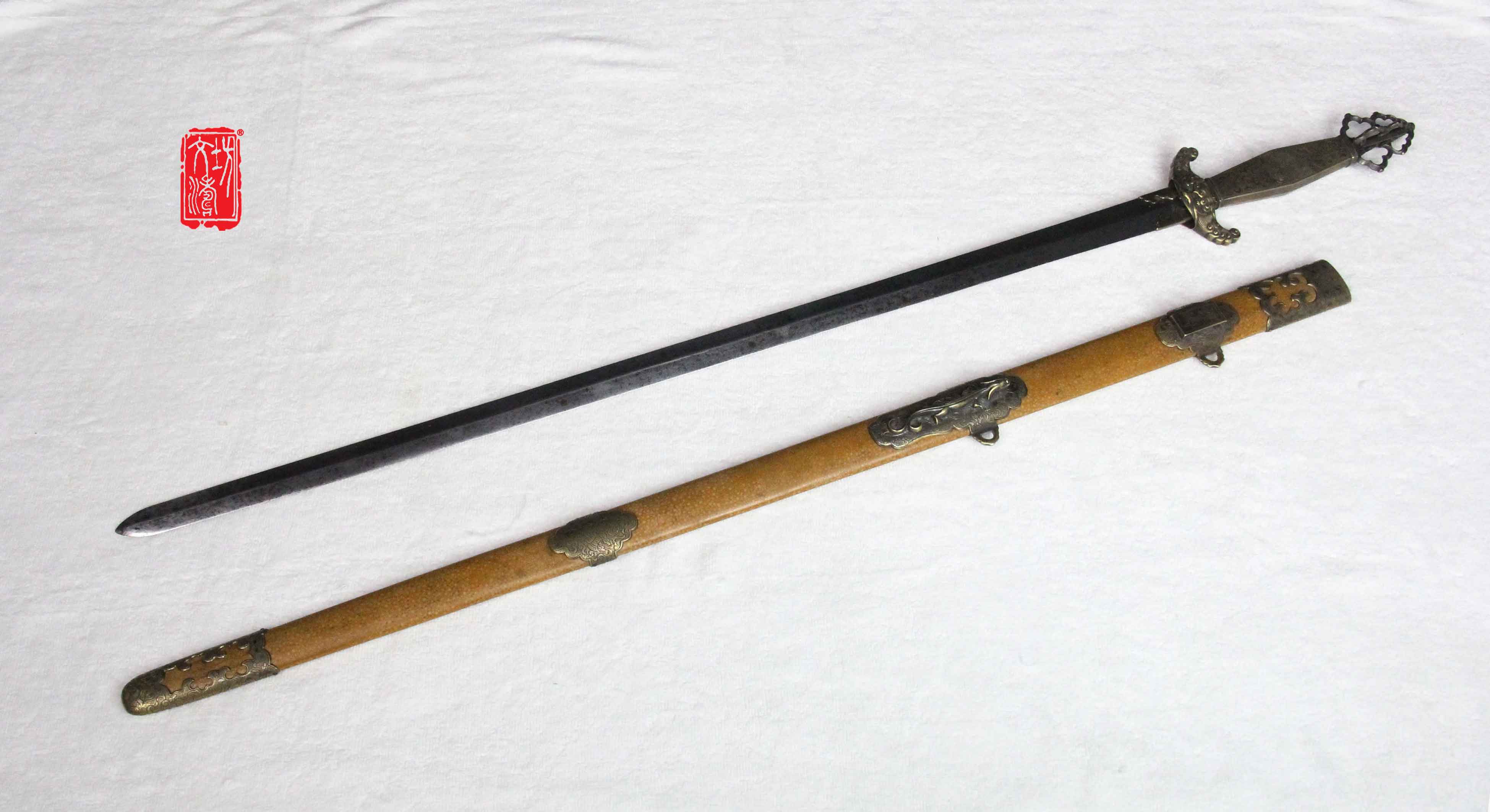 剑鞘为软木包珍珠鱼皮上黄色大漆,与原物完美结合,剑身进行整理后镶嵌北斗七星,更显剑气,此剑端庄大方,是一款不可多得的文房佩剑,收藏佳品。