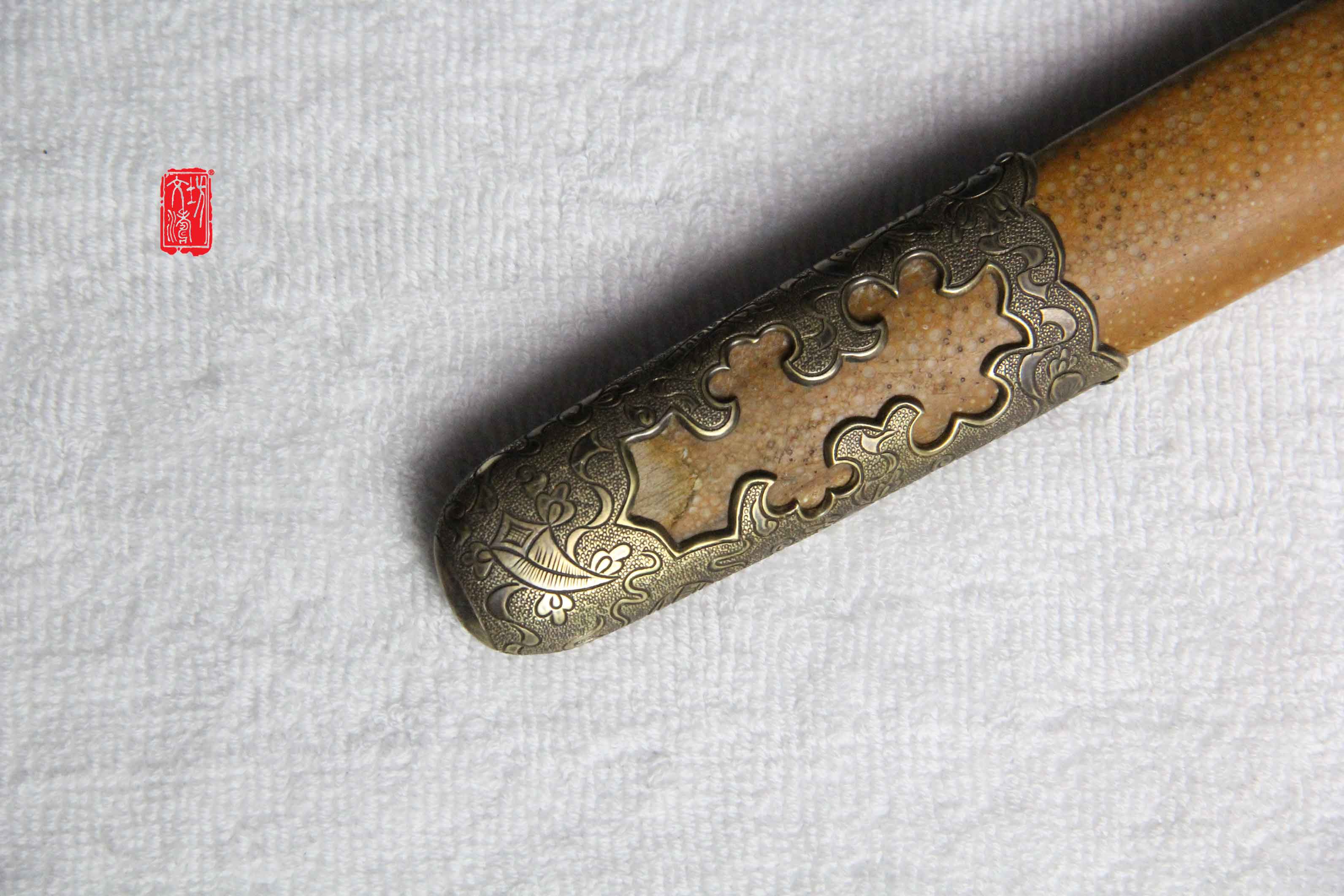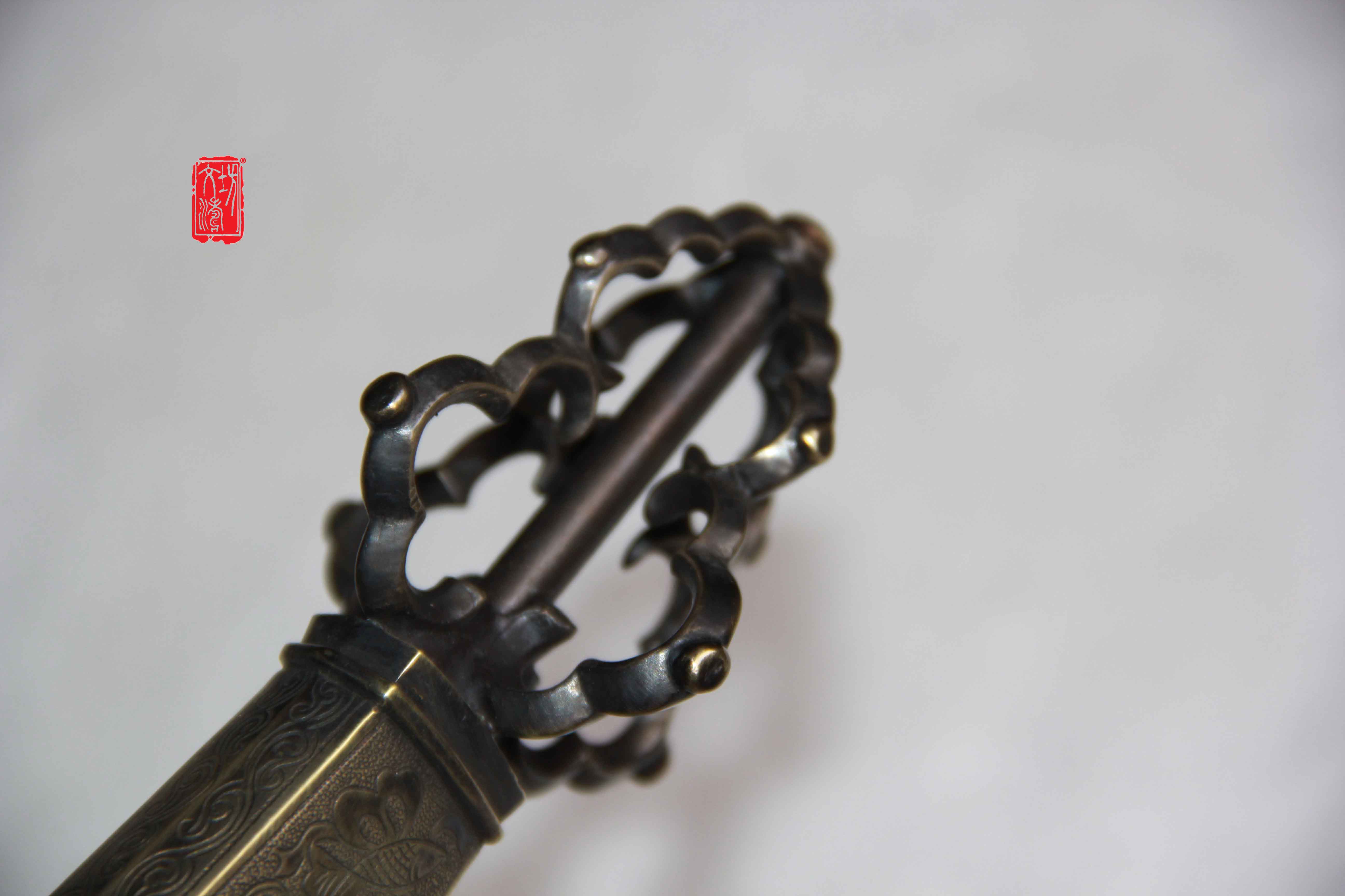 剑根据原物风格配柄首、鞘口、鞘尾,手柄缠绳、卯花,剑铜装阴刻开光团鹤,杂八宝 ,寓意吉祥、长寿,柄首为铜雕法杖,可驱一切烦恼。护手浮雕睚眦,剑装提粱部位篆刻乾坤,中间为卧一螭龙,整体剑装雕刻生动细腻,铜装做旧后盘磨,具有当时风格。