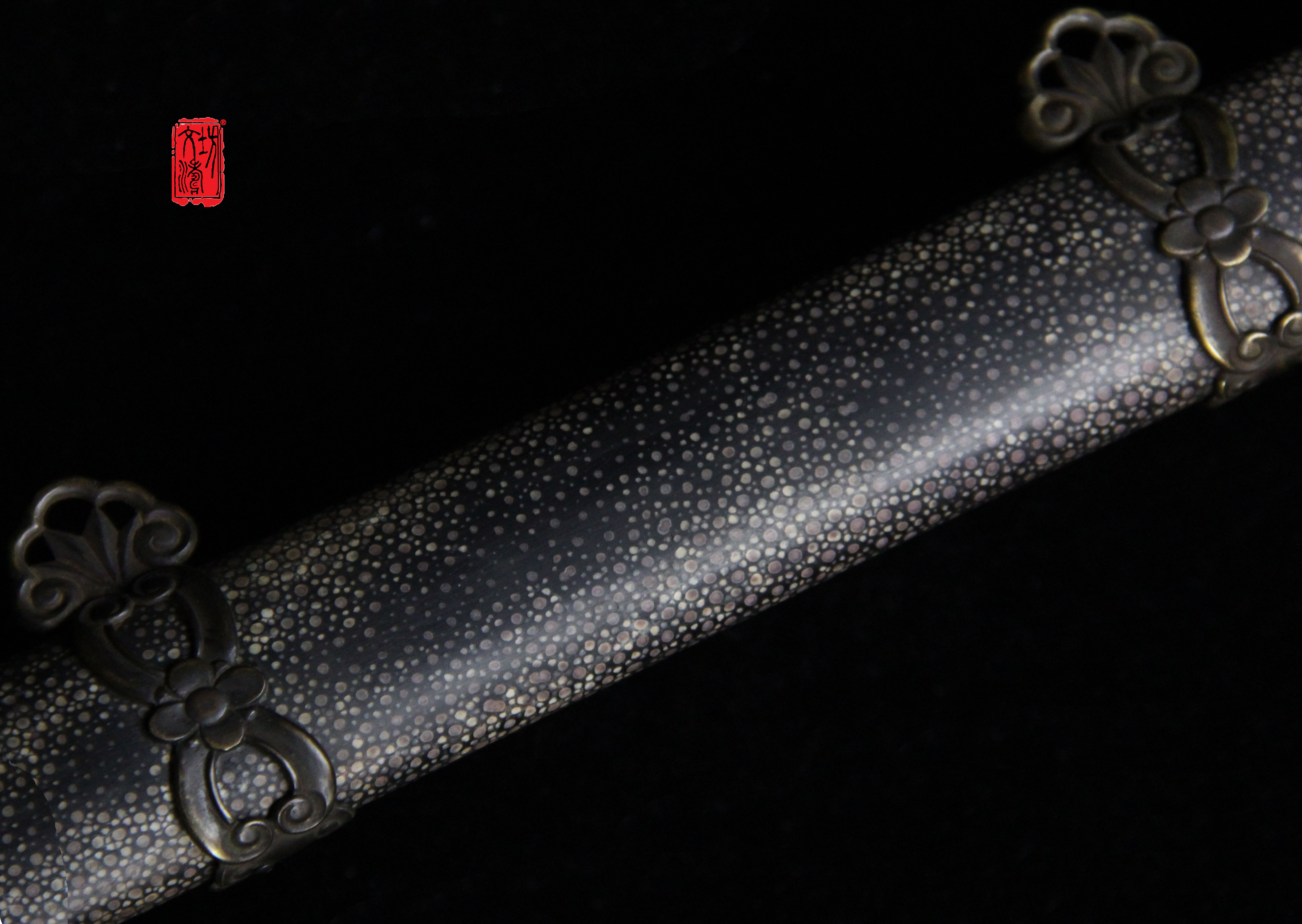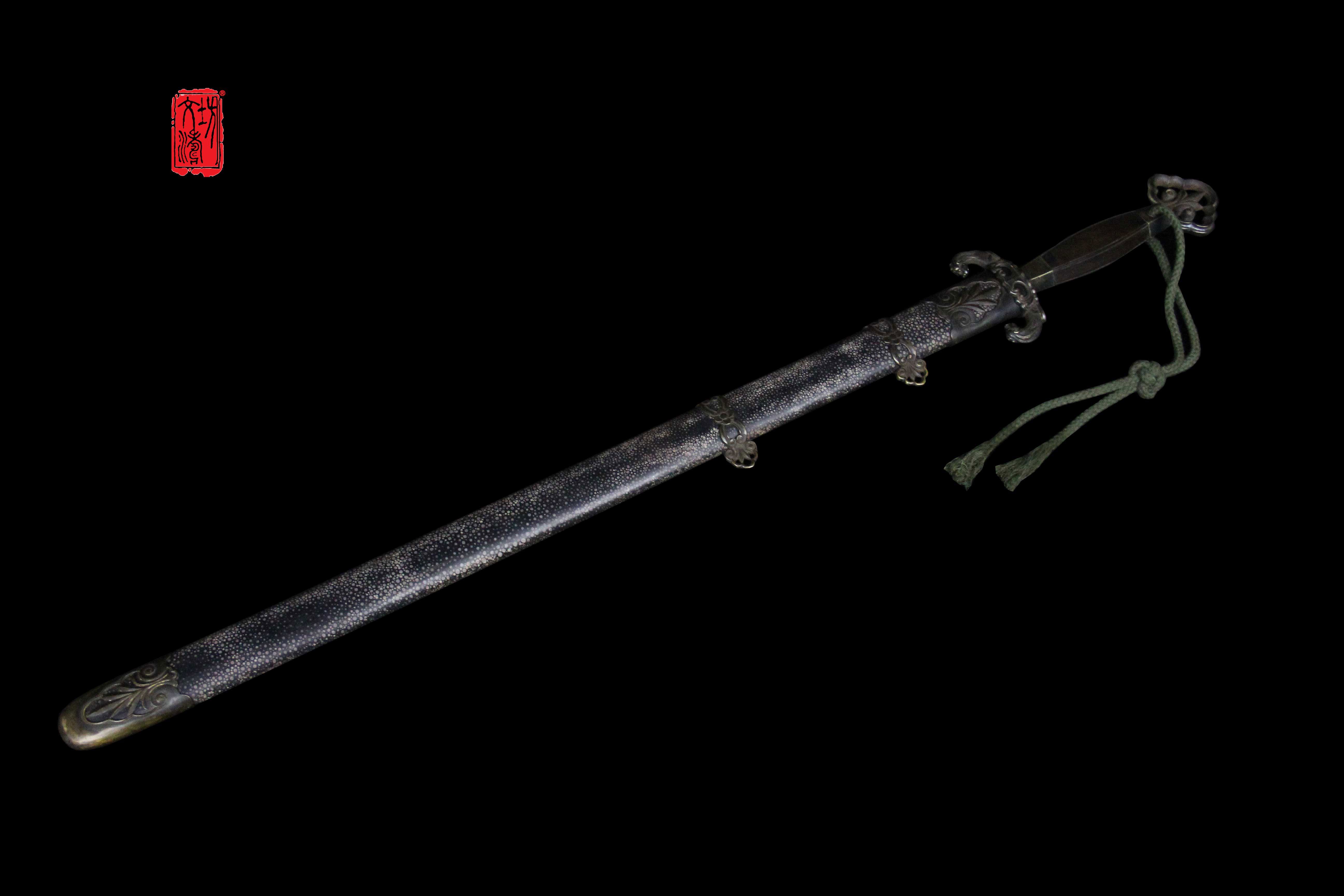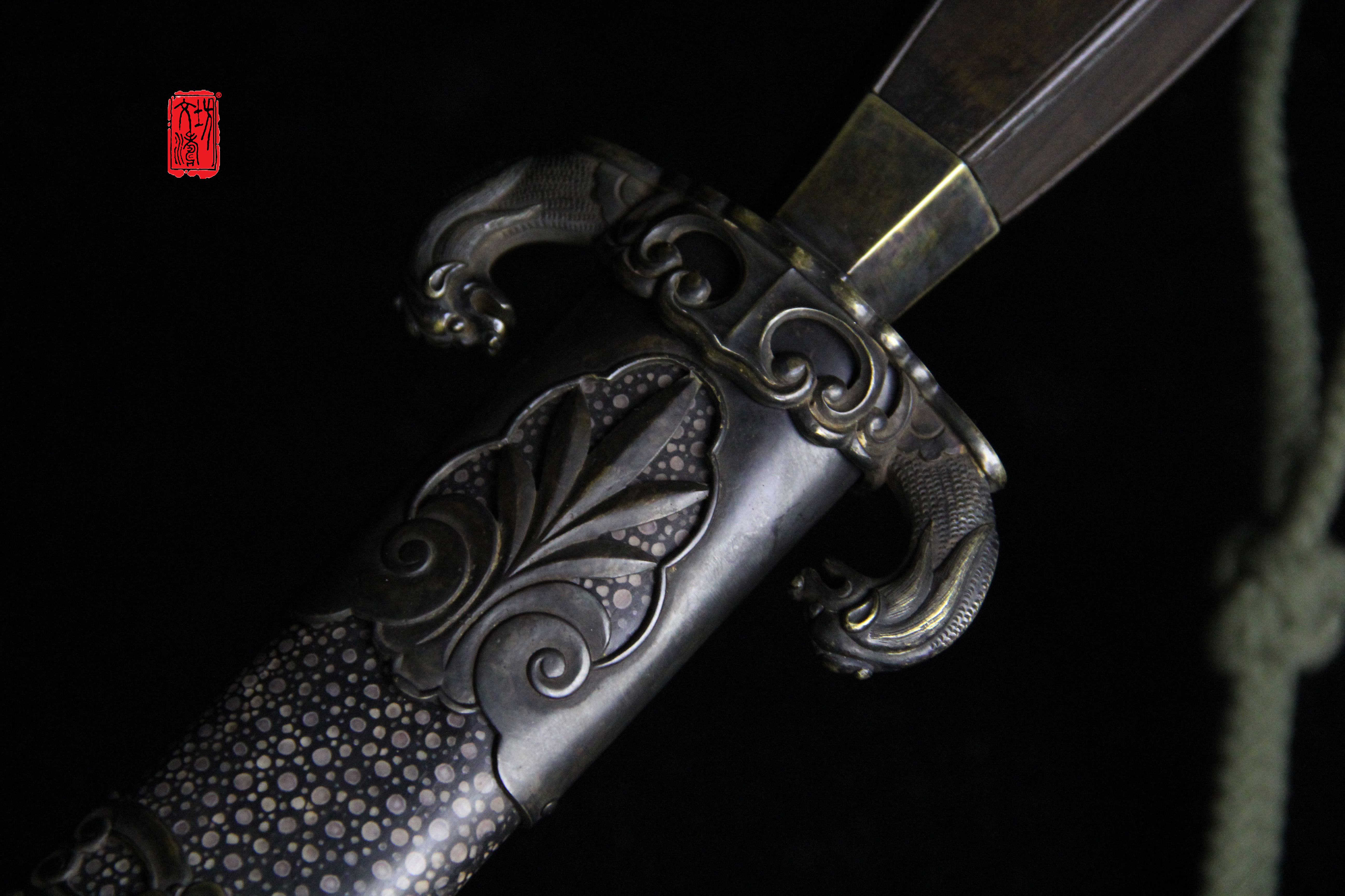 柄首为如意造型(灵芝纹饰),剑格手工雕刻双兽,鞘口与鞘尾是镂空兰草纹饰,提梁为灵芝(如意)相连箍,设计具有文人气息,全装完工后整体做旧,更显古韵。剑鞘软木外包珍珠鱼皮上黑漆。
