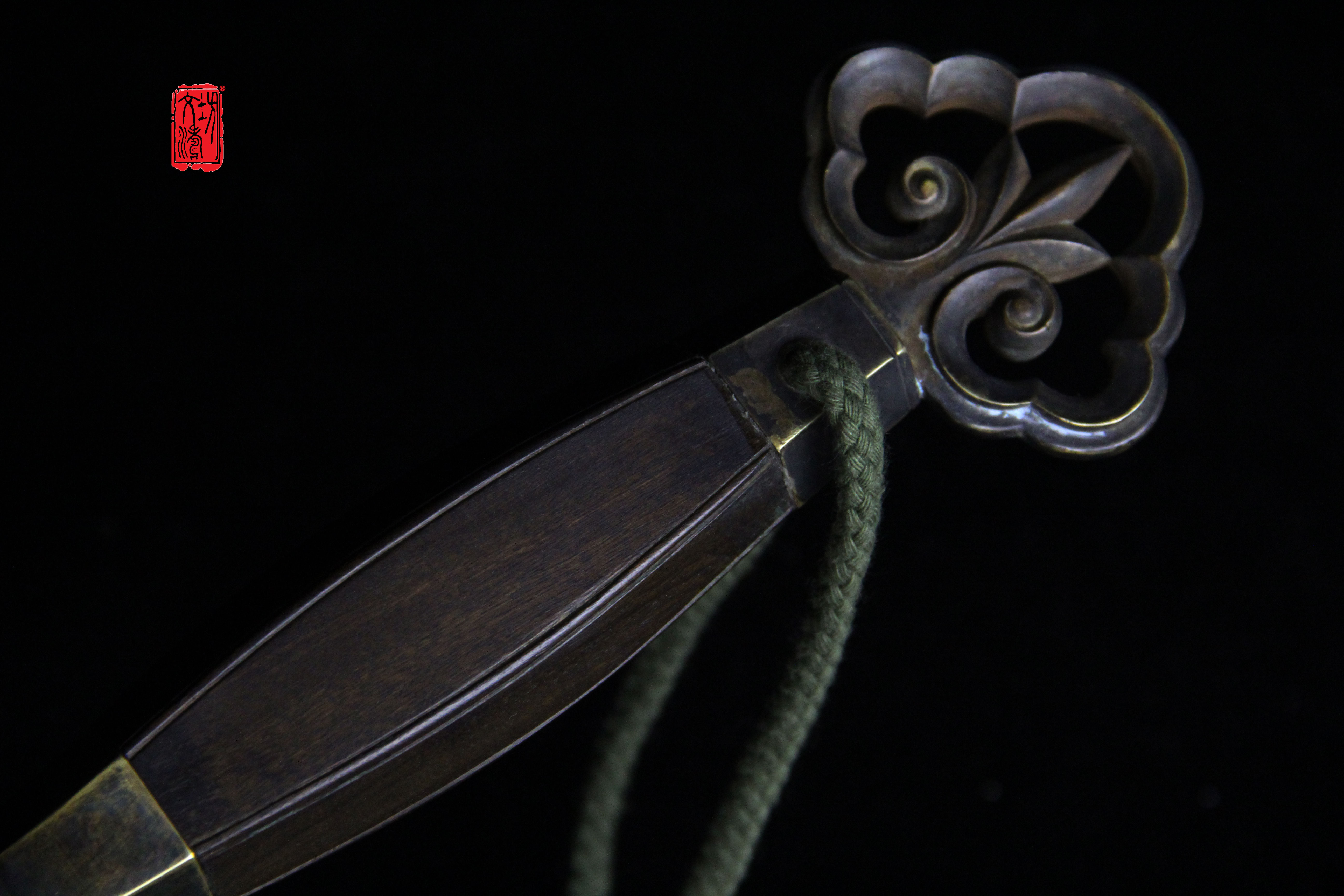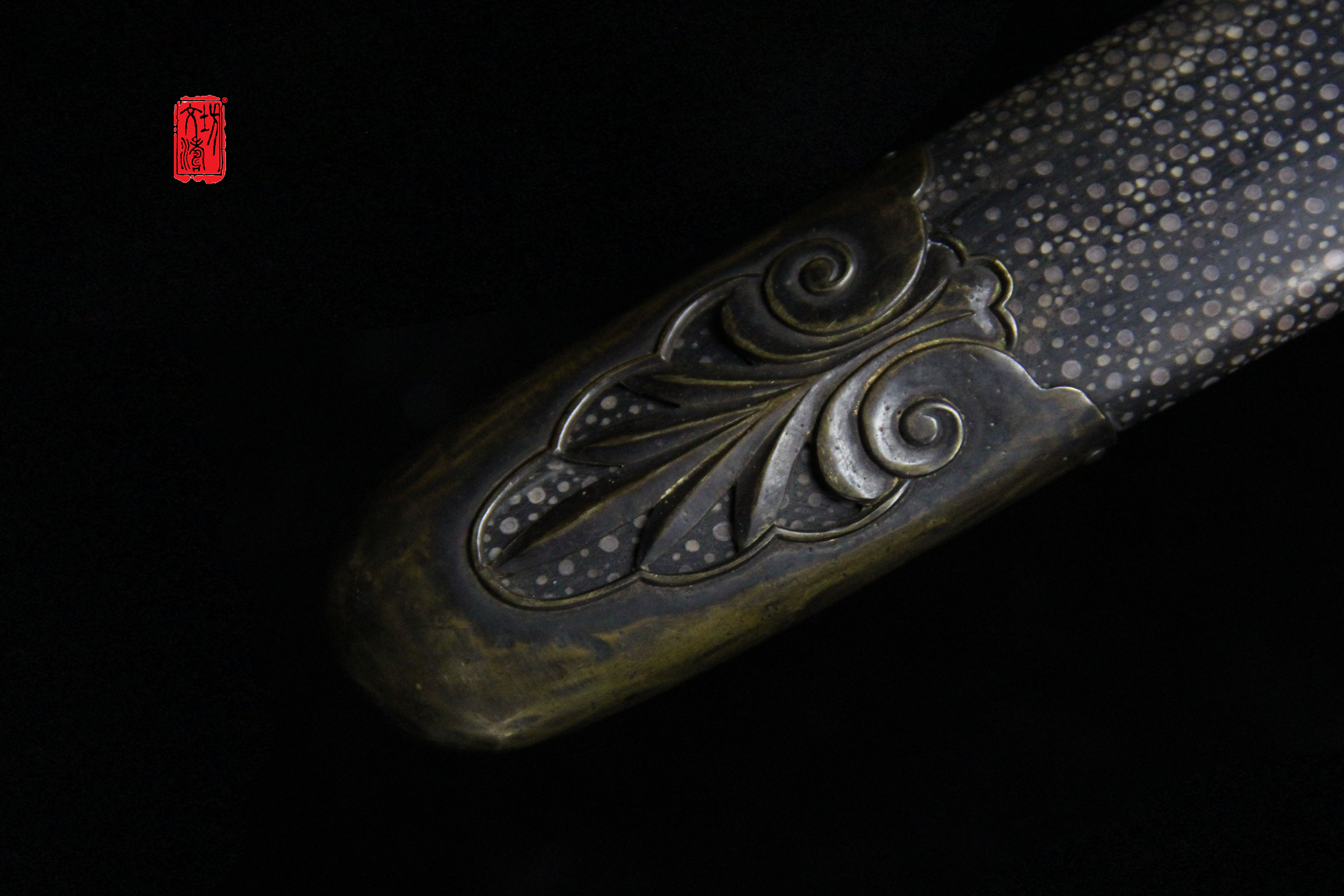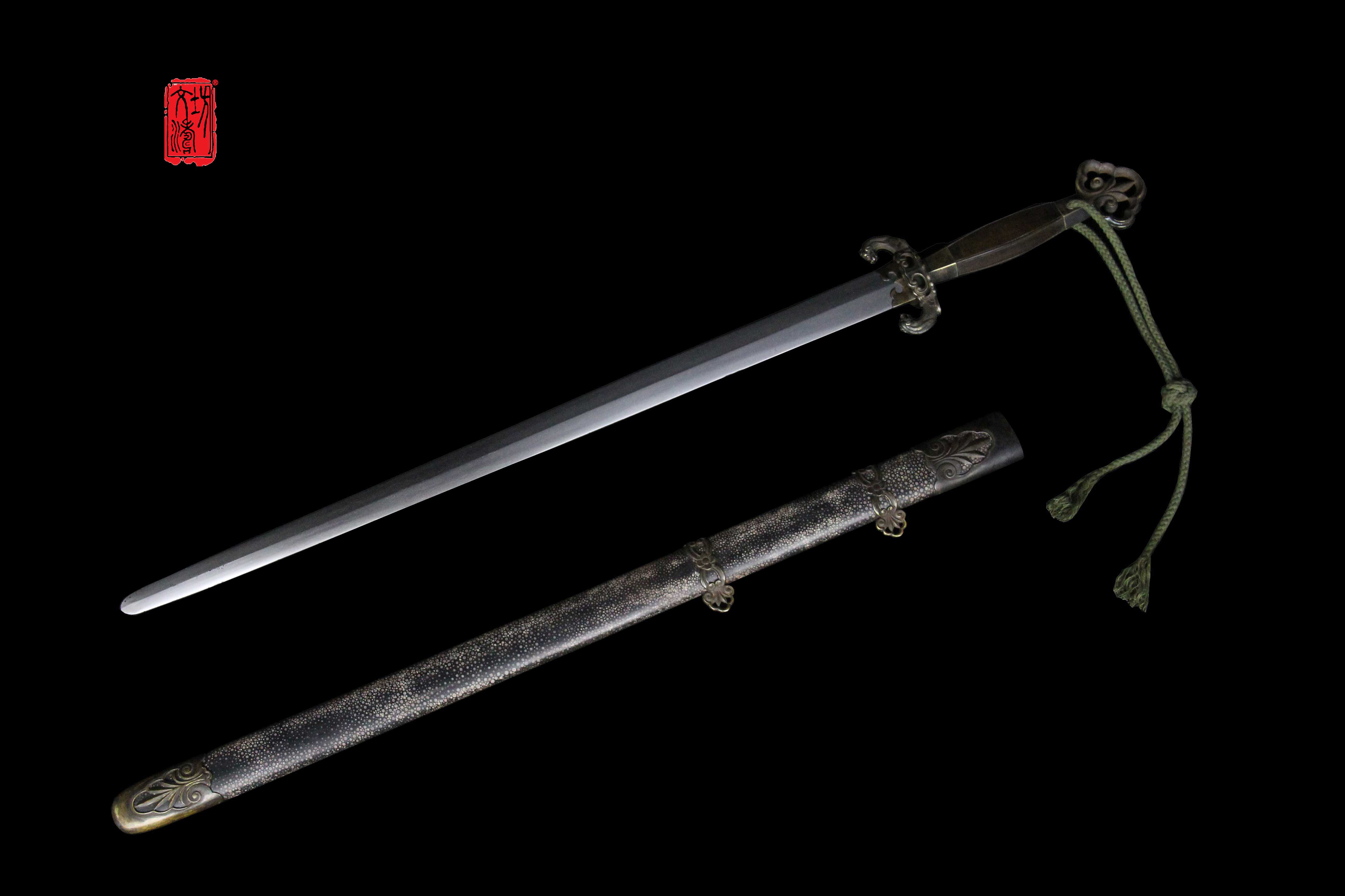 柄首为如意造型(灵芝纹饰),剑格手工雕刻双兽,鞘口与鞘尾是镂空兰草纹饰,提梁为灵芝(如意)相连箍,设计具有文人气息,全装完工后整体做旧,更显古韵。剑鞘软木外包珍珠鱼皮上黑漆。