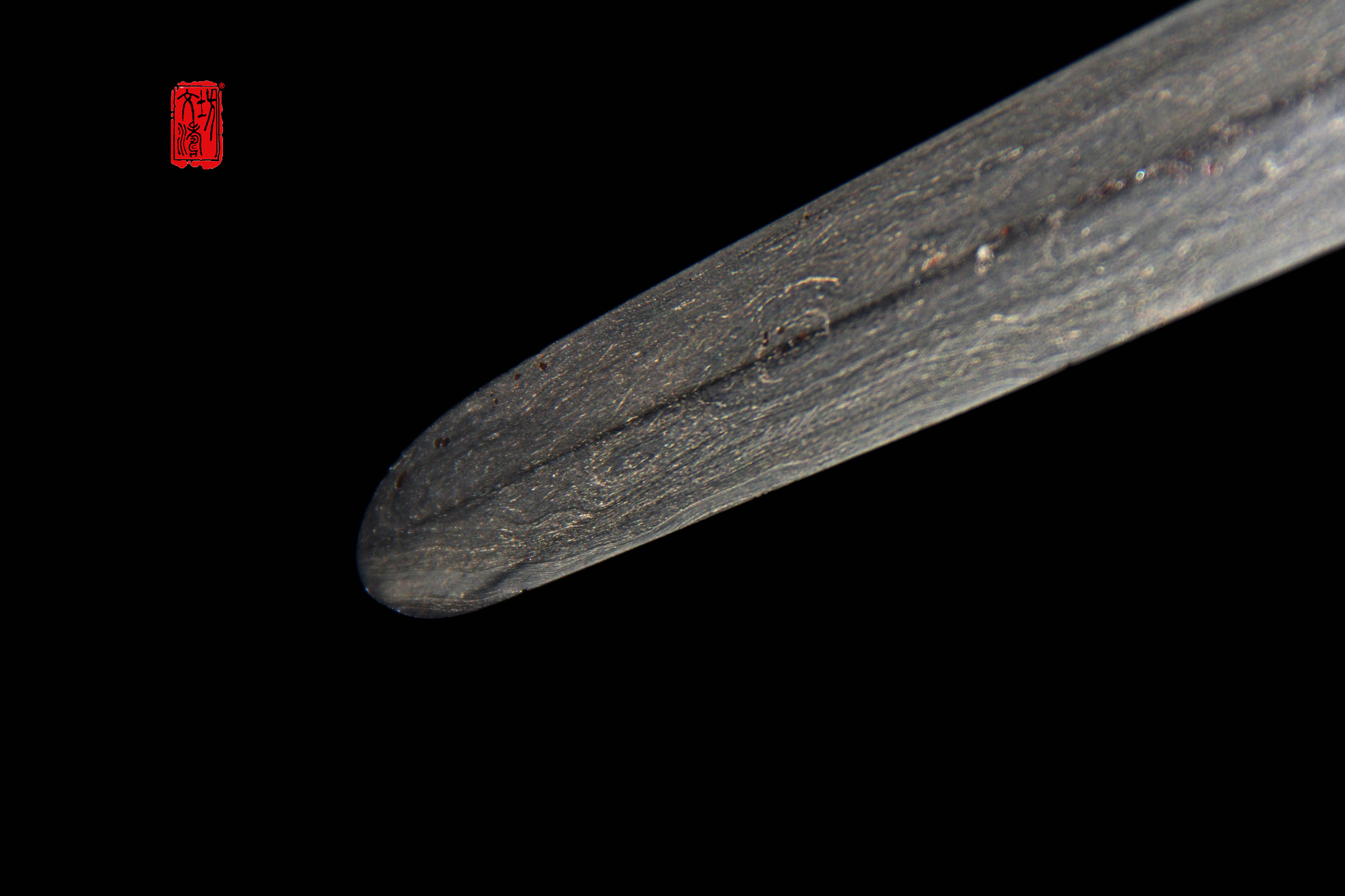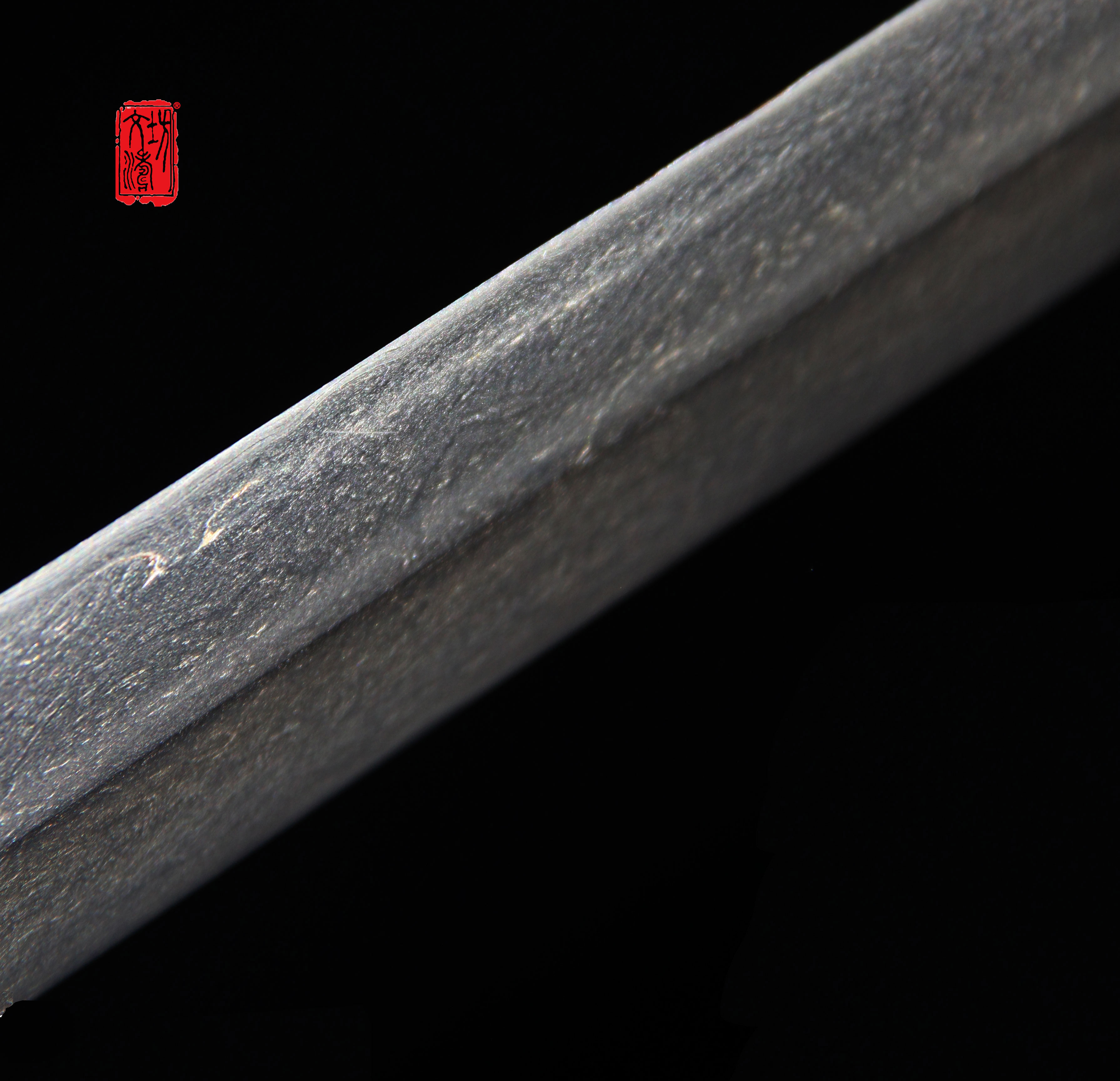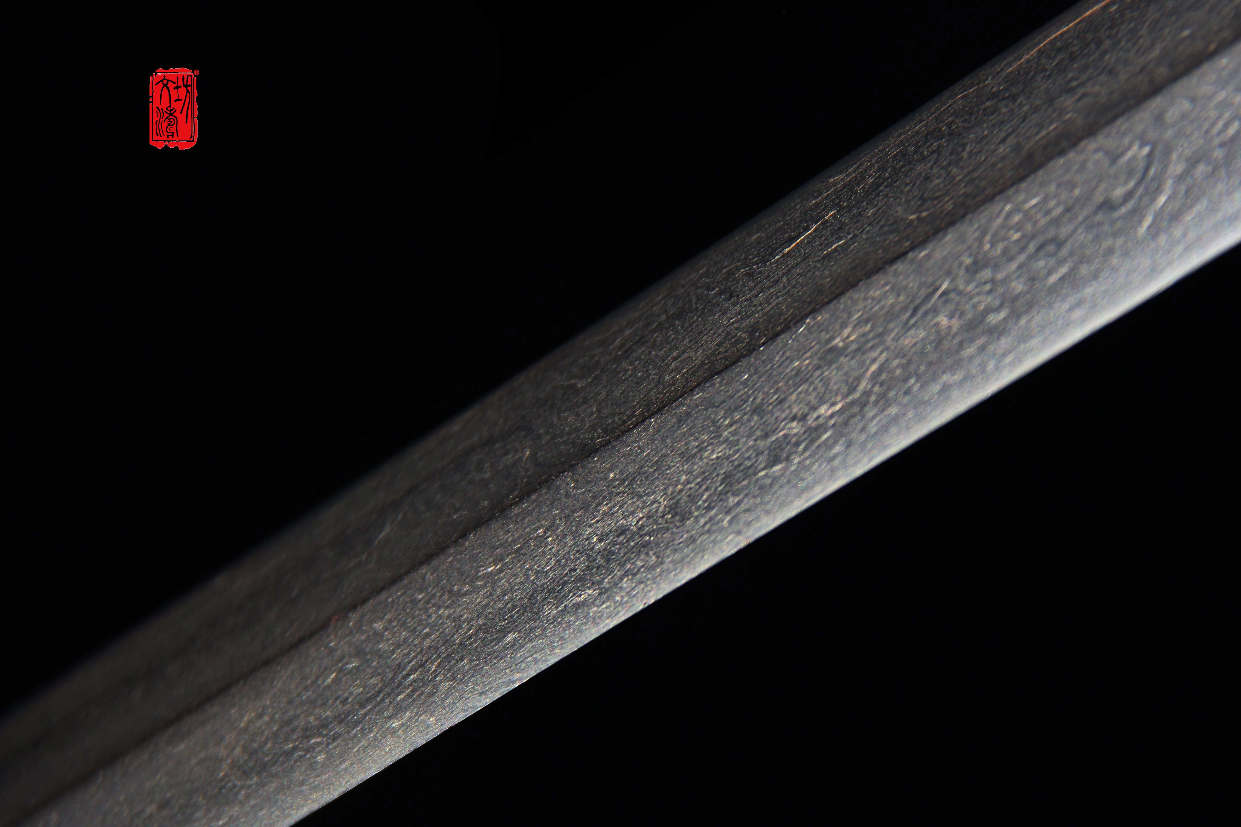 剑身经整形、粗磨、细磨、精磨,历时近一百小时研磨而成。研磨后,锻造肌理细腻,花纹如繁星、祥云、绚丽多彩,体现极高研磨水准与艺术价值。夹钢线清晰,上手后手感极佳,且厚重。