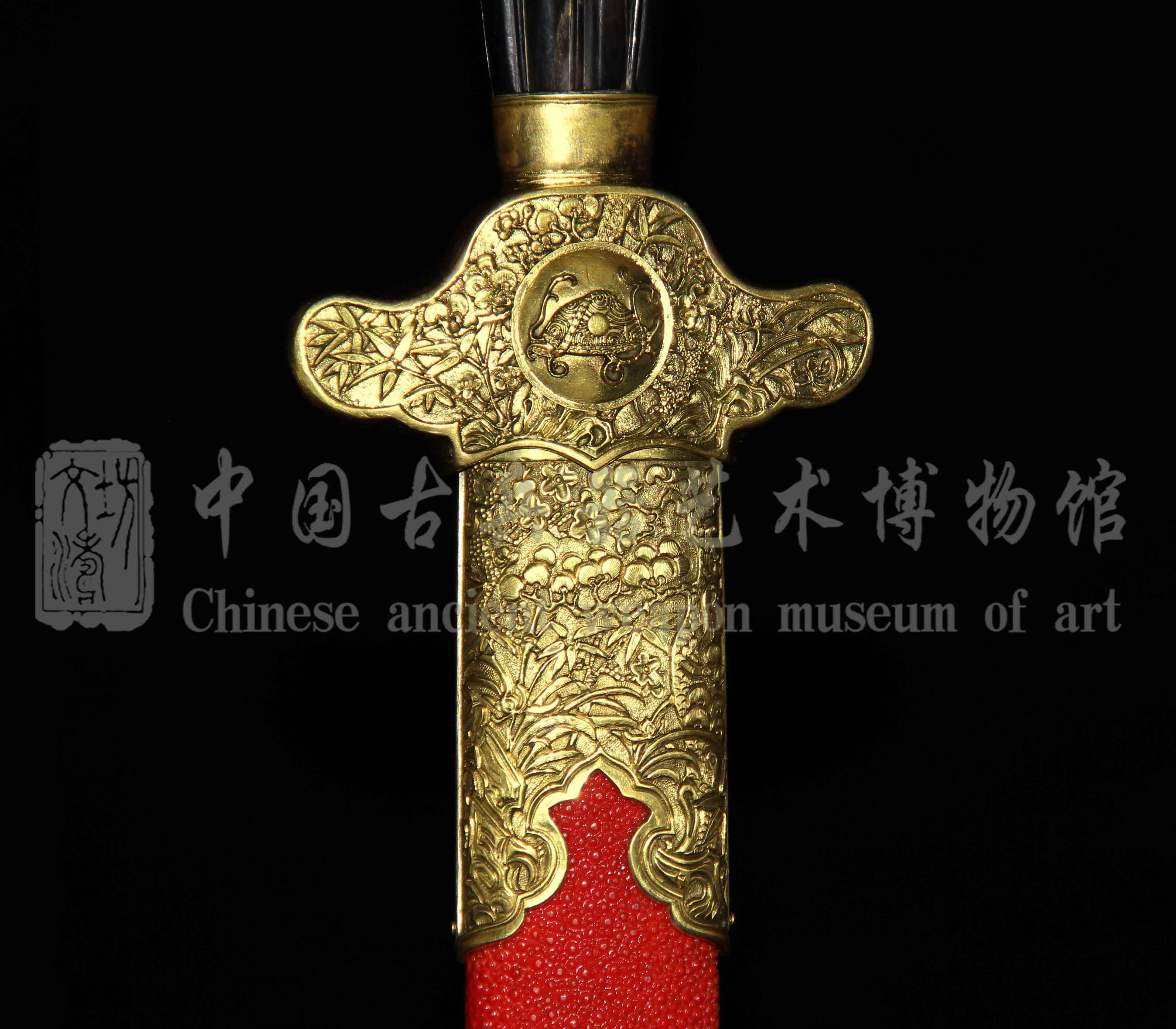 剑装高浮雕刻岁寒三友:松树、傲竹、梅花,底部打鱼子底。手工雕刻生动形象,栩栩如生。岁寒三友凸显了剑主人不畏严寒的高洁品格形象。意喻梅花香自苦寒来,傲竹不屈世间难,亦可感到有君子之风贯穿期间。这便是此剑:傲世君临之来意,寓意佩此剑者,乃人间君王,品质不凡。
