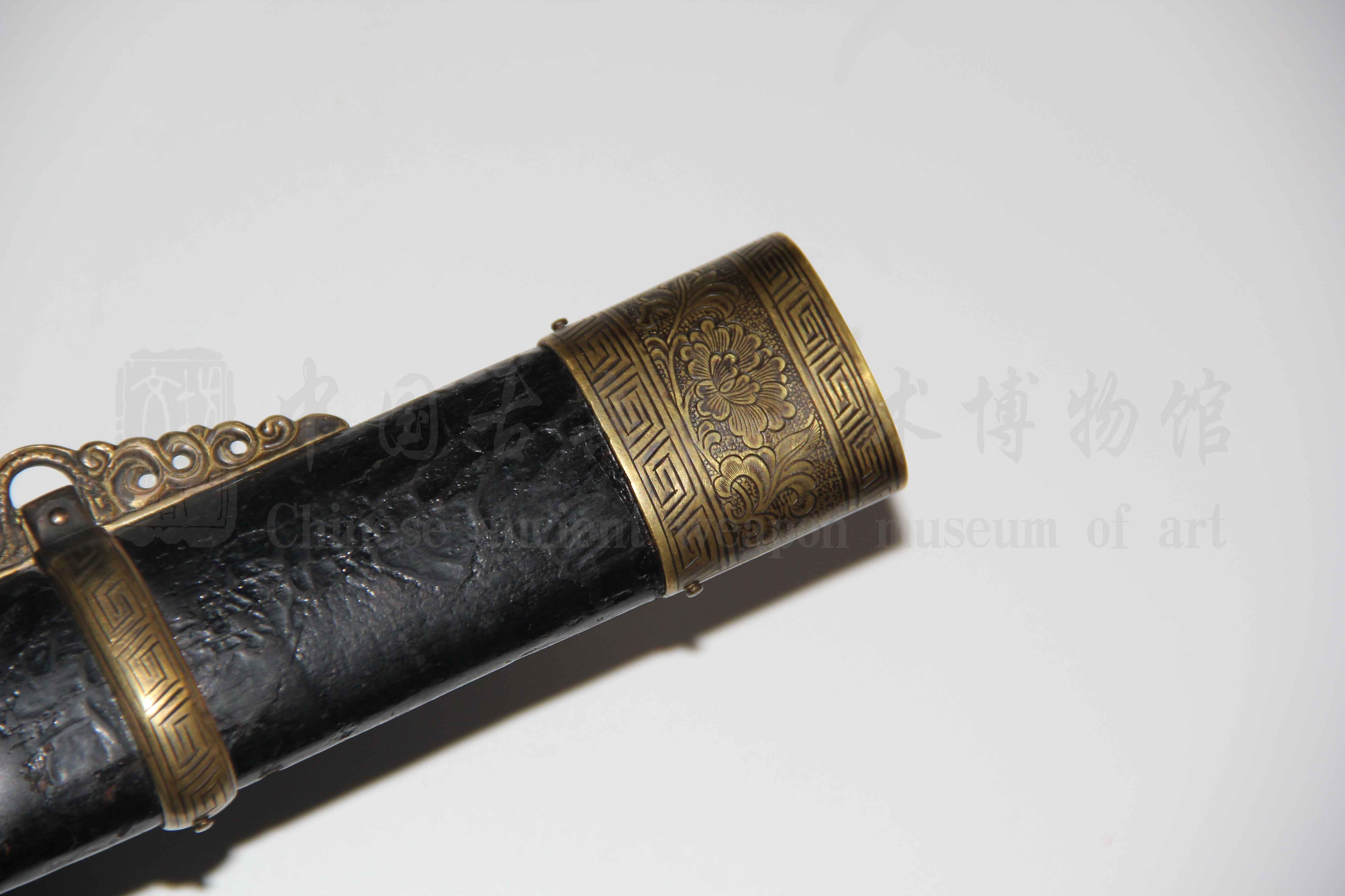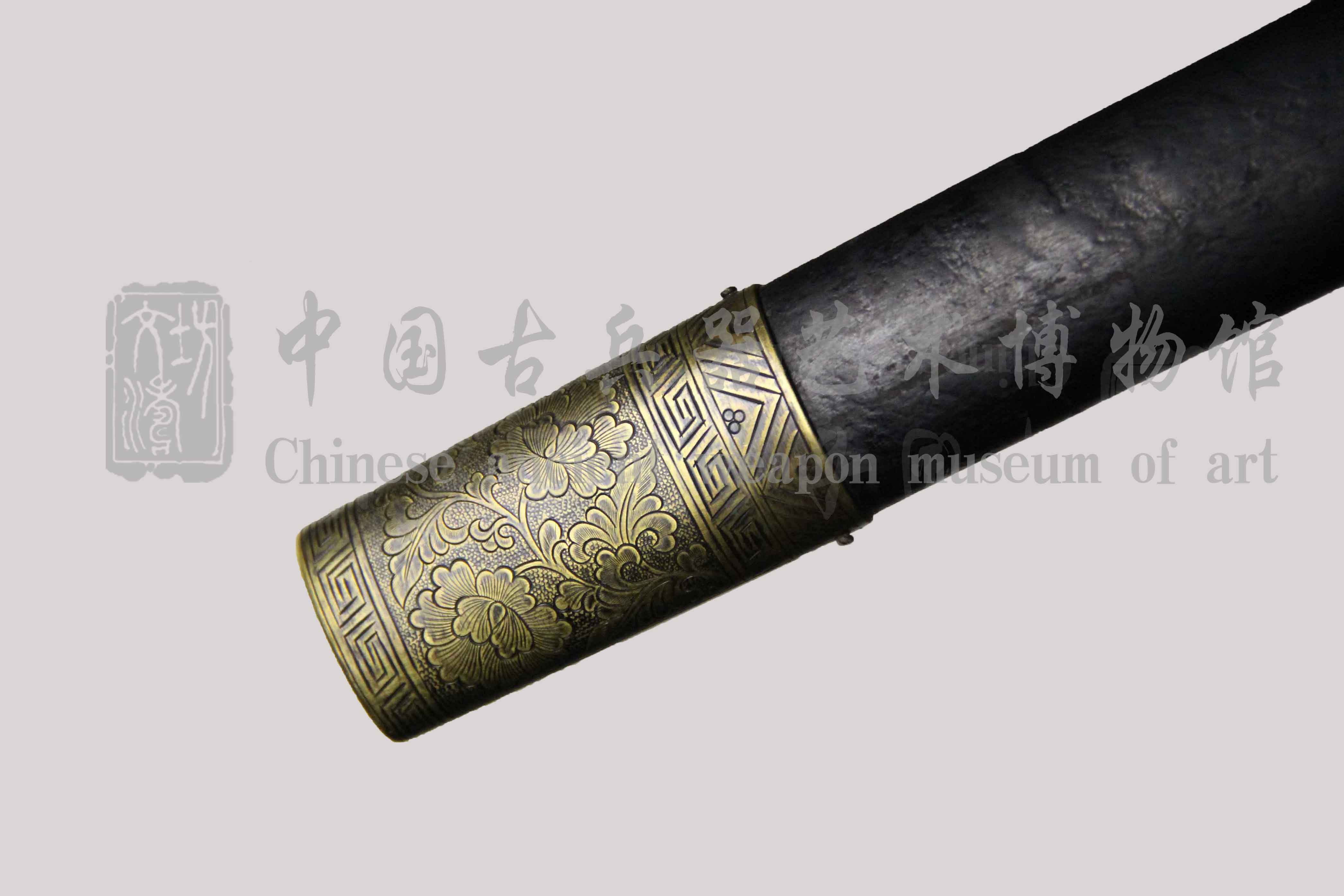 刀装参照中古时期风格编排、绘制纹饰进行配装,阴刻牡丹、回字几何纹环绕,纹饰线条细腻,栩栩如生,刀卡按照图谱纹饰设计制作。