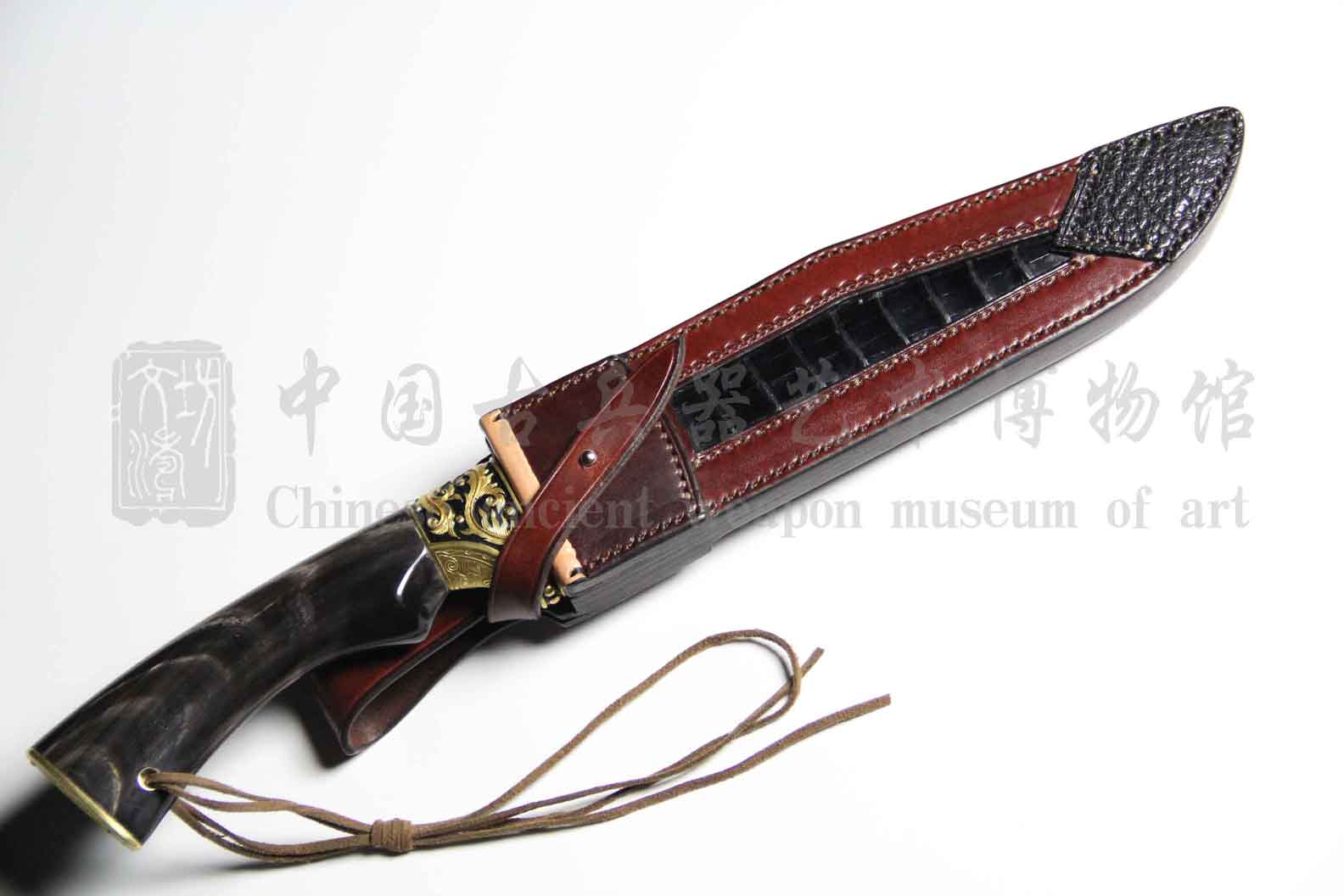 刀鞘材质鳄鱼皮,手工缝合,于刀身完美结合。为防止刃部划伤,特制内衬羊皮保护刀刃。