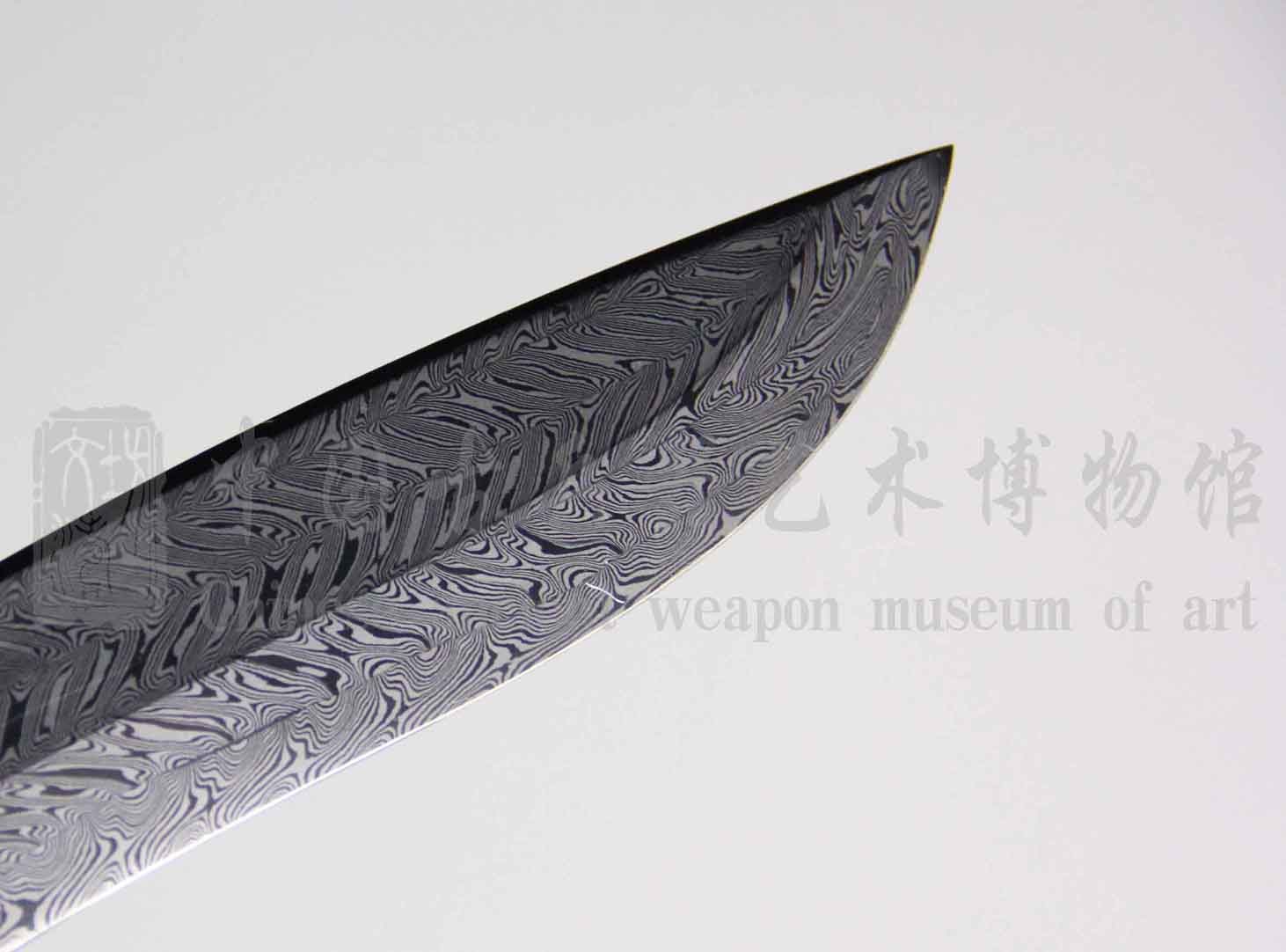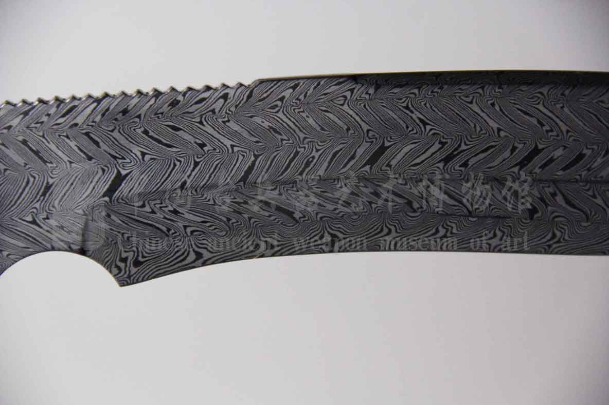 刀身为文涛坊沿用古法,手工折叠锻打而成旋焊纹。花纹自然、如羽毛、如指纹,如手绘于刃部、排列有序,体现极高锻造技艺。子夜淬火、硬度极佳,艺术与实用完美结合。