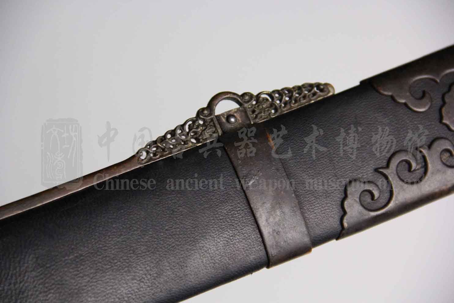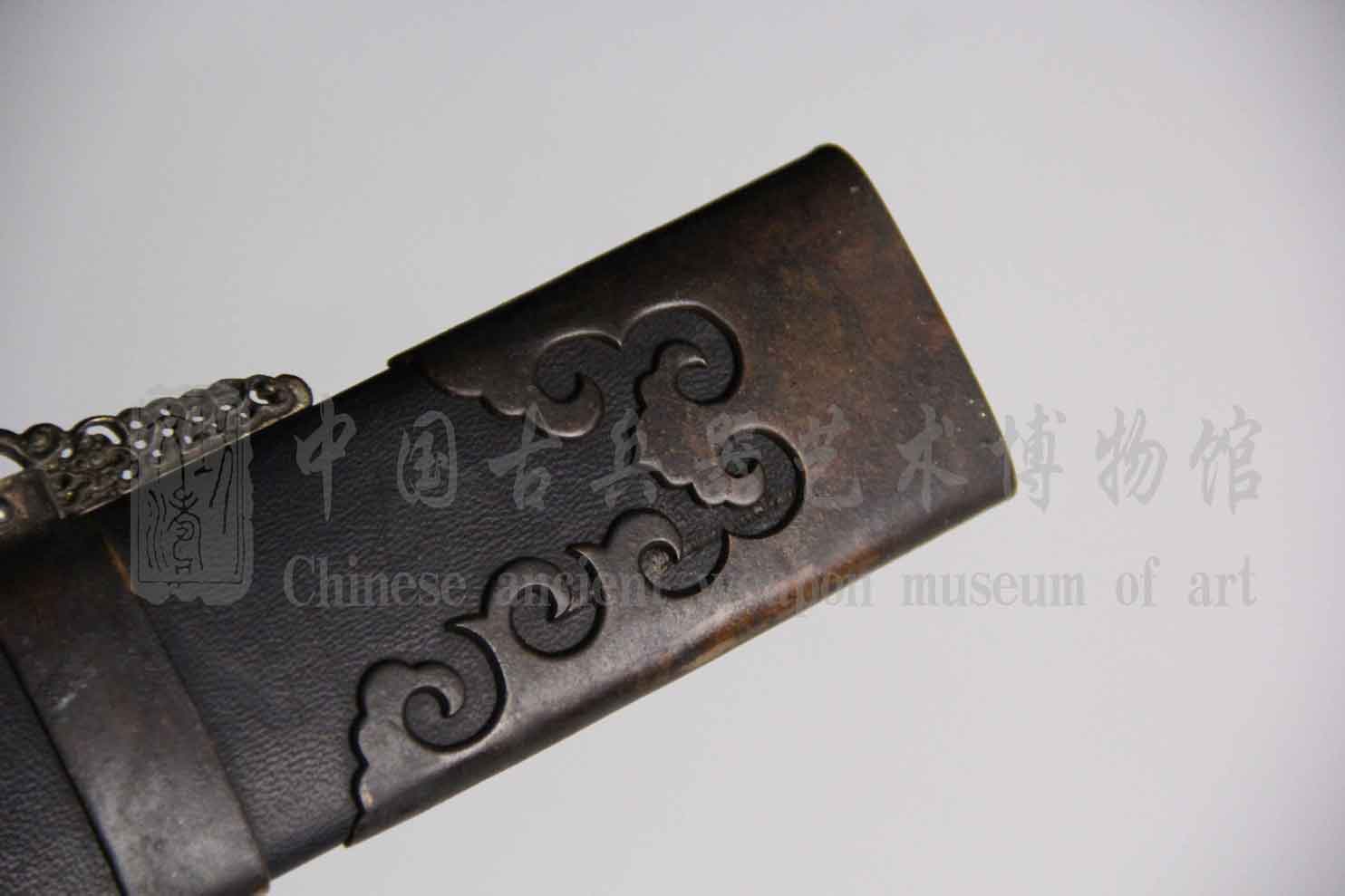 根据原物风格配素铜装柄首、柄箍、护手、鞘口、刀卡、提梁、鞘尾,整体做旧、盘磨,包浆圆润自然。
